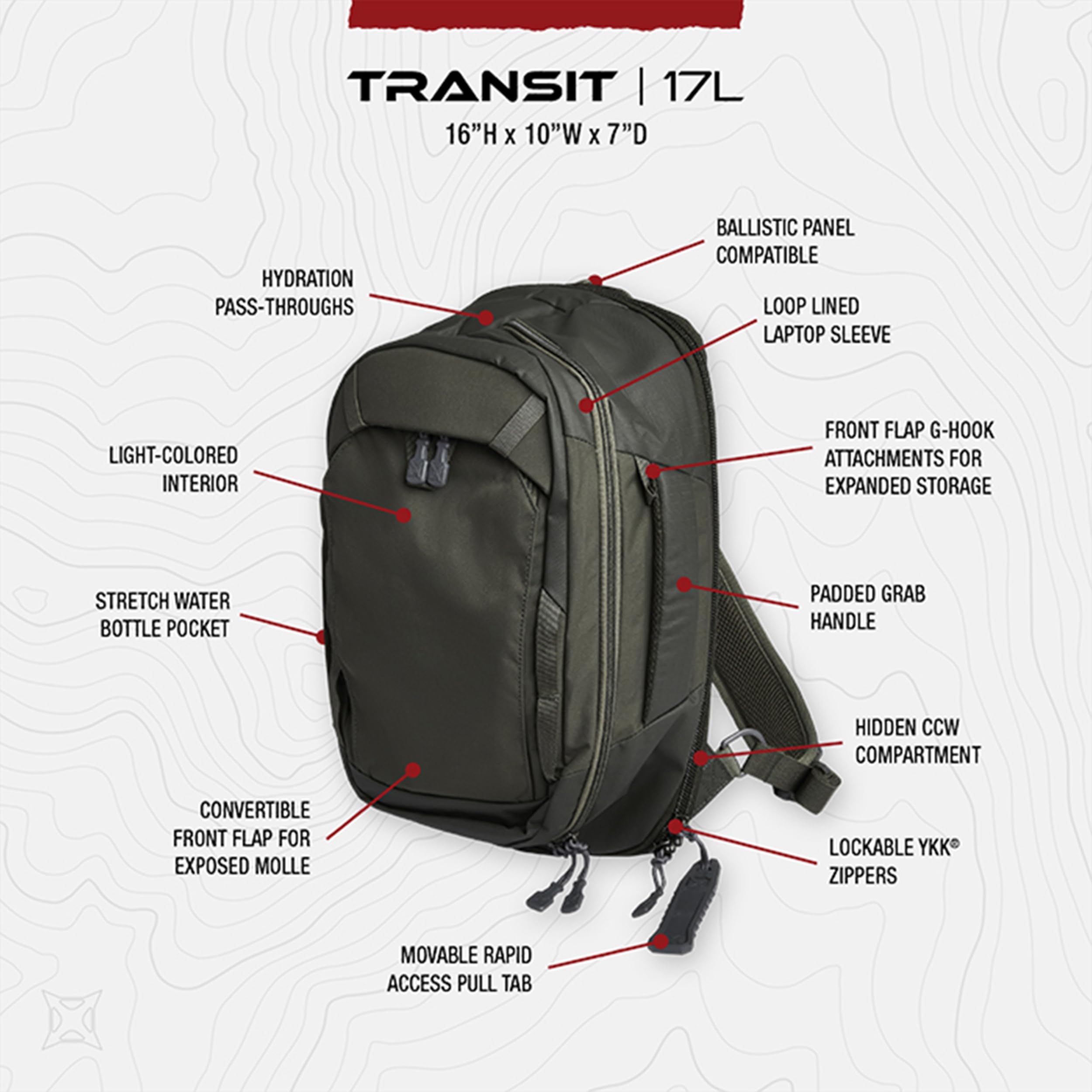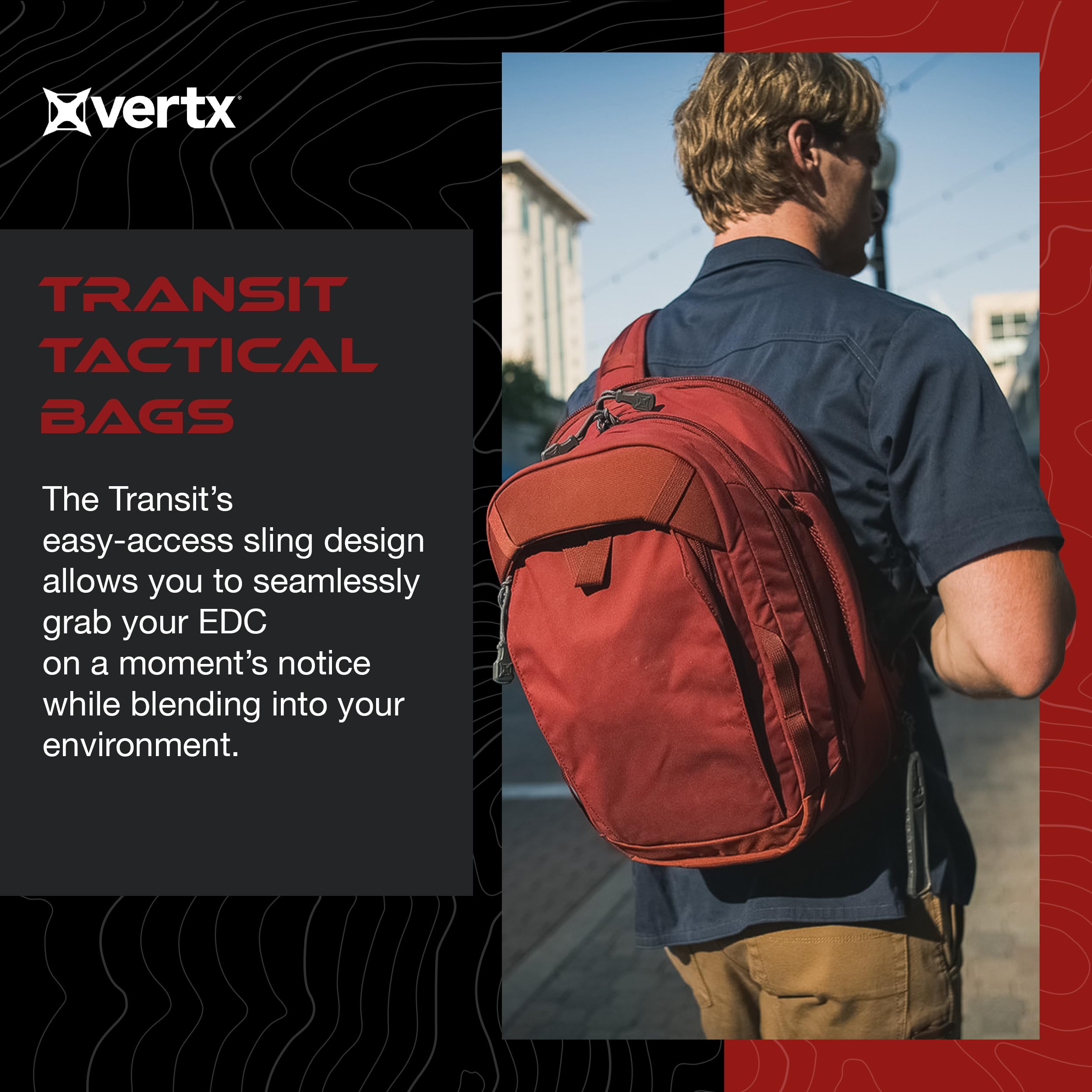STREAMLINED DESIGN – The NEW Transit tactical bag features a floating back panel for added space in either the rear or main compartment. Blending professional into everyday settings, with an attractive sling attachment for comfortable carry.