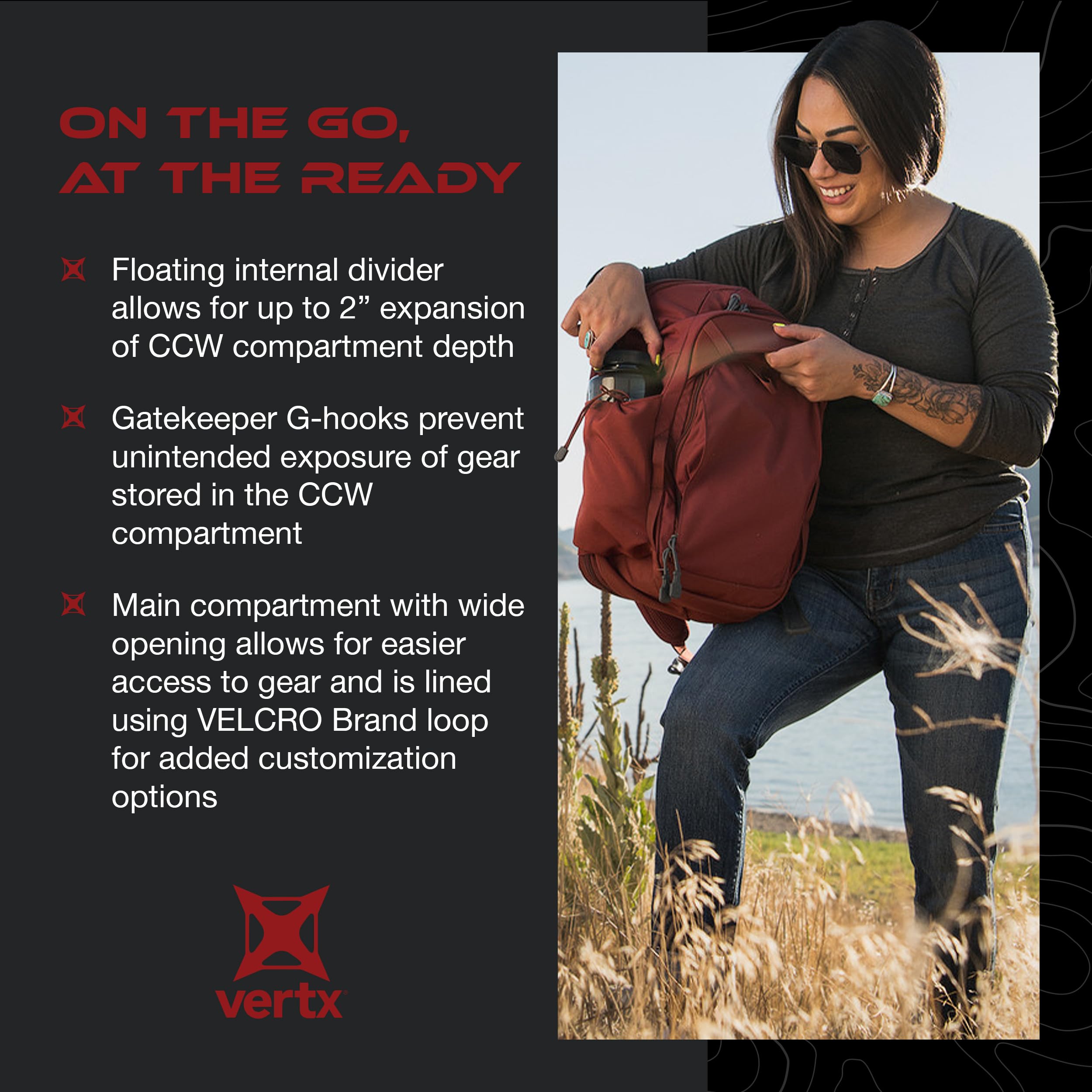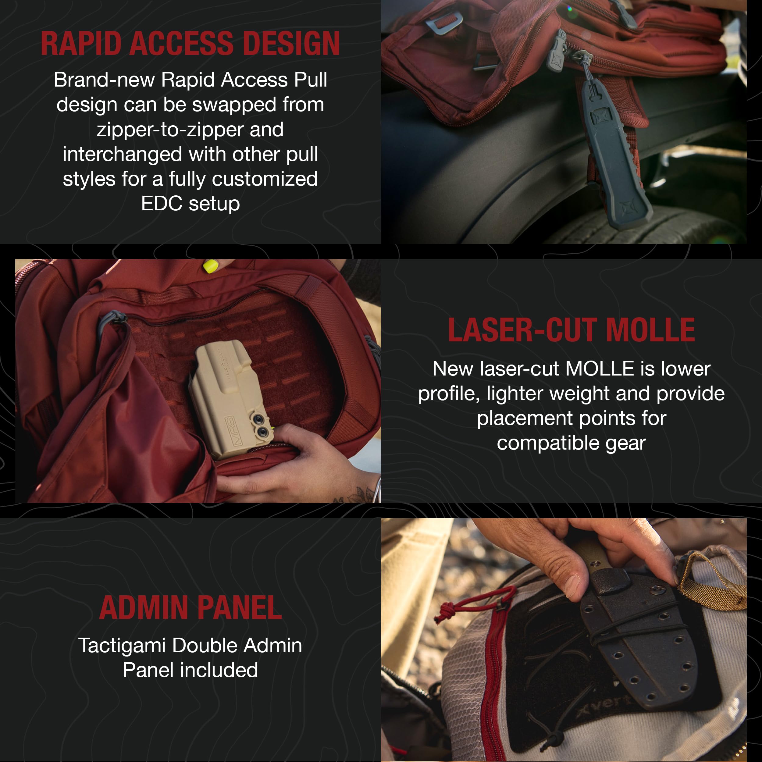 QUICK ACCESS TO YOUR EDC – This tactical backpack features a weapon-compatible concealed carry platform with a Rapid Access Pull tab. The concealed carry platform accepts ballistic panels.