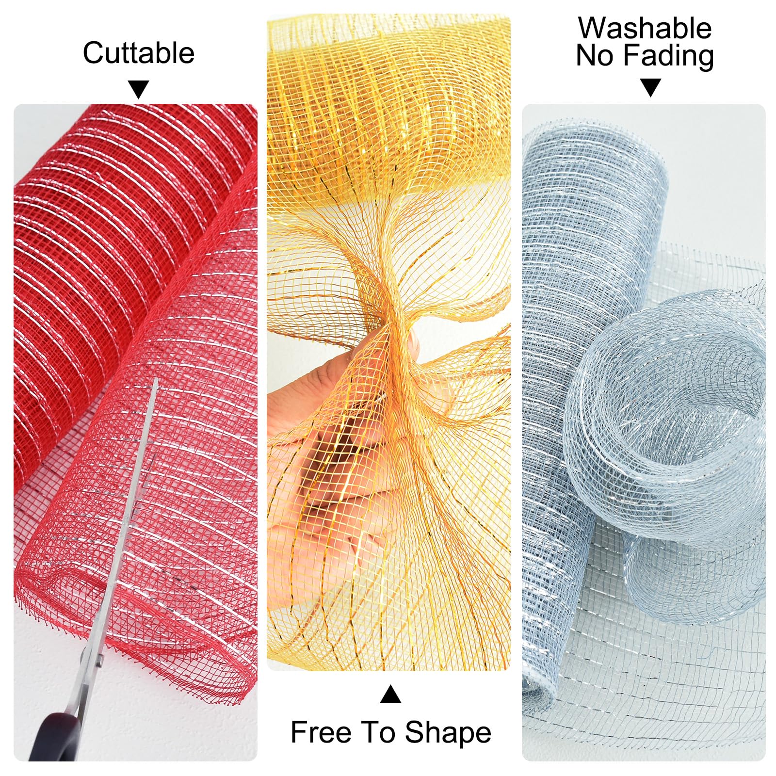 TONIFUL - Decorative Mesh Ribbons TONIFUL is committed to providing various high-quality ribbons and party decorations. Our ribbons perfectly combine softness and luster with bright and vibrant colors, allowing you to express your thoughts perfectly! OCCASION: Perfect for making decorative festive wreath and bow crafts. It can also be used as a feature wedding decoration on arches and aisles and can be dressed with flowers or coordinating ribbon or used to decorate your tree, create a unique tree topper and tree decoration! Vibrant colourful mesh, ideal for home decor, staircase garland making, diy crafts mesh for wreath making, wrapping fresh flowers and silk flowers, floral wrapping mesh, wrapping, packaging and gift baskets. Perfect for all holiday decorations: Thanksgiving, Halloween, Christmas, New Year, Valentine's Day, St. Patrick's Day, Easter, Patriotic Day, and various parties. Features: This decorative mesh is a waterproof, durable fabric. Deformable, able to create the shape you need at will. Beautiful sheen.Washable, Non-shrink, Color-fast. Product Specifications: Material: Mesh Length: About 10 Yards (30ft) /roll Width: 10 Inch/roll Color: Various Style: Non-Metallic/Metallic Foil/Metallic Stripe Solid color style/ Festival color style/ Combination color style Available in 1/2/3/4 Rolls 【Notes】: 1.Please allow a slight dimension error due to manual measurement. 2.The winding risk may exist, please keep away from children. 3.Please allow slight color differences due to different monitors.