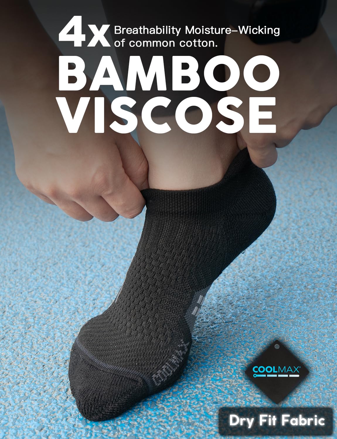 【Advanced COOLMAX & Organic Bamboo viscose Blend】: Keep your feet dry and fresh with our running socks! The COOLMAX fabric quickly wicks away sweat, while organic bamboo viscose helps minimize odors and keeps your socks feeling clean. Enjoy superior comfort and freshness with this innovative sock technology!