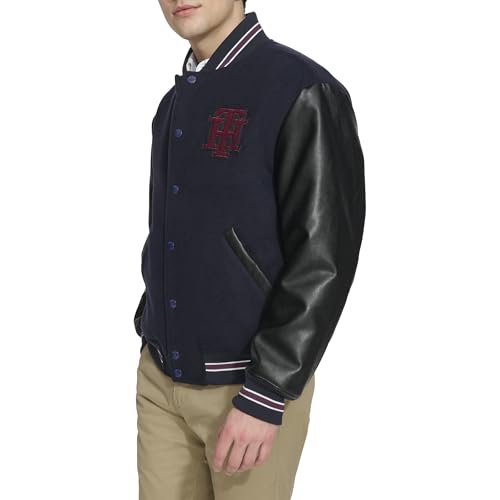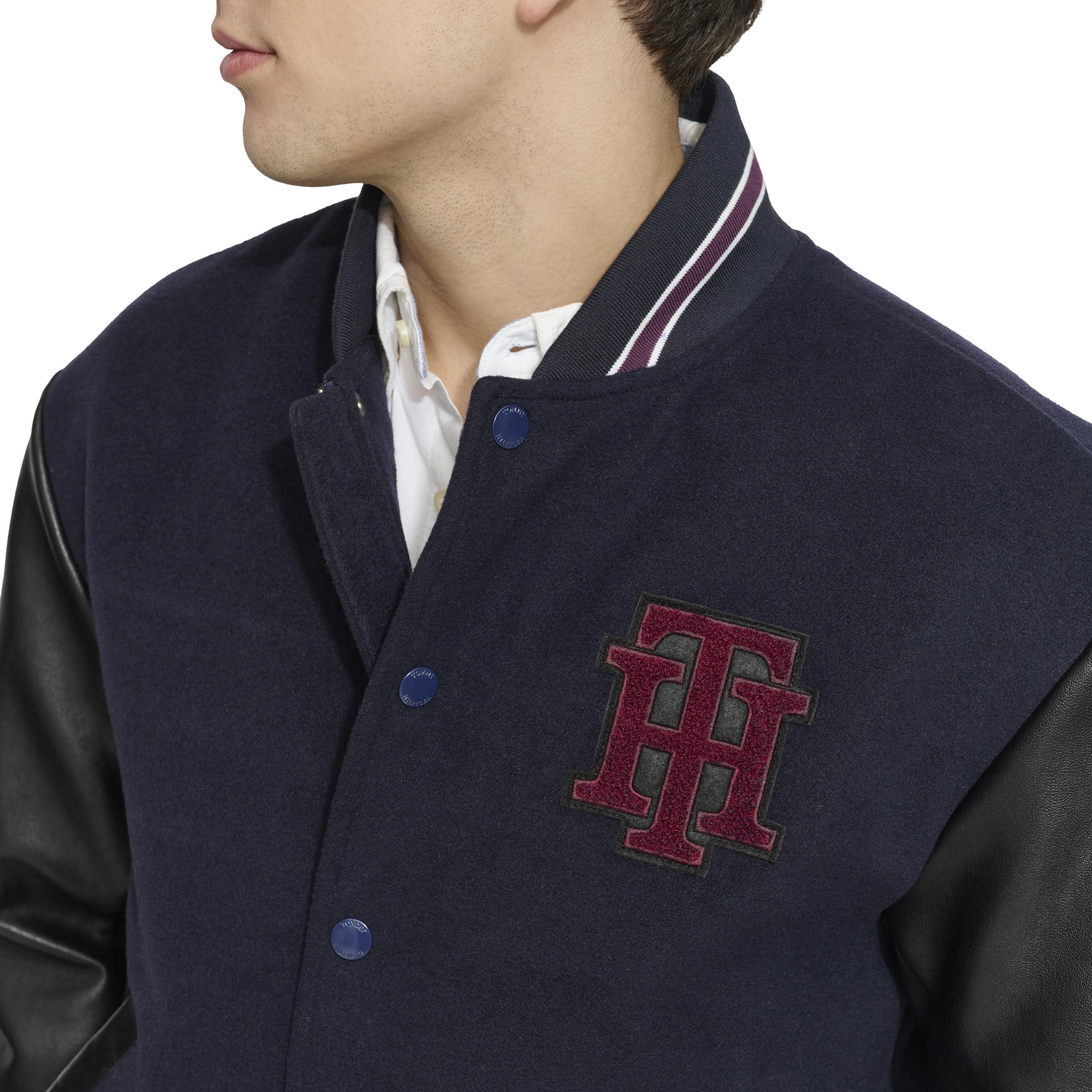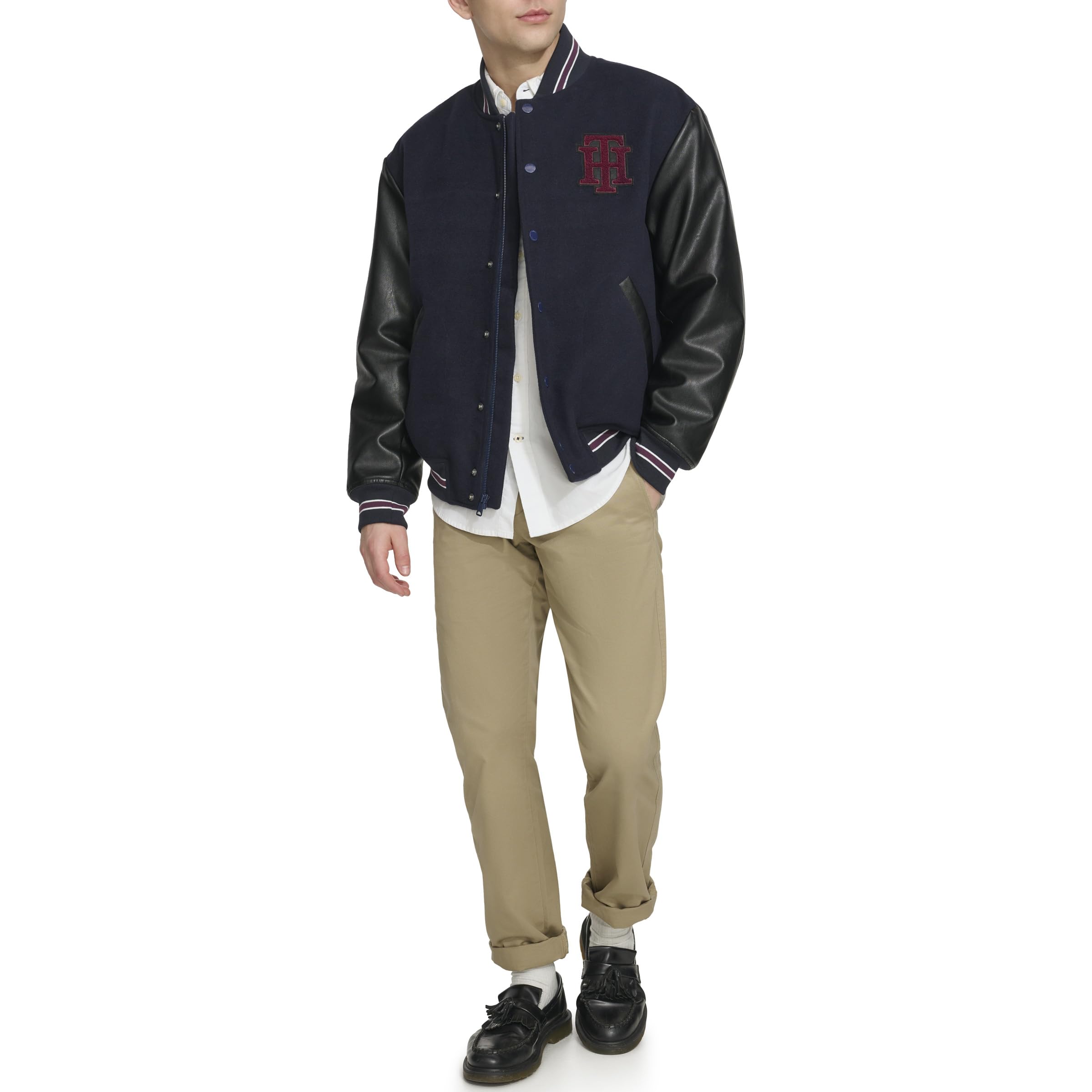 Description Make a bold statement with the Tommy Hilfiger mixed media bomber jacket, where a cozy wool blend body meets sleek faux leather sleeves for the perfect balance of comfort and edge. This jacket is the ultimate fusion of classic sophistication and modern attitude.