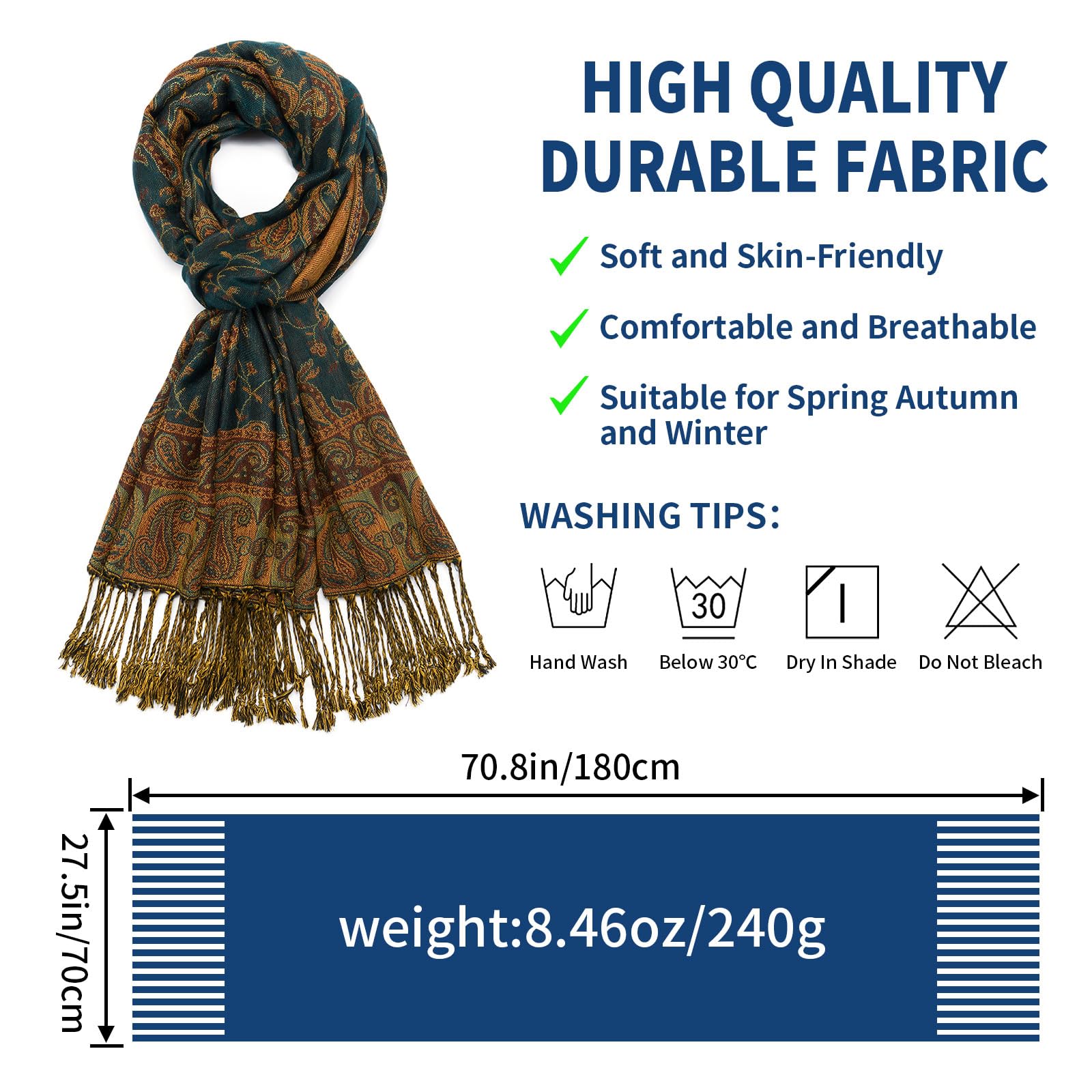 ★HIGH QUALITY MATERIAL - Our weaving pashmina scarves are made from a blend of fine viscose, acrylic and silk fabrics that drape nicely, soft and silky to the touch and breathable, and show a unique sheen when exposed to light. QIUTIMIY pashmina shawls are rich in color and durable. Won't fade or tear easily. Bringing you long-lasting beauty and practicality!