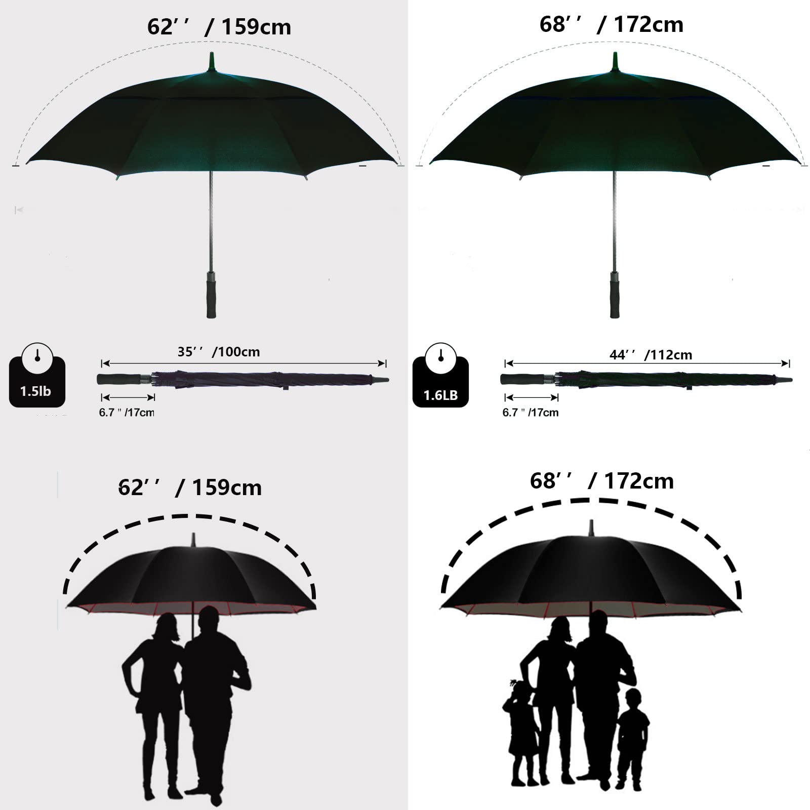 ☂️62″/68″/72″INCH EXTRA-LARGE GOLF UMBRELLA: 62" fit 2~3 people(large); 68" fit 3~4 people(extra huge),72" fit 4~5 people(huge); The BARAIDA large Golf Umbrella will protect you from anything that mother nature can throw at you; rain, hail or shine or wind. The canopy uses waterproof 210T pongee fabric. This silk derived material is lightweight, and water resistant with SPF 50+ protection.