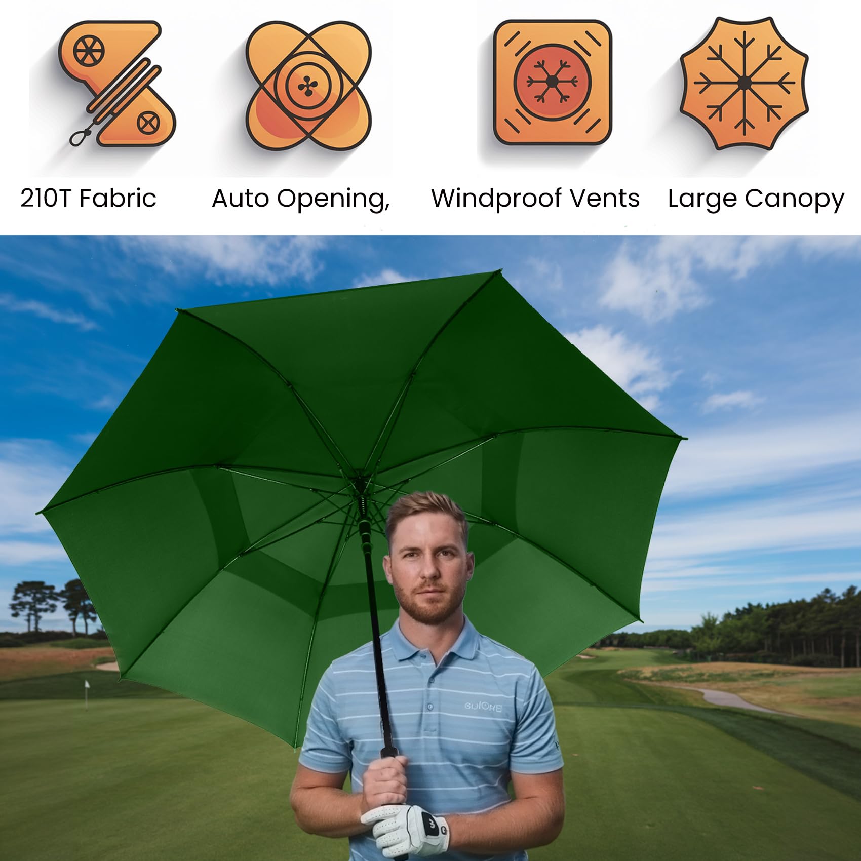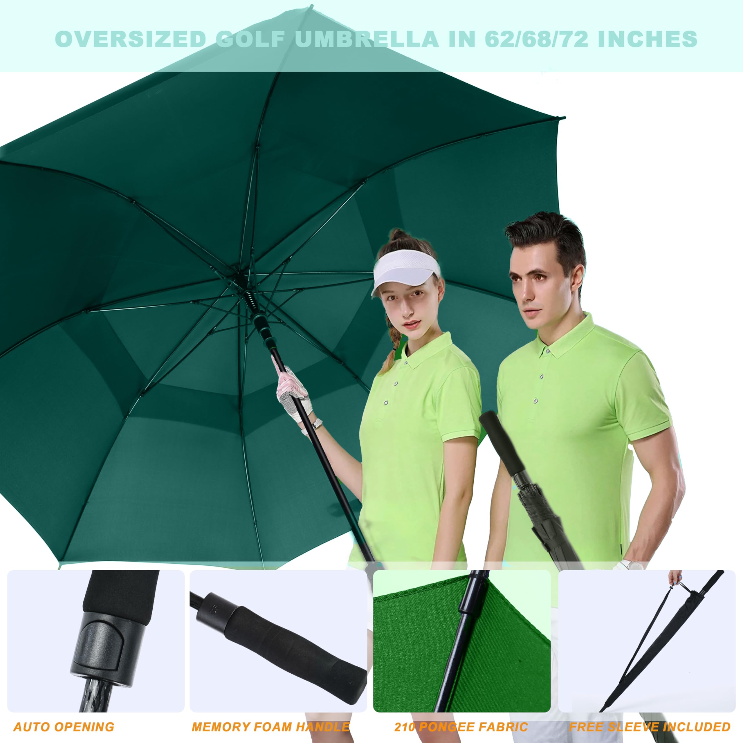 ☂️STURDY GOLF UMBRELLA: The golf umbrella made of fiberglass umbrella support, lightweight and durable. 210T water repellent pongee fabric canopy allows you to spin it gently to dry it like a gentleman, well waterproof. Come with a protective sleeve, help for good storage.
