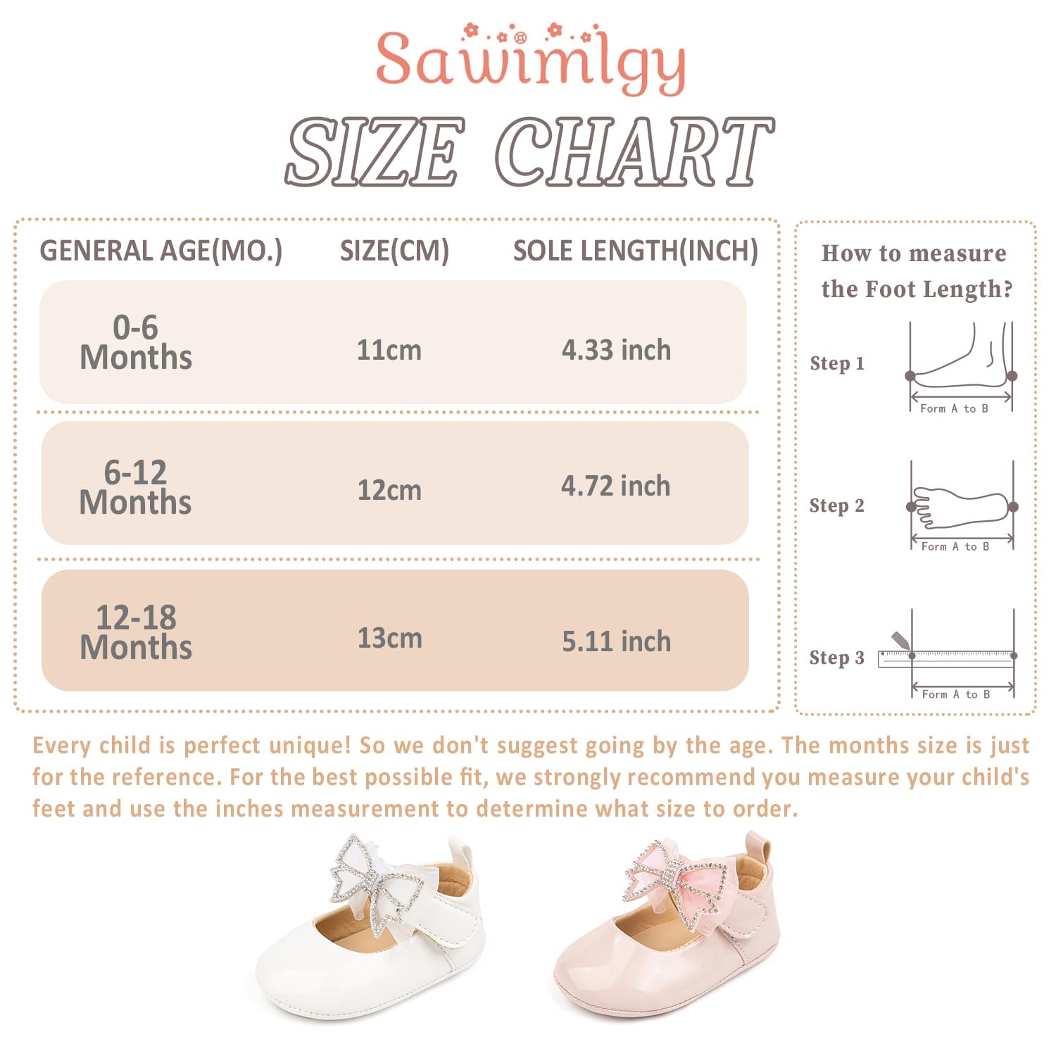 Size Tips: We provide general age recommendations for each of our sizes, but every baby is the unique. So we don't suggest you just going by the age. Please measure baby's actual foot length to choose the best fit shoe. If your little girl have a wider feet, please buy it size larger. Thanks