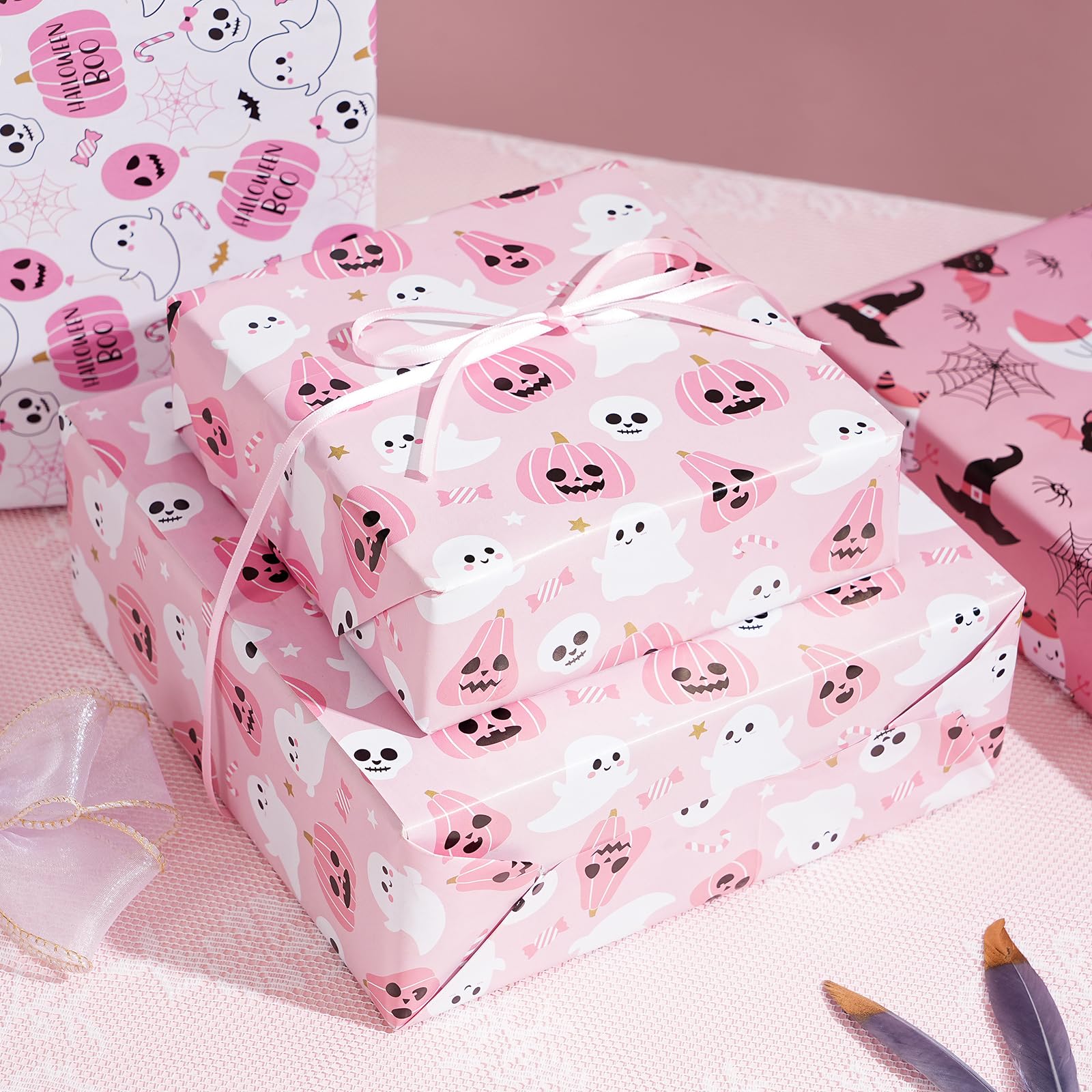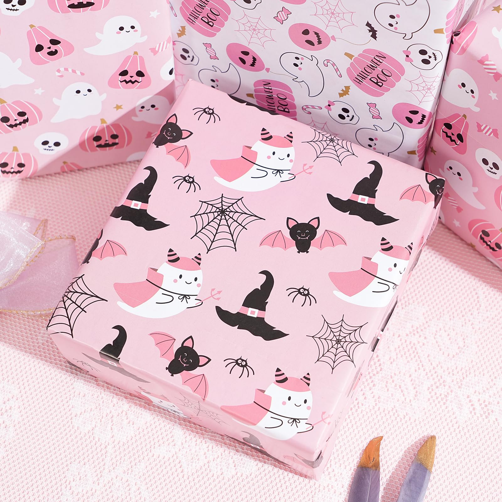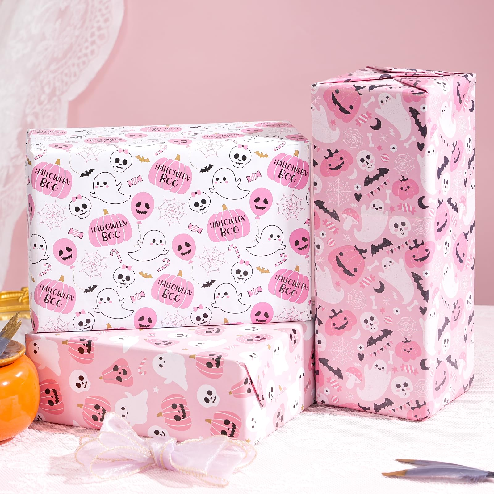 Pink Halloween Wrap Set : Wrap 10+ gifts with 8 high-quality sheets (20"x29" each)! Features cute ghosts, smiling pumpkins & bats – perfect for candy bags, party favors & mystery boxes in nostalgic pink hues.