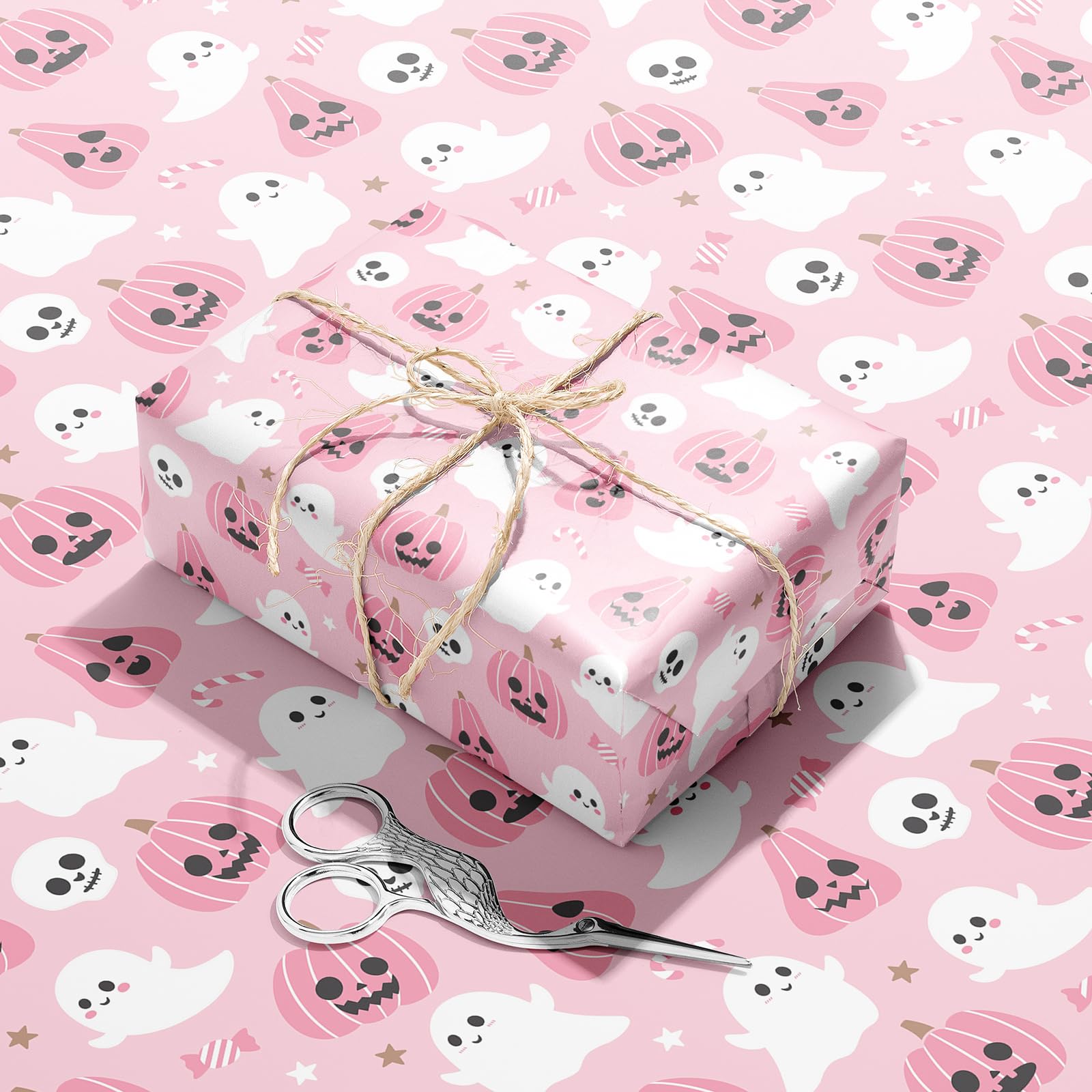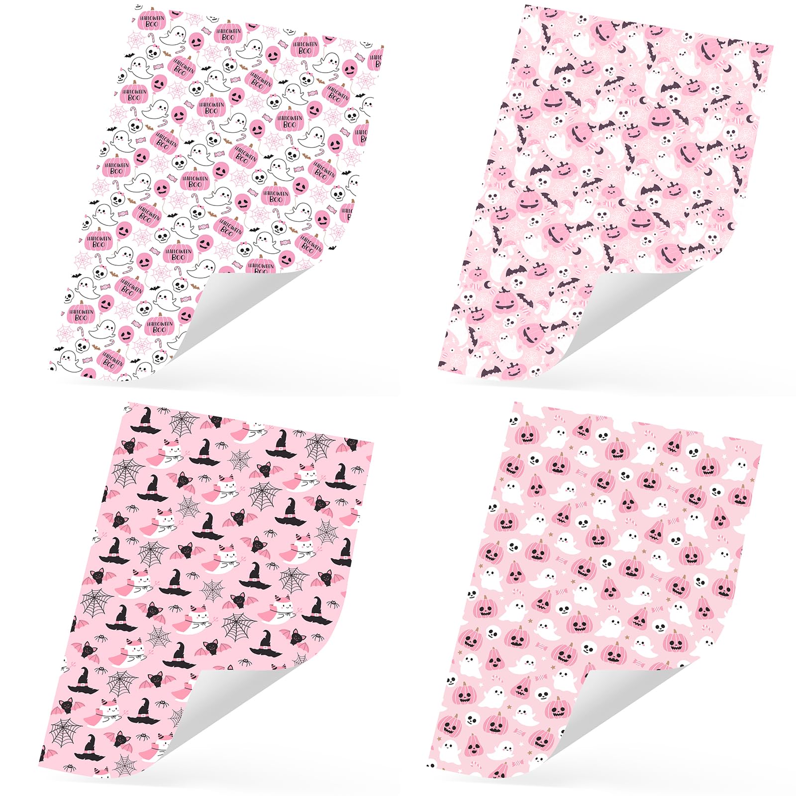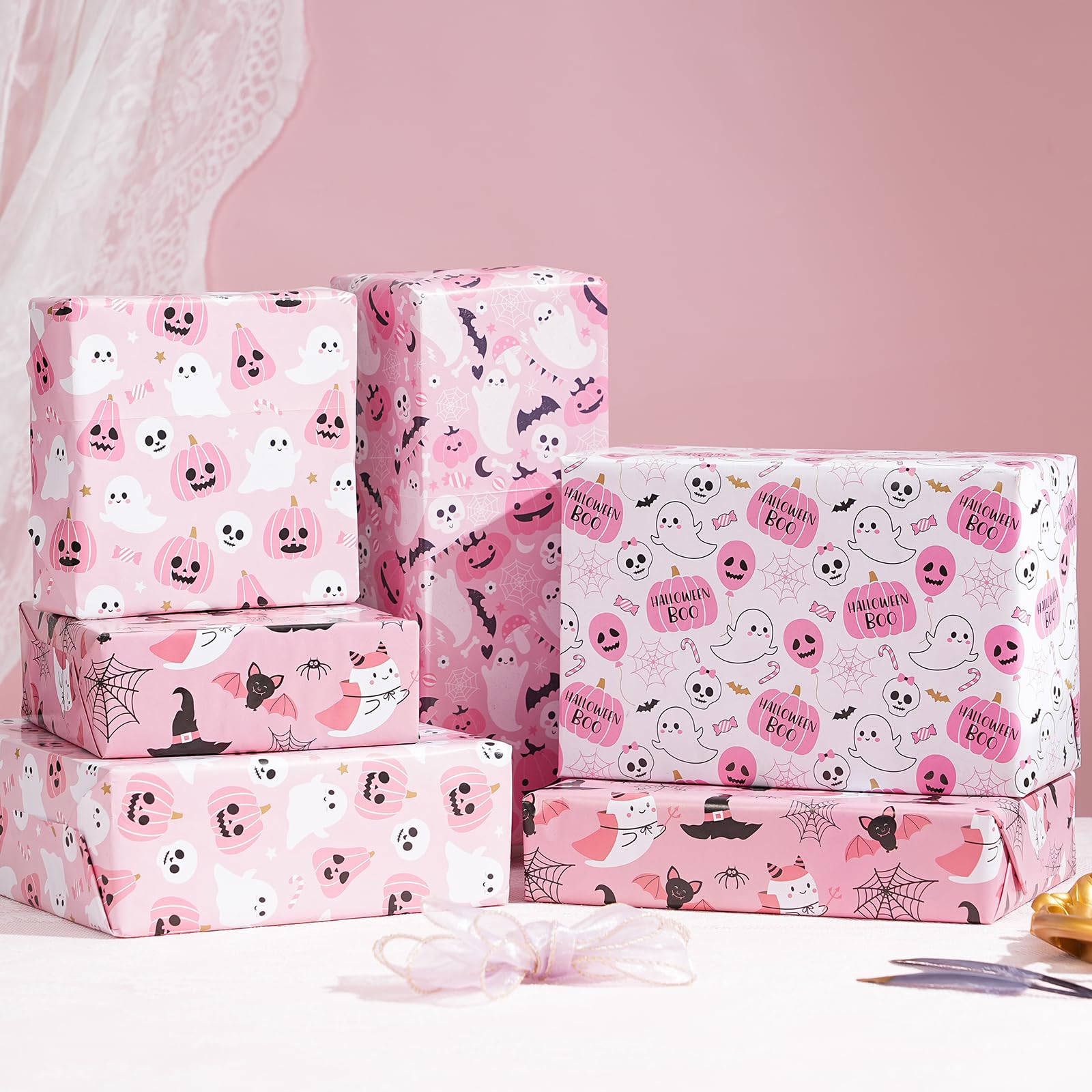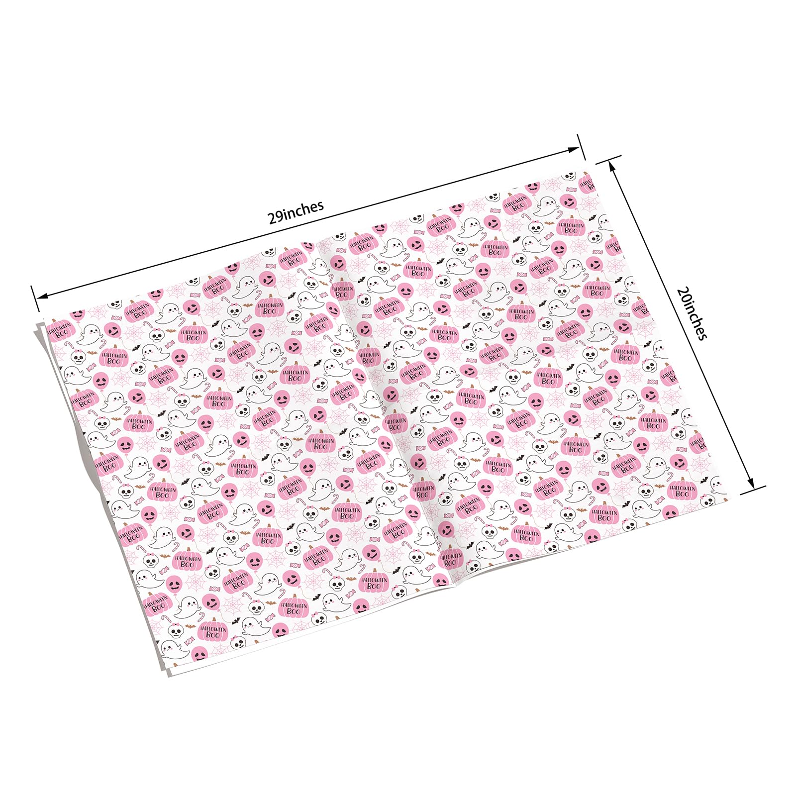 Pink Halloween Wrap Set : Wrap 10+ gifts with 8 high-quality sheets (20"x29" each)! Features cute ghosts, smiling pumpkins & bats – perfect for candy bags, party favors & mystery boxes in nostalgic pink hues.