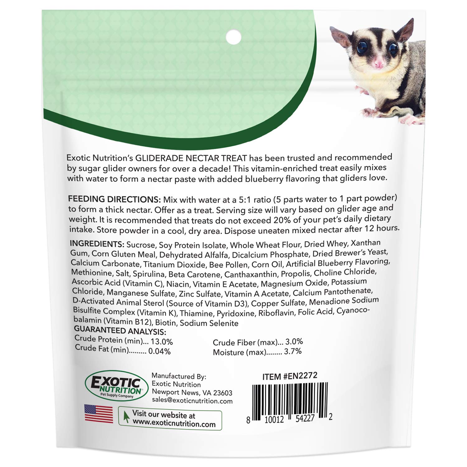 Exotic Nutrition's Gliderade is a vitamin enriched nectar supplement for sugar gliders. FEATURES: ✔ EASY - It comes in powder form, which you mix with water and offer to your Gliders. ✔ HEALTHY - Gliderade provides necessary carbohydrates as well as easily assimilated double-cracked bee pollen. ✔ DELICIOUS - Blueberry flavoring gliders love! ✔ VARIETY - Lend variety to an otherwise monotonous diet. ✔ TRAINING - Assist in training by allowing you to reward your pet. ✔ BONDING - Form a connection between pets and owners. ✔ ENRICHMENT - Add behavioral enrichment. ✔ NUTRITIOUS - Important for lactating females. INGREDIENTS: sucrose, soya protein isolate,whole wheat flour, dried whey, xanthan gum, corn gluten meal, dehydrated alfalfa, dicalcium phosphate, dried brewers yeast, calcium carbonate, titanium dioxide, bee pollen, corn oil, artificial blueberry flavoring, methionine, salt, spirulina, beta carotene, canthaxanthin, propolis, choline chloride, ascorbic acid, (vitamin c), niacin, vitamin e acetate, magnesium oxide, potassium chloride, manganese sulfate, zinc sulfate, vitamin a acetate, calcium pantothenate, d-activated animal sterol, (source of vitamin d3), copper sulfate, menadione sodium bisulfite complex (msbc vitamin k), thiamine, pyridoxine, riboflavin, folic acid, cyanocobalamin, (vitamin b-12), biotin, sodium selenite. FEEDING RECOMMENDATION: This product is a treat and should be fed sparingly, it is not a substitute for a regular, balanced diet. Offer treats 2-3 times per week or as less than 10% of the main diet. Treats may lead to health issues when overfed.