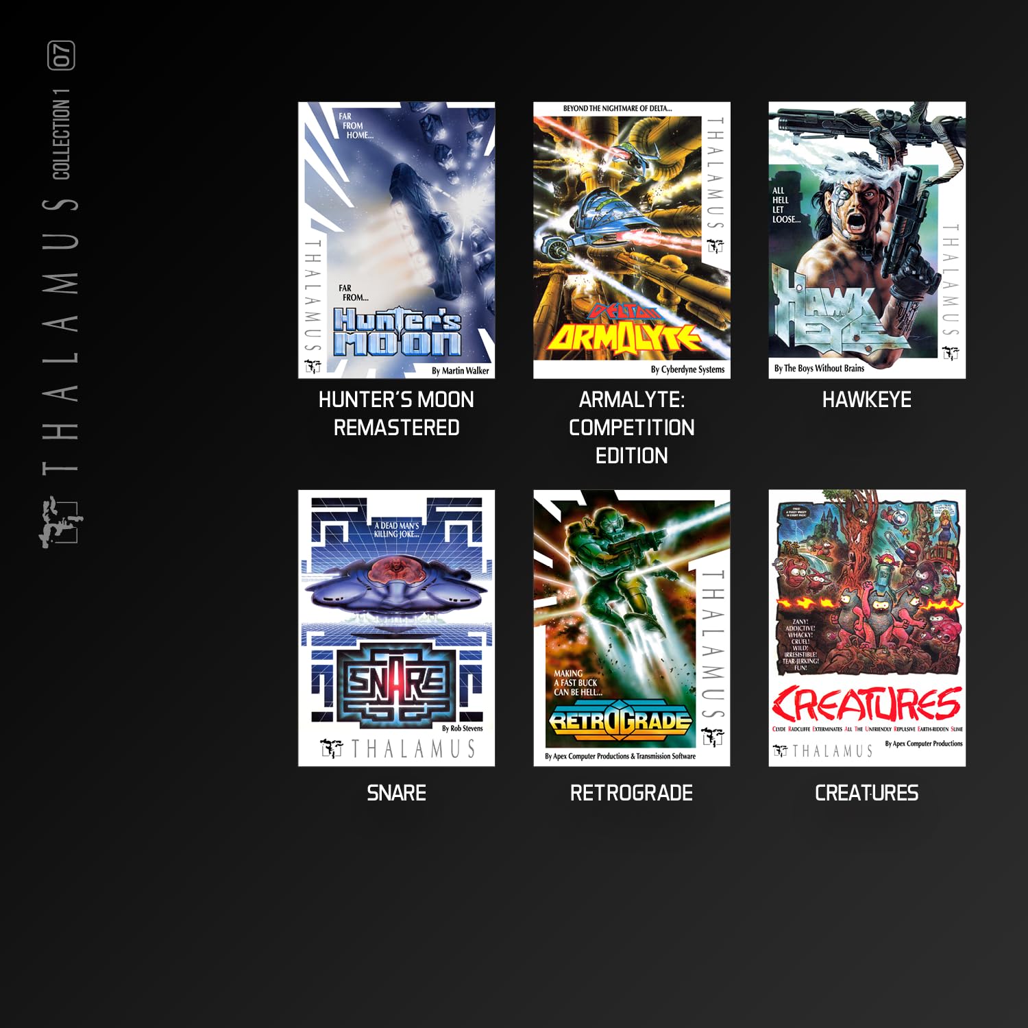 Games List – Armalyte: Competition Edition, Creatures, Creatures II, Hawkeye, Heatseeker, Hunter’s Moon Remastered, Nobby the Aardvark, Retrograde, Snare, Summer Camp, Winter Camp.