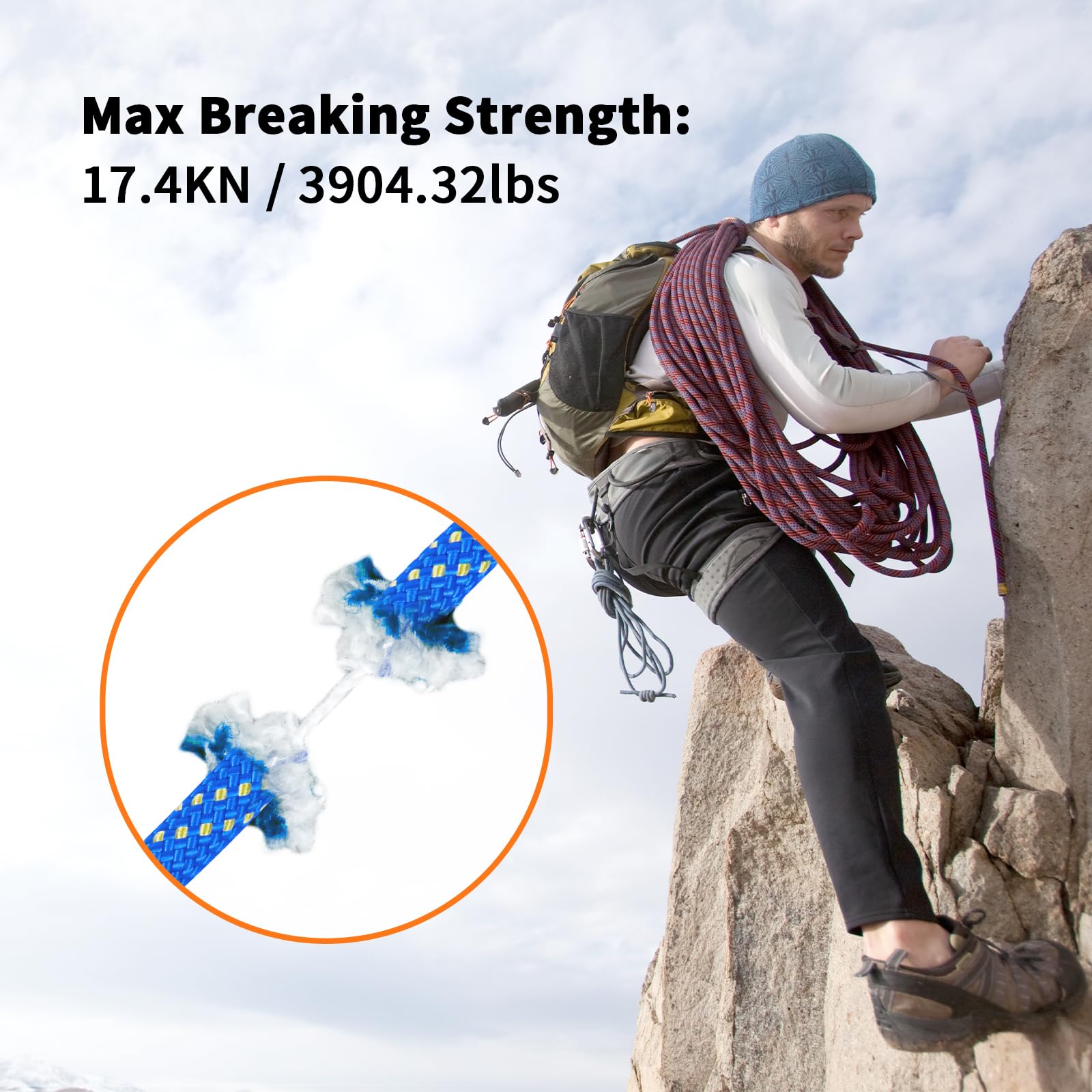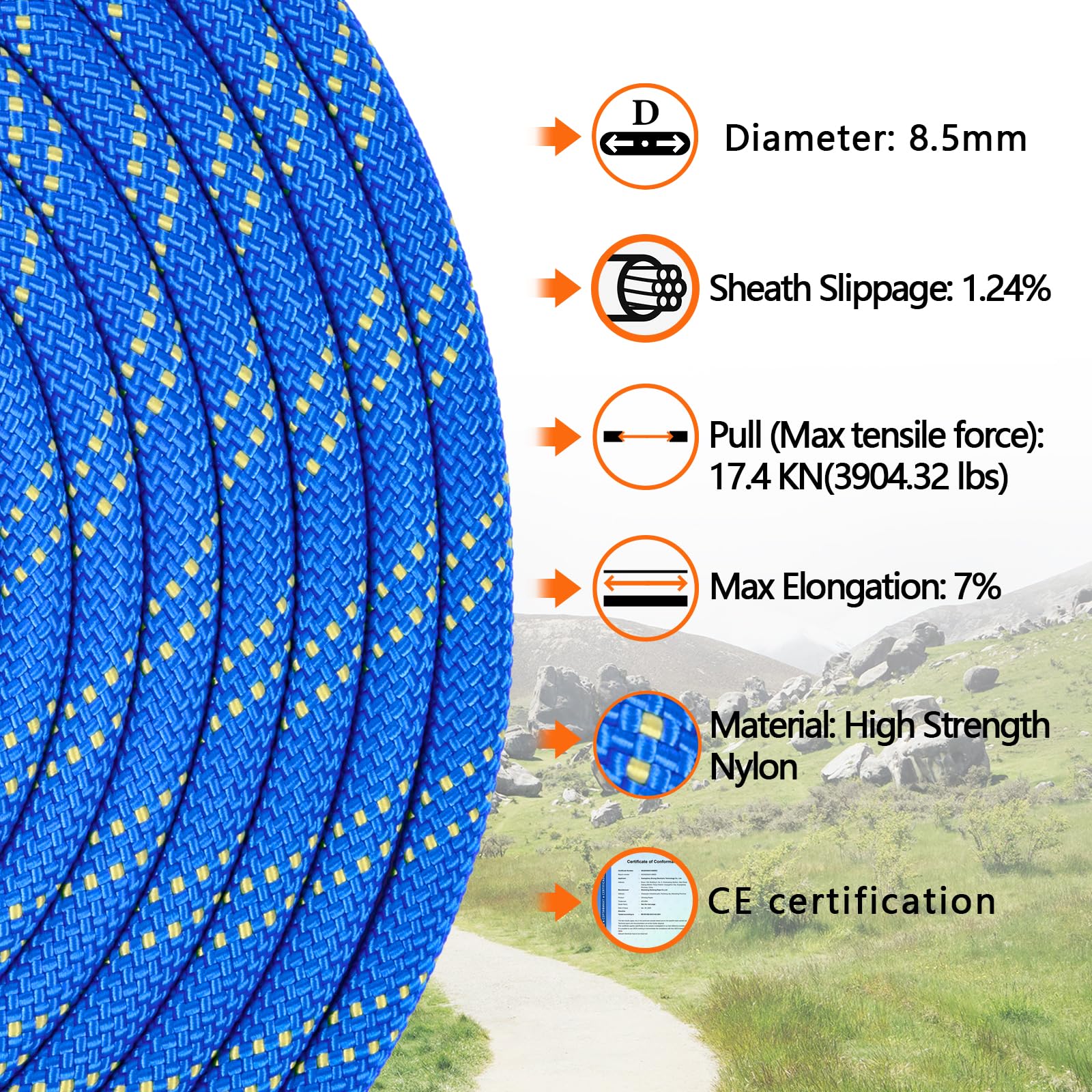 Professional Grade: Maximum tensile strength of 17.4 KN (3904.32lbs), weight limit of 300 kg, static elongation less than 1%. Low ductility rock climbing rope can reduce the safety risks caused by the extension of the rope, ensure your safety when doing any outdoor activities.