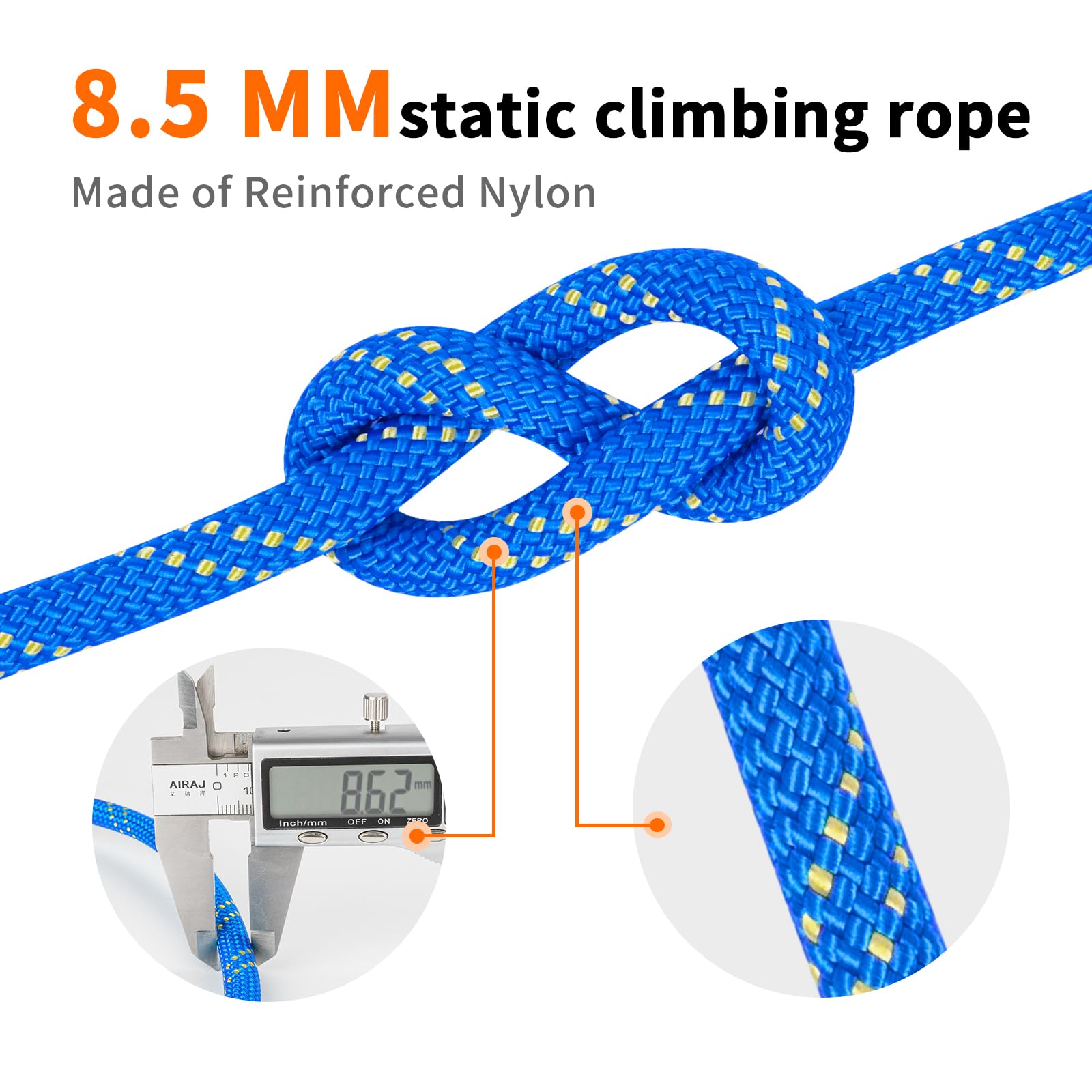 Details: Package includes 8.5MM static climbing rope *1, storage bag *1. Heat cut sealing process on rope ends, you can cut the rope at will without worrying about the rope unraveling. Bright color ensure great visibility in all weather. Available in sizes from 32FT to 230FT.