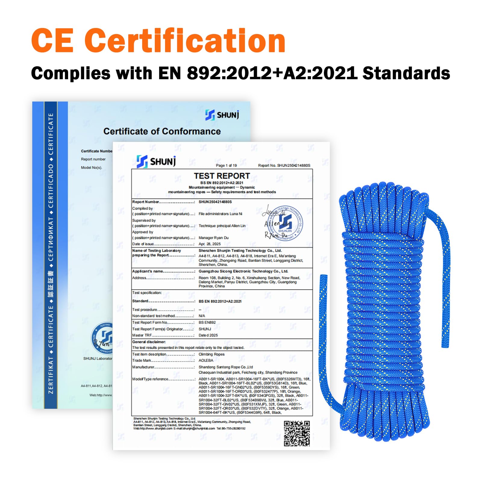 CE Certified: Our static climbing rope meets the CE Certification of EN 892:2012+A2:2021 Standards (Certificate No. : SHUN2504214880SC), ensuring quality control. UV-Resistant & Abrasion-Proof give the rope a longer service life.