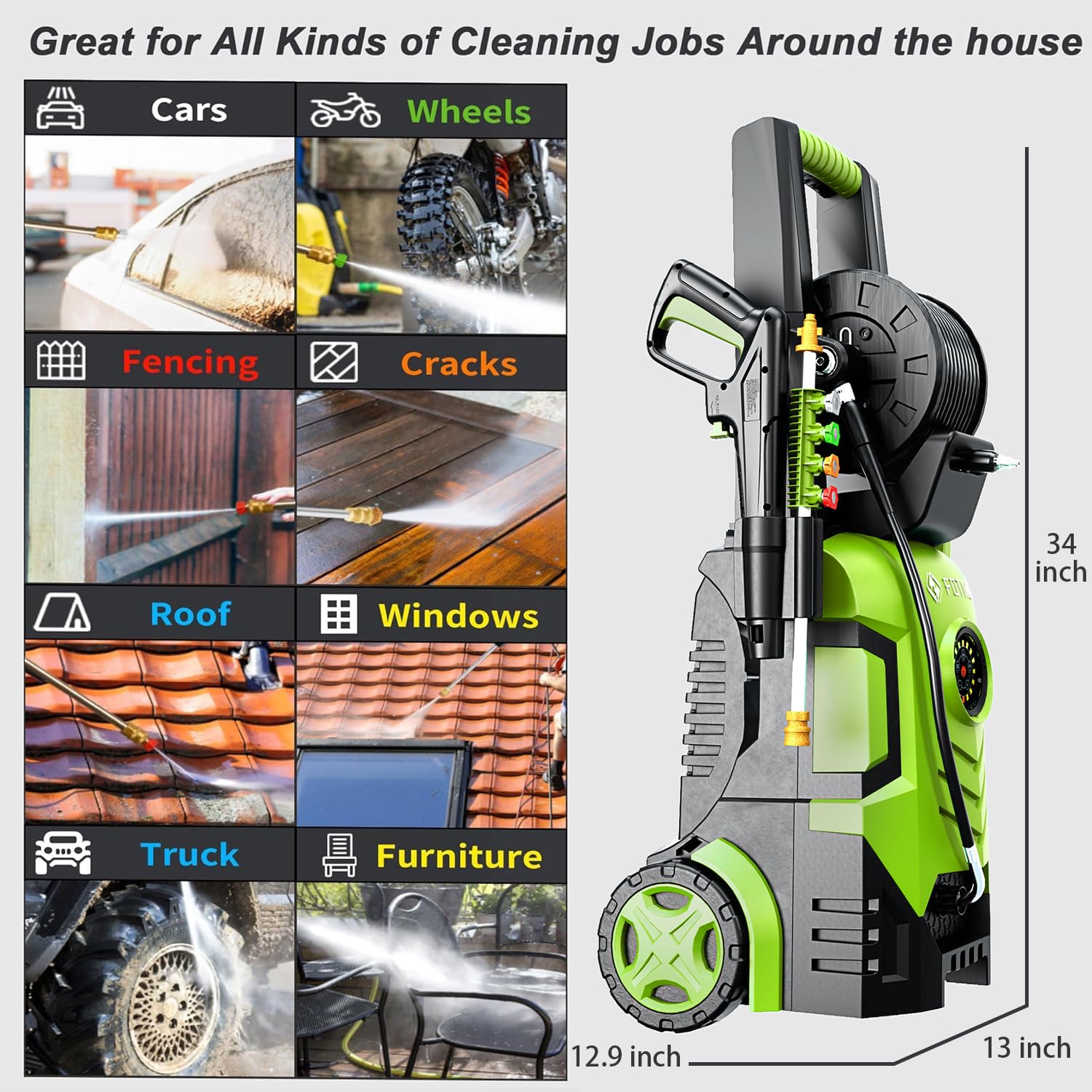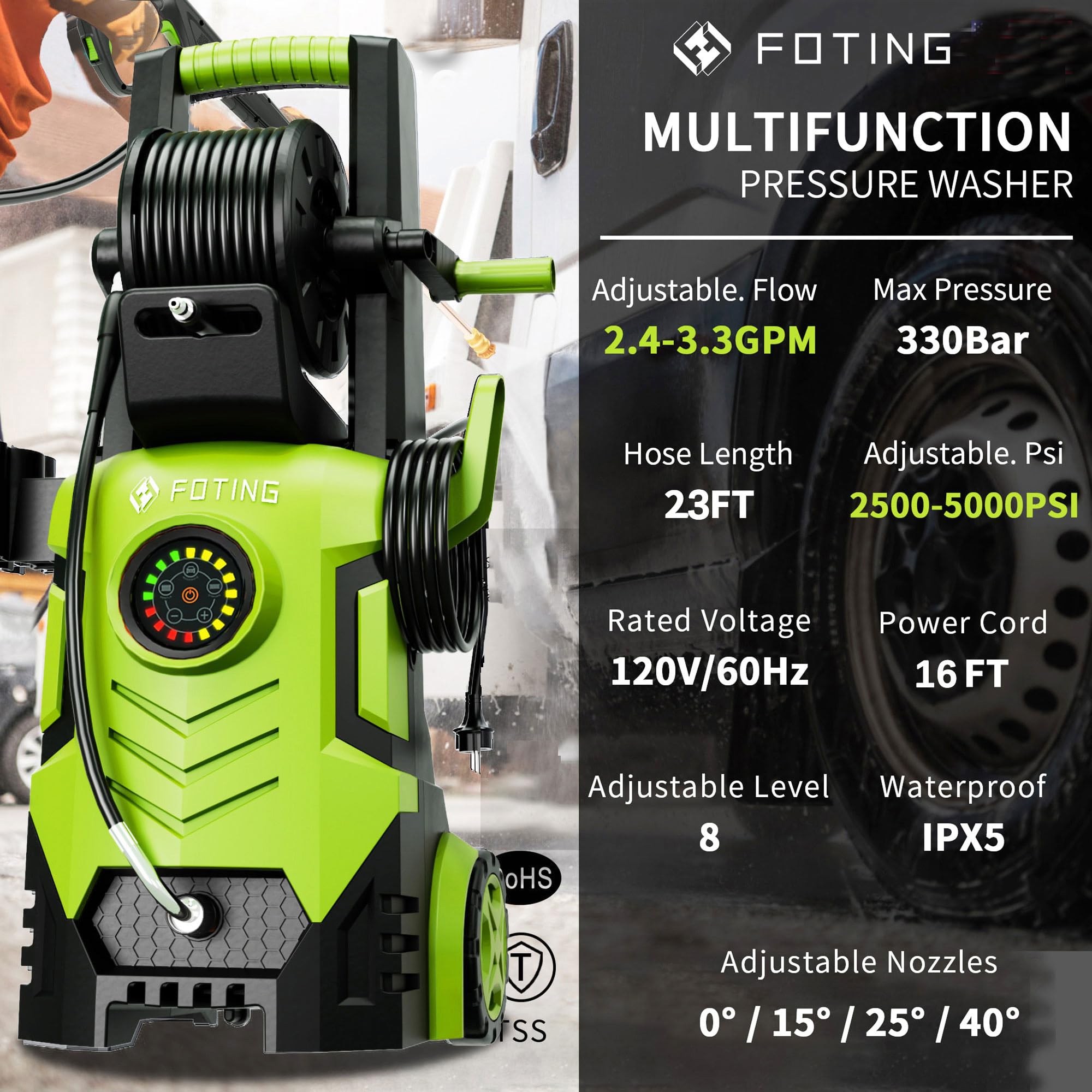 5000 PSI MAX PRESSURE: FOTING pressure washer delivers a powerful 5000 PSI water pressure at 3.3 GPM for maximum cleaning power.Quickly and easily cleaning decks, terraces, driveways, siding, sheds, cars, outdoor power equipment as well.