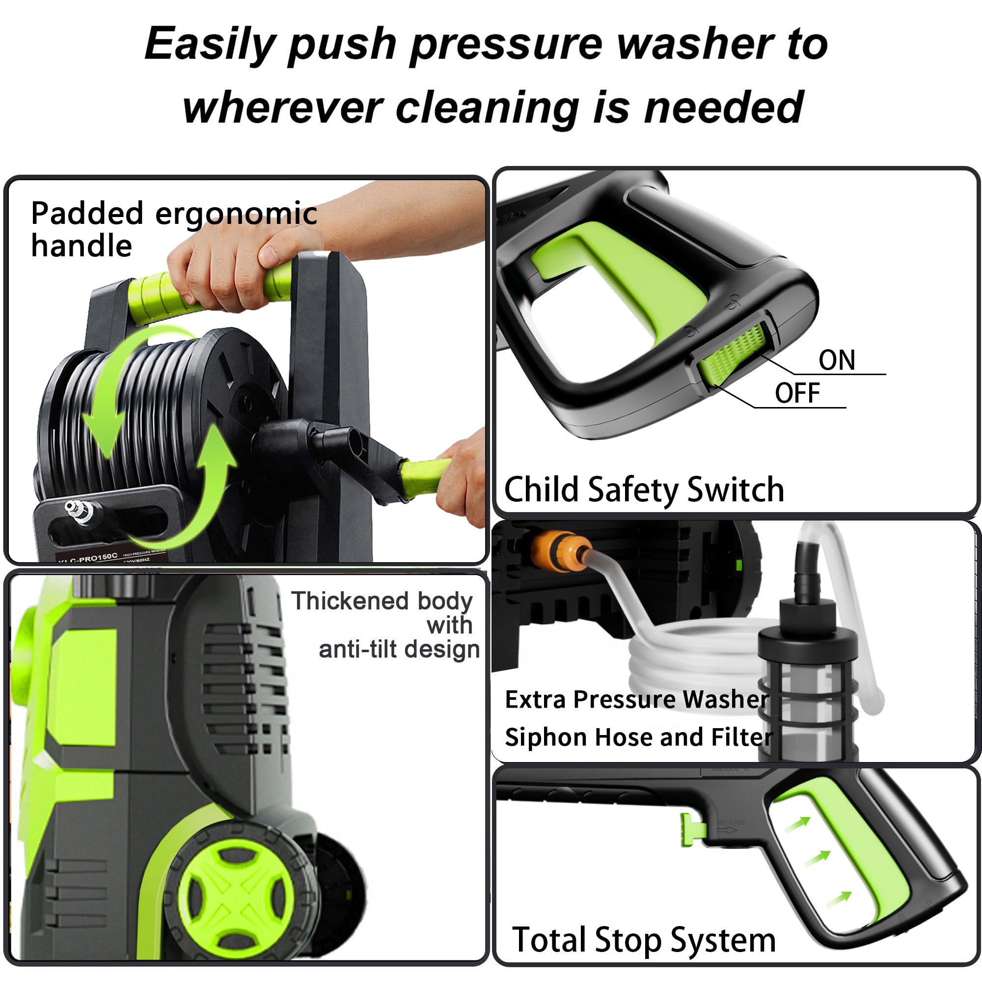 BETTER DETAIL PROVIDED: Waterproof touch screen for easy use; Wider base prevents tilting; padded rounded handles for added comfort; 16ft cable and 23ft hose reach any area.