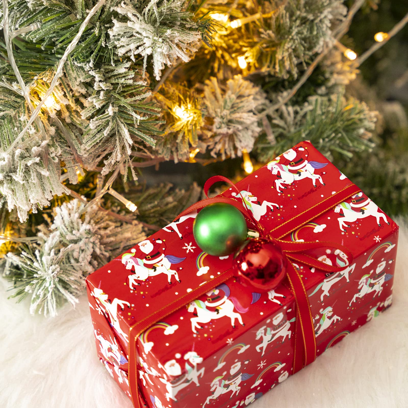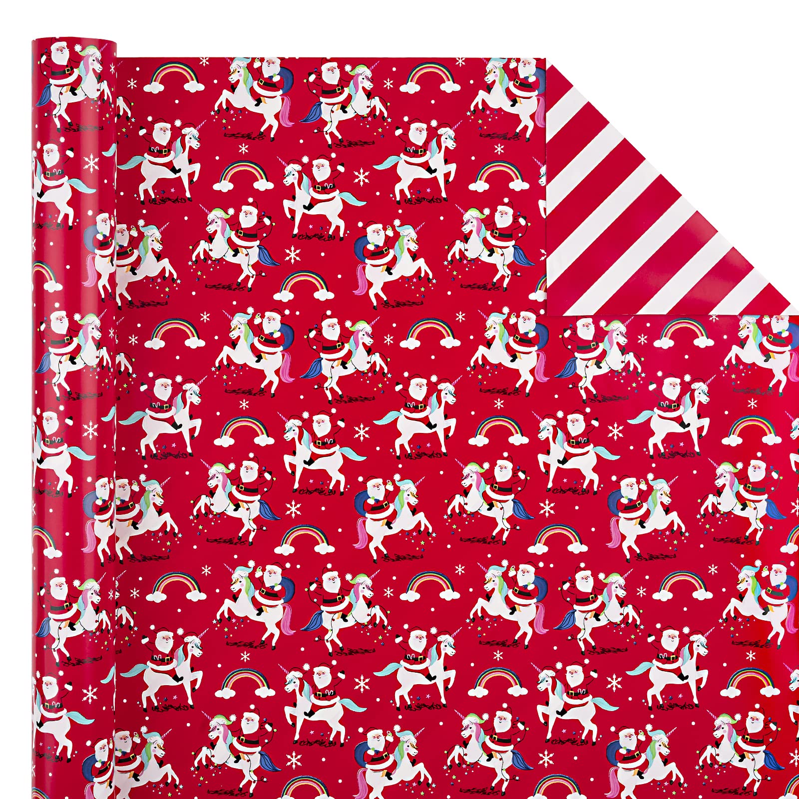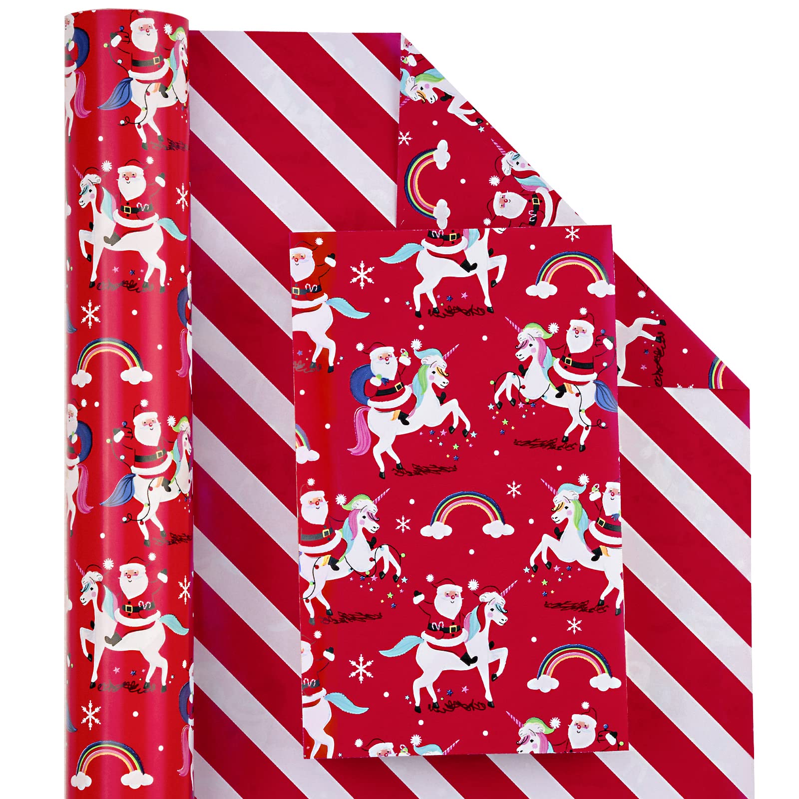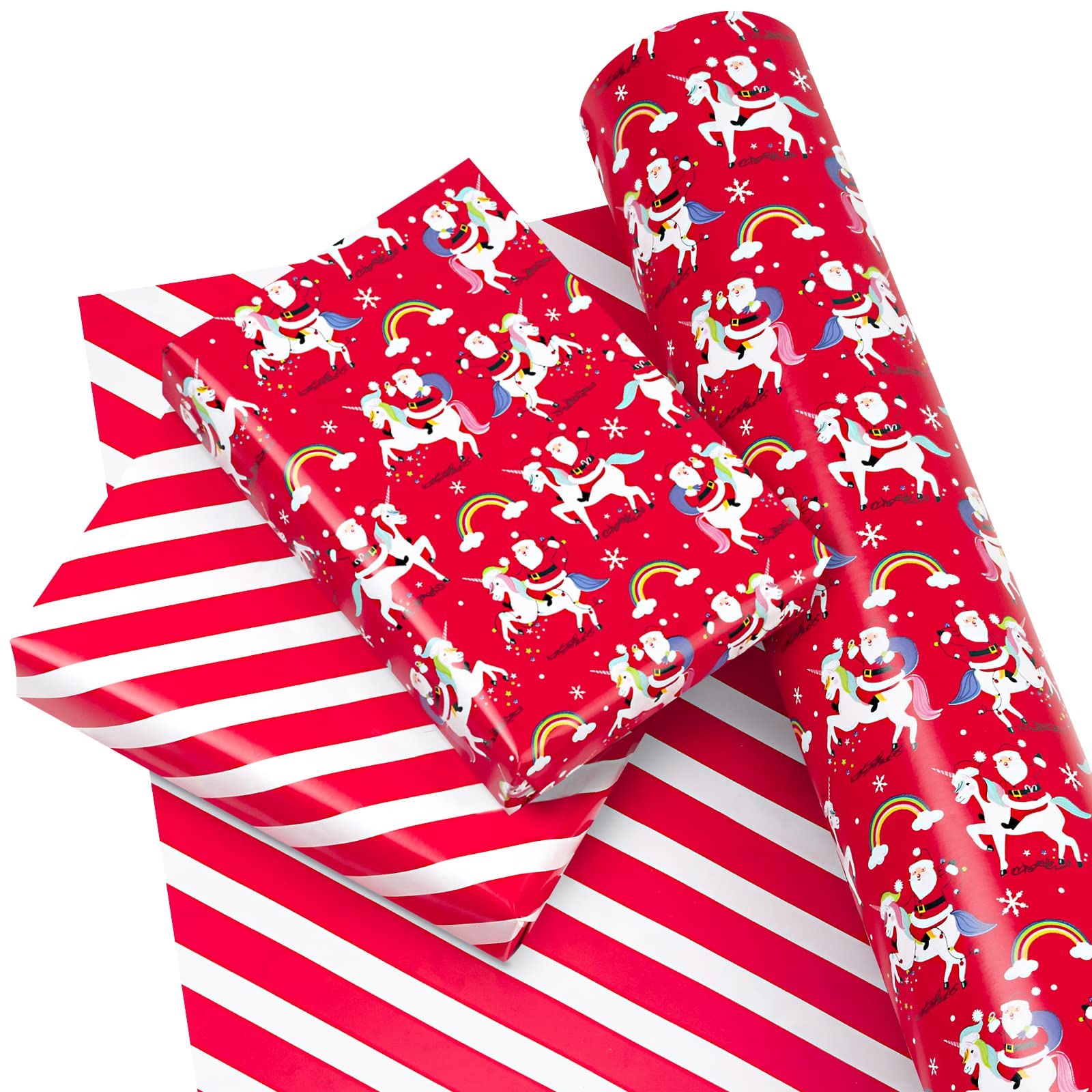 Perfect Size: Each roll measures 30 inch wide x 33 feet long. Providing you with a total of 81.8 square feet of paper, sufficient to cover a wide variety of gift sizes. Reversible Design: Red santa claus and unicorn printed on one side, and red and white stripe printed on the reverse. Two different designs make unique and varied gift presentations easy. Premium Quality: Created with high-quality paper materials, thick and not easily tear or rip. Item came with shrink film to prevent wrapping paper from scratches and reduce dust. Use All Winter: Whether it's the joyous celebration of Christmas or the holiday season filled with family gatherings and gift - giving traditions, it is an outstanding choice. It is also great for decorating the Christmas tree. Wrap Your Love for Christmas: You can wrap your love with our special Christmas wrapping paper, adding a splash of color to all of your gifts. Your family, children, and friends will feel your sincere Christmas wishes this holiday season. Quality Customer Service: Any question about products or orders, please feel free to contact the customer service, we will try our best to solve the problem.