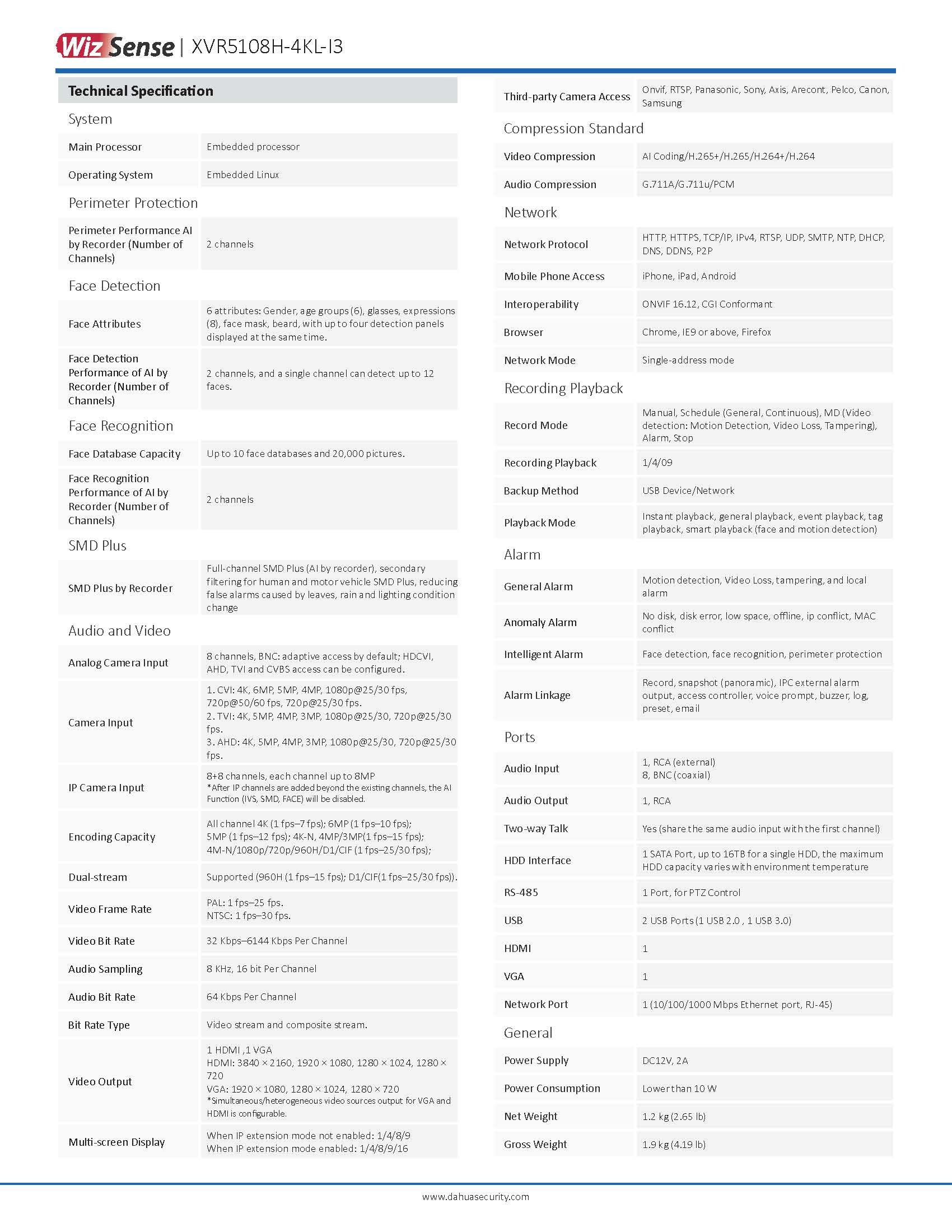 XVR5108H-4KL-I3 featuring 8CH SMD Plus to benefit customers from AI upgrade. This DVR has been developed to reduce false-alarm rates and the cost of human surveillance, thus bringing great value to customers in search of products with accurate human/vehicle alarm to raise the security level of various facilities. Functions Real Time Face Recognition Video stream real time face recognition. Facial attributes analysis features including gender, age, expression, glasses, moustache, face mask. Identify people and capture, record faces with metadata. Perimeter Protection Automatically filtering out false alarms caused by animals, rustling leaves, bright lights, etc. Enables system to act secondary recognition for the targets. Improving alarm accuracy. SMD Plus With intelligent algorithm, the Smart Motion Detection technology can categorize the targets that trigger motion detection and filter the motion detection alarm triggered by non-concerned targets to realize effective and accurate alarm. AI Coding Compared with H.265/H.264, AI coding can reduce more than 50%-bit rate and storage requirements while have no loss of decoding compatibility, providing clear human and vehicle details. HDCVI/AHD/TVI/CVBS Auto-detect The DVR can auto recognize the signal of front-camera without any setting. High-Definition Camera Input The DVR supports up to 4K HDCVI camera and 8MP IP camera input. Coaxial Audio/Upgrade/Alarm The integrated design can reduce wiring troubles which makes it much more cost-effective and convenient for installation. AI Search Support AI search by metadata of different targets or uploading face pictures to device and comparing them with recorded faces by similarity. Enable operators to search through multi channels and long duration quickly and easily, efficiently find out when and where a person of interest appears.