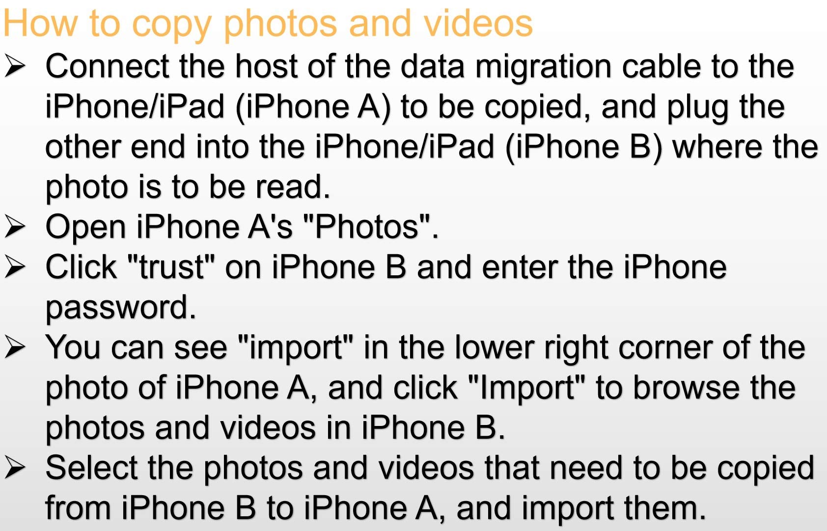 [Unique Lightning-to-Lightning Data Migration cable]: connect iPhone, iPad, or iPod to another iPhone, iPad, or iPod.