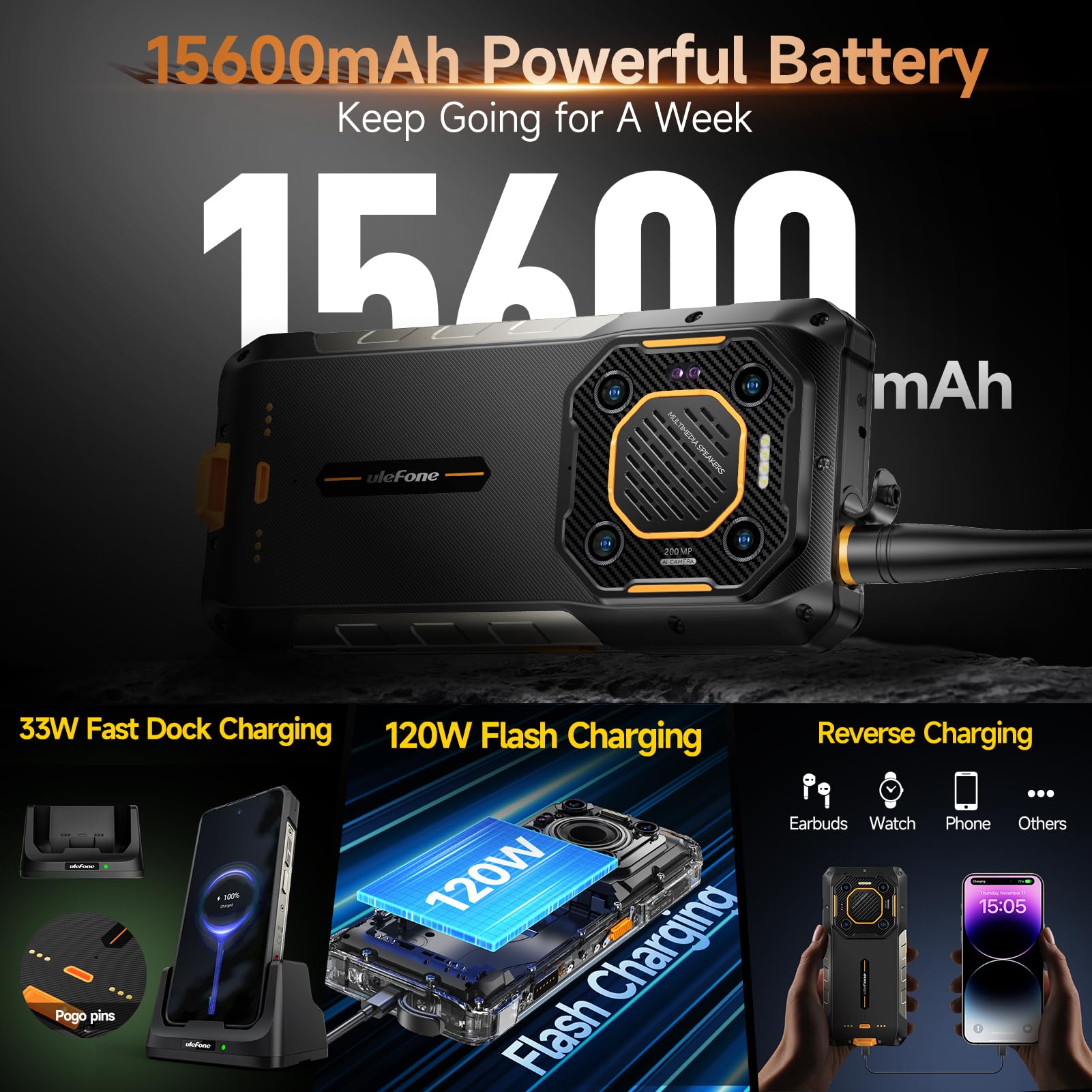 【15600mAh + 120W Charging + 33W Dock Charging】Armor 26 Ultra packs a mega battery with a capacity of 15600mAh for 1750 hours standby time, 56 hours call time, 23 hours video playback. Supports 120W flash charging, 33W fast dock charging, and reverse charging.