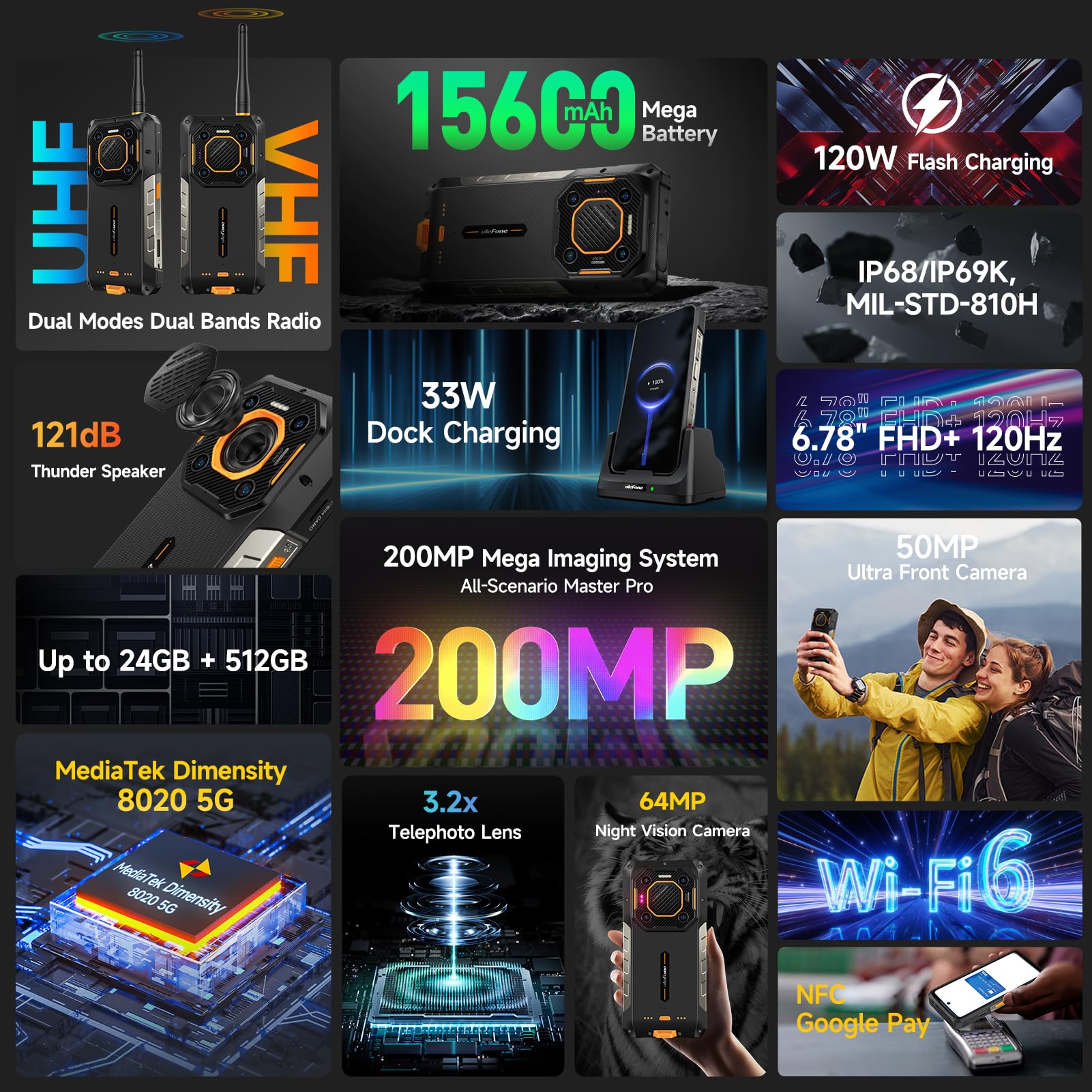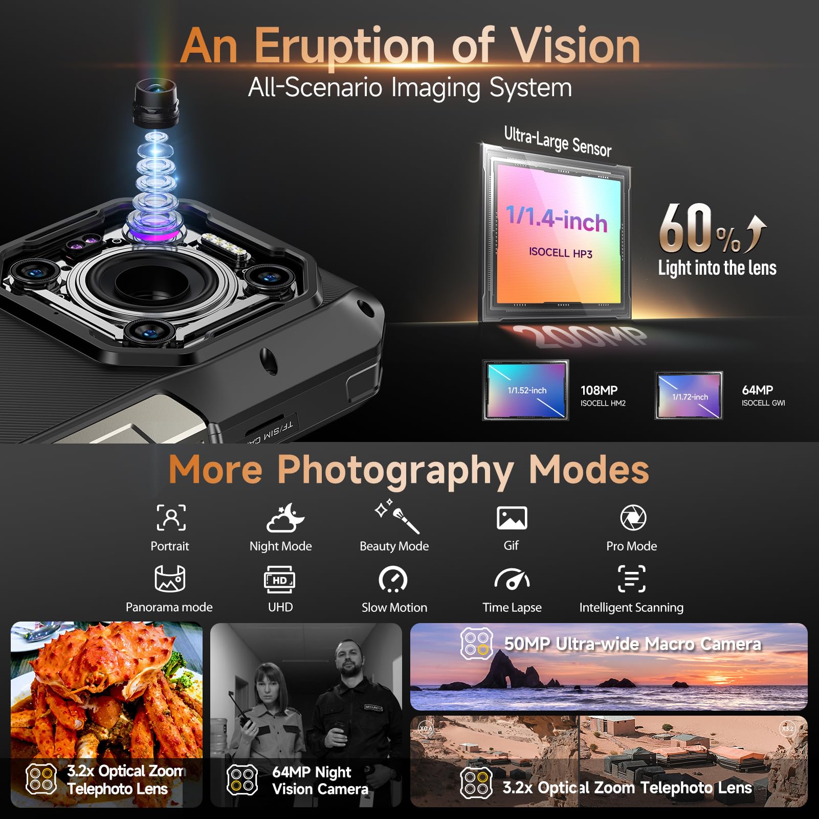 【200MP Quad Camera + 50MP Front Camera】200MP Main Camera empowered by Samsung ISOCELL HP3, featuring a 1/1.4-inch ultra-large sensor with /1.79 aperture. 8MP 3.2x optical zoom telephoto lens with up to 76mm* focal length, 50MP ultra-wide lens featuring up to 117.3° field of view(FOV), enhanced by macro and ElS algorithm. 64MP Night Vision Camera paired with OMNMSION's advanced OV64B sensor and Ulefone's NightEif Uitra 3.0 algorithm and 50MP Ultra Front Camera. It takes mobile photography to another peak.
