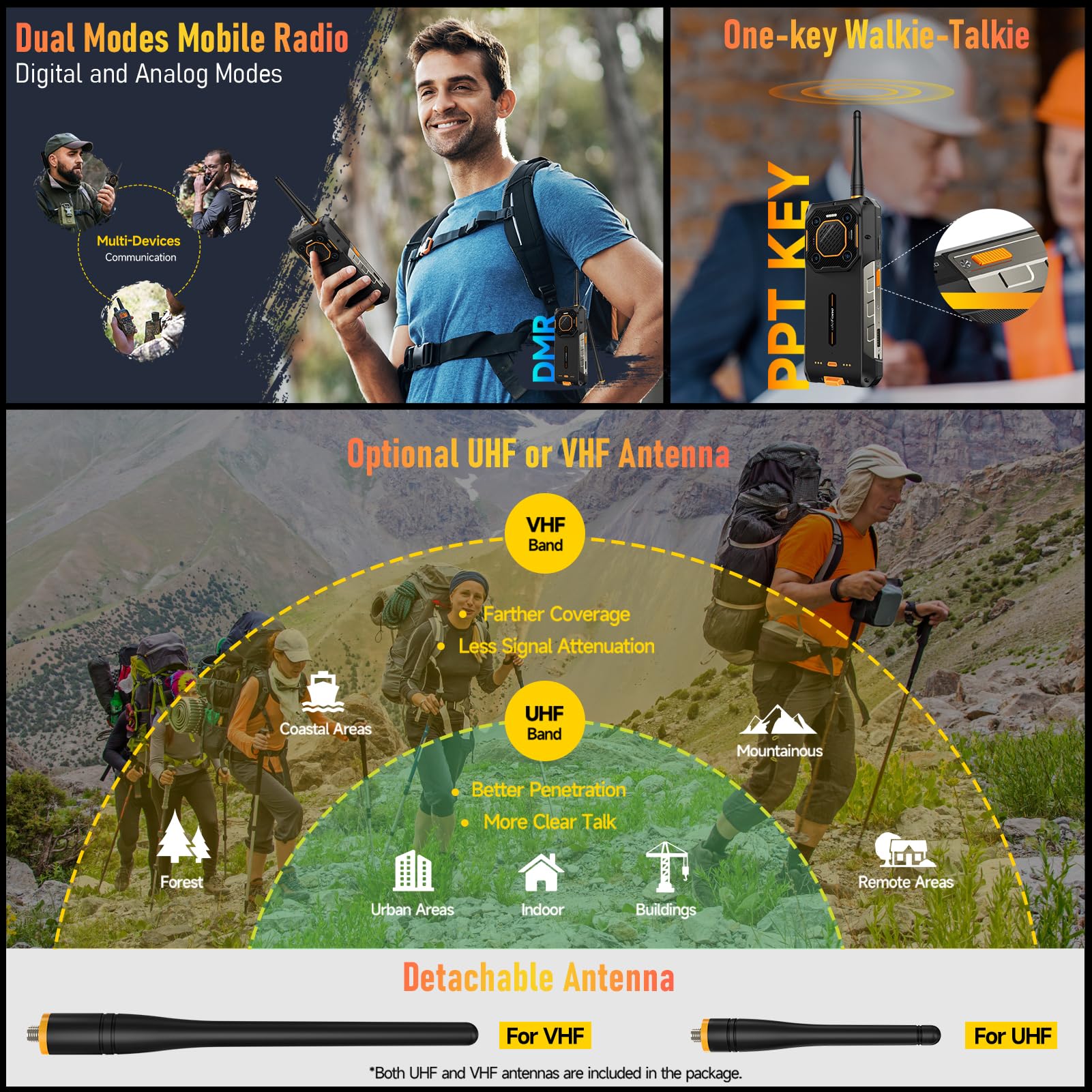 【Dual Modes Dual Bands】Armor 26 Ultra WT incorporates a PTT shortcut key for easy access, features digital and analog dual modes, supports multiple device connections. Supports both UHF and VHF for flexible use based on actual conditions. The UHF band(400-480MHz) is suitable for short-distance communication, the VHF band(136-174MHz) is for long-distance communication. Come with 2 x Detachable Antenna(UHF+VHF).