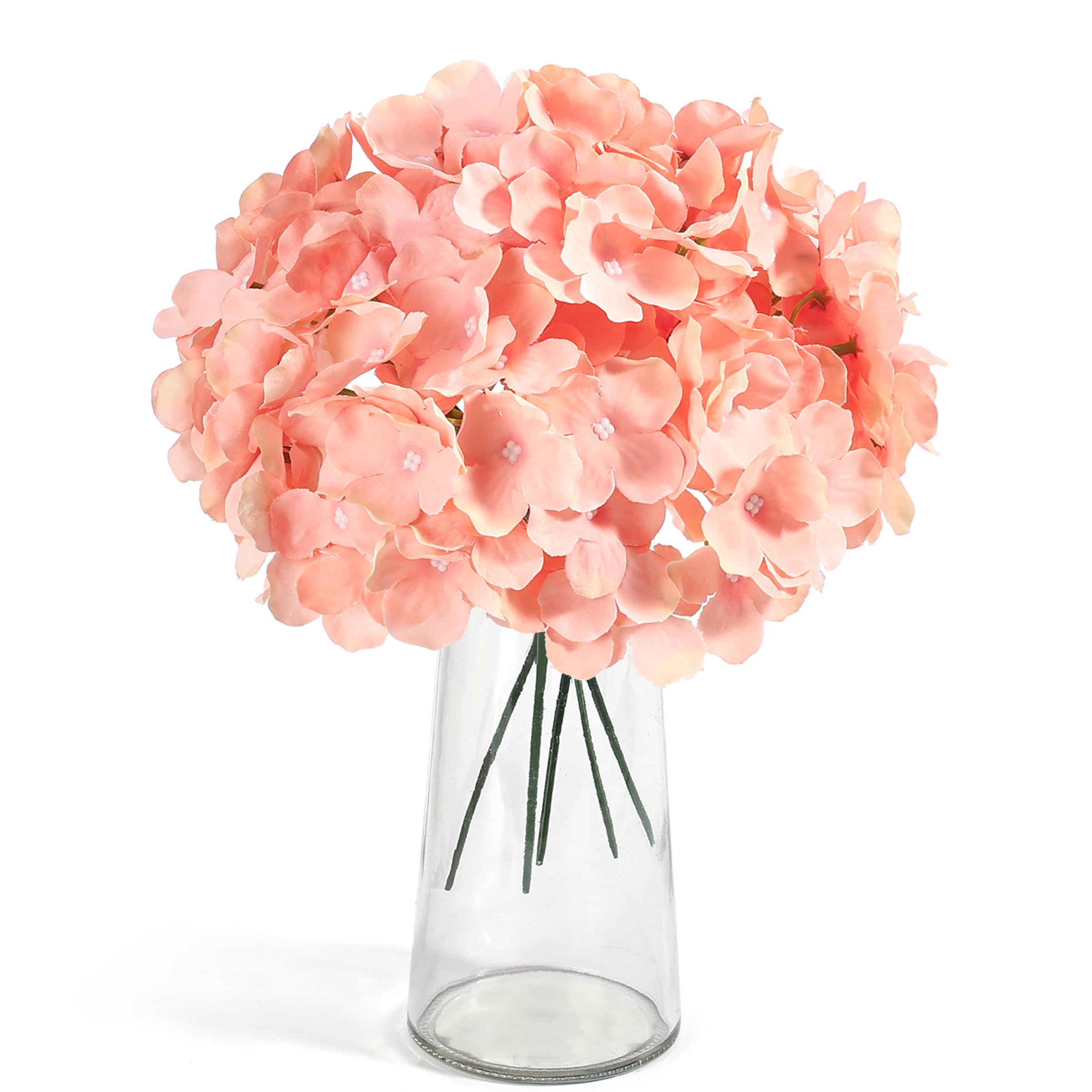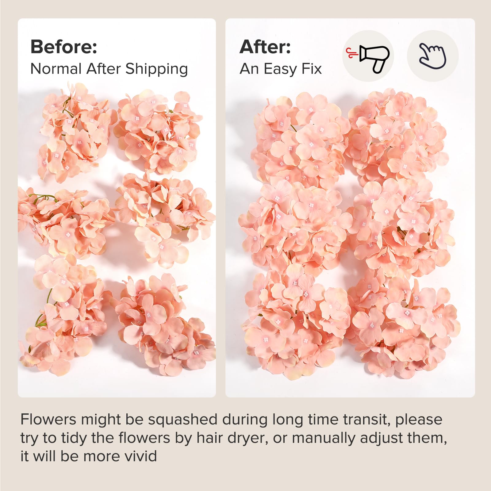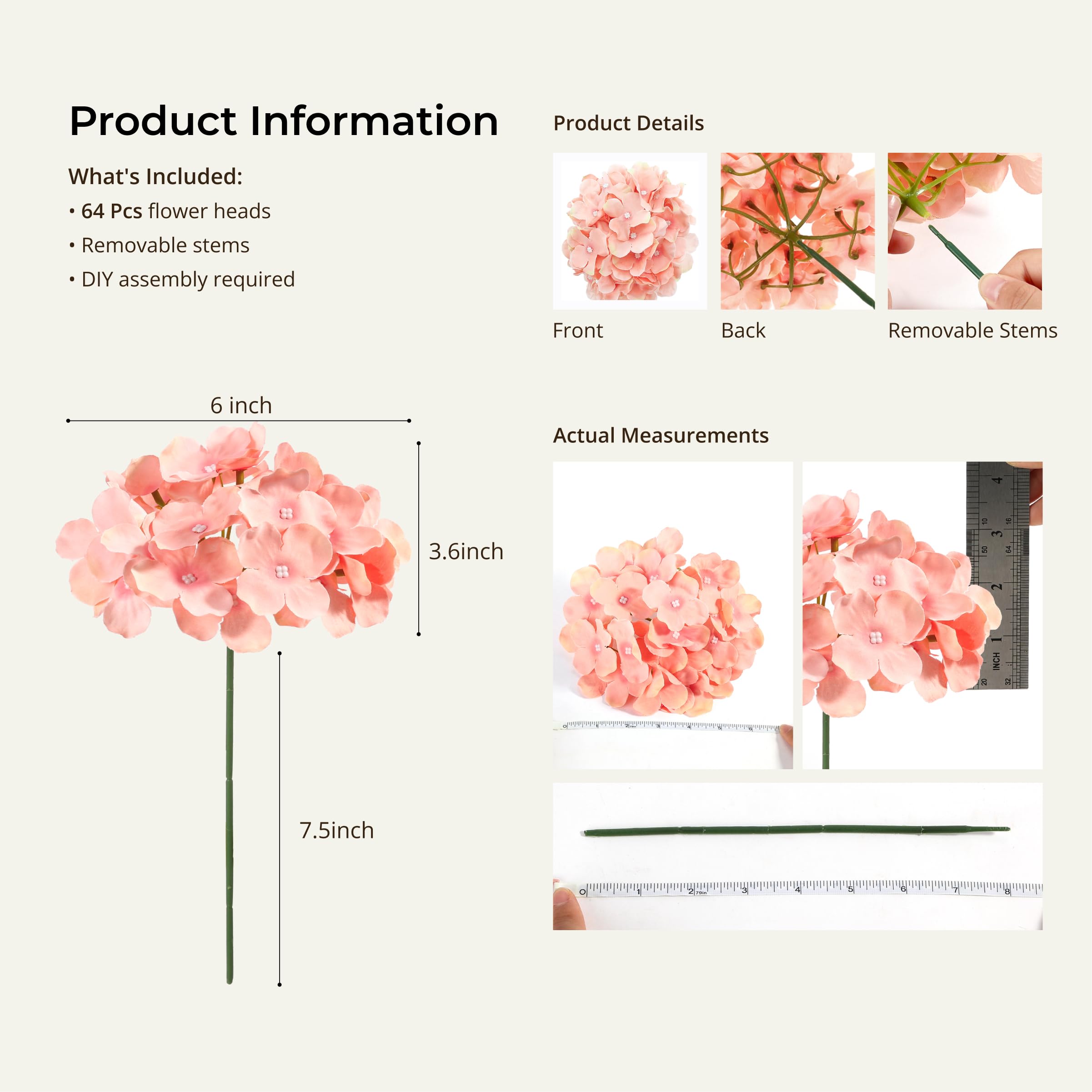 64PCS Light Peach Hydrangea Flowers: You will get 64pcs rubber pink artificial flower heads and 64 pcs stems, enough quantity to meet your needs in daily life or on important occasions. Note: Flowers and stems are separate and need to be installed yourselves