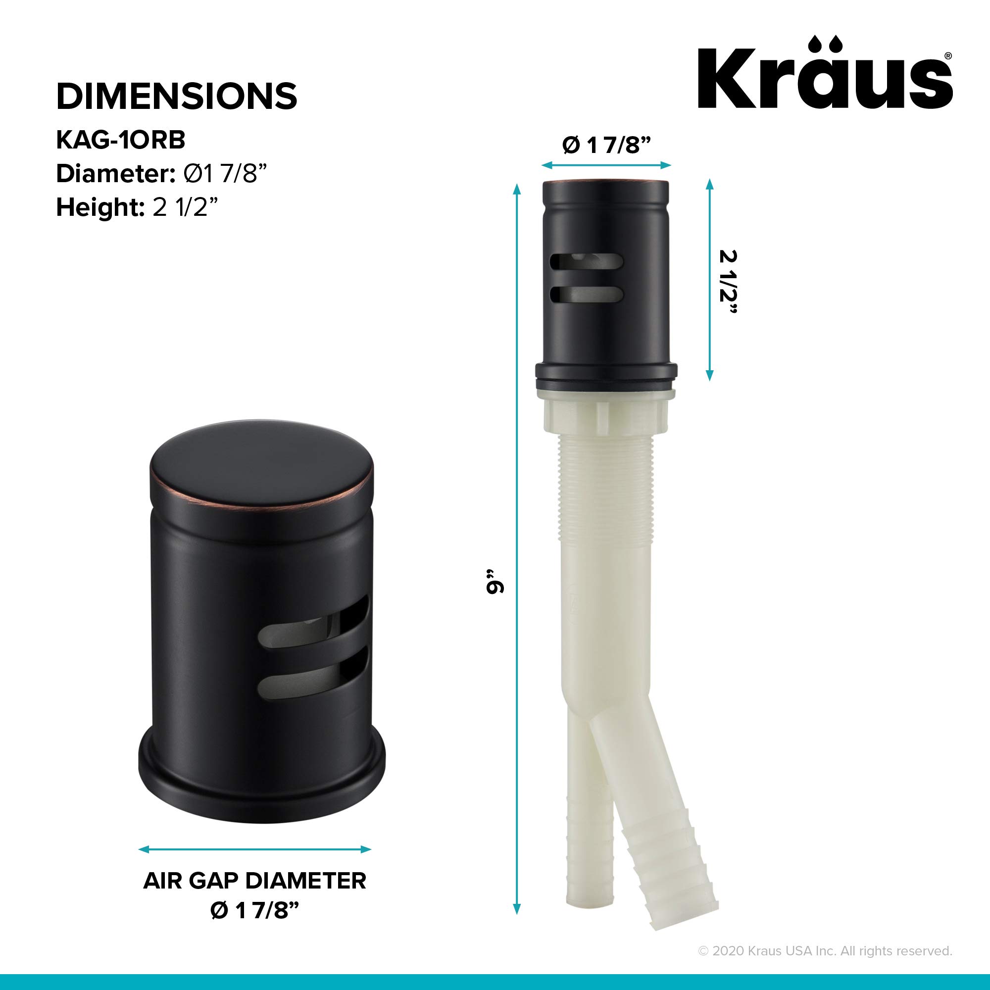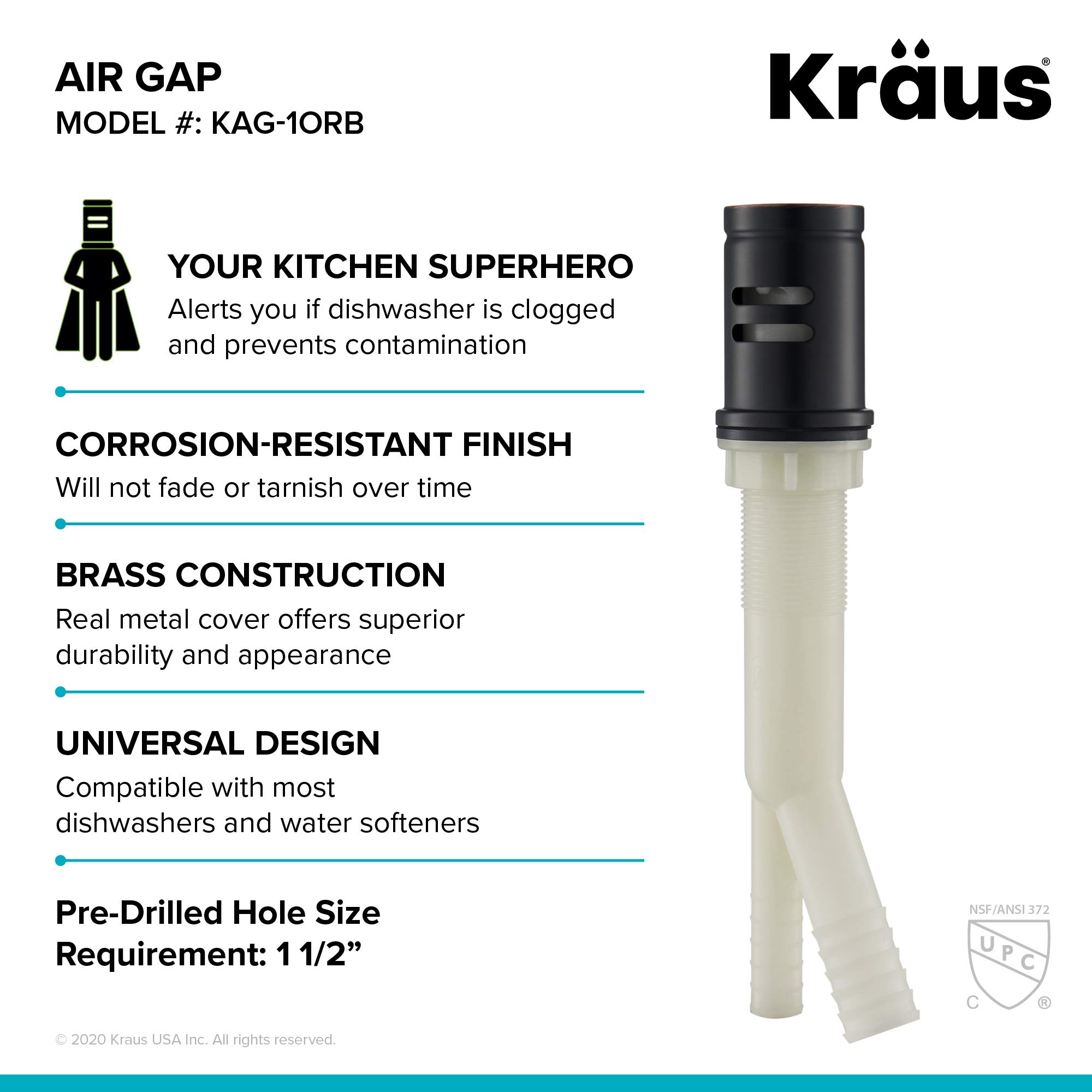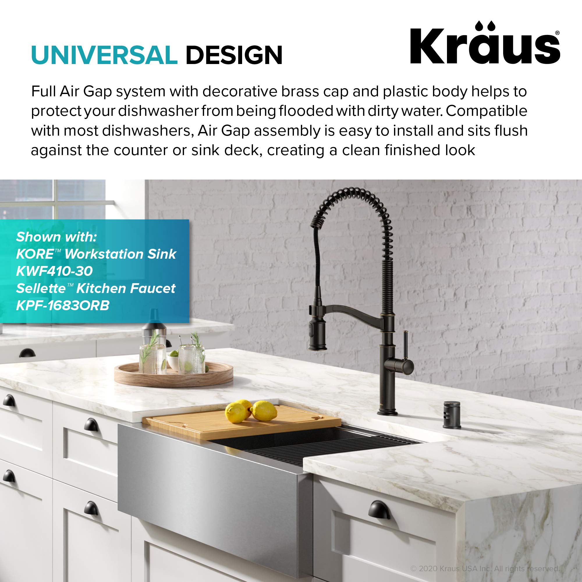 Product Description Keep your dishwasher free from contamination with the KRAUS Air Gap kit. Required by plumbing codes in many states, an air gap is the best way to prevent your dishwasher from being flooded with dirty water. This kit includes an air gap body made of durable ABS plastic and a solid brass cap built for maximum durability with a high-end feel. The cover installs flush to the sink deck or countertop, creating a clean look. The cover comes in a variety of corrosion-resistant finishes to match your kitchen faucet. Detailed instructions are included for easy installation and worry-free use. From the Manufacturer With a long history of manufacturing exceptional kitchen and bathroom products, we at KRAUS believe in the power of design to transform ordinary environments into beautiful spaces. Our goal is to deliver the highest value possible for our customers, providing innovative fixtures at approachable prices. We want to empower consumers, allowing them to transform their homes with intuitive designs and easy-to install products that are built for a lifetime of use. We strive to continuously raise the bar in terms of quality, function, and design. Transform your kitchen and bath with KRAUS, and experience Innovation for Real Life.