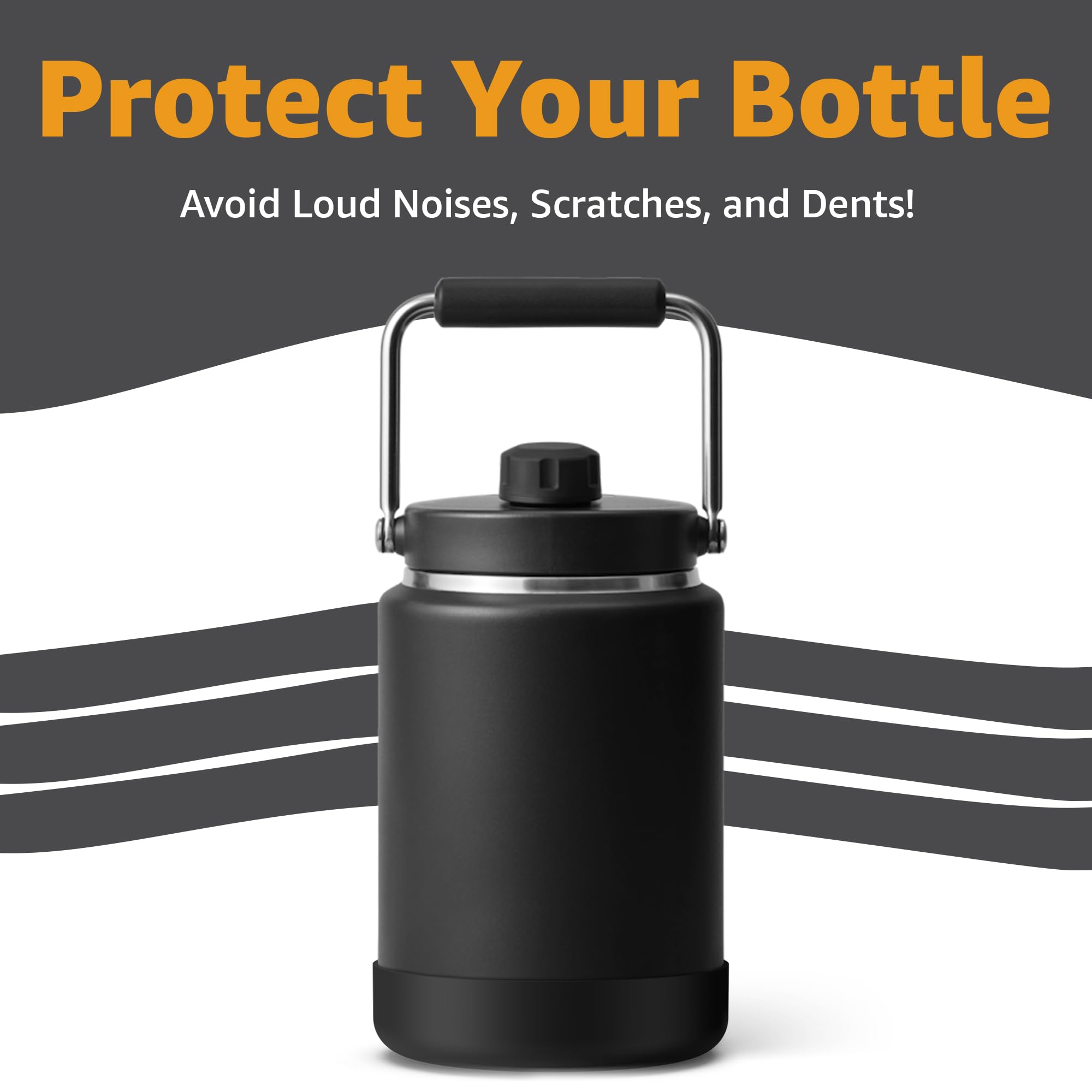 Compatibility: Designed for Yeti Rambler and Iron Flask one-gallon jugs. Our half-gallon option is exclusively for Yeti half-gallon only, ensuring a precise fit that accommodates. Enhanced Protection: Shields against scratches, dings, and everyday wear, preserving your jug’s condition at the spot it needs it the most. Anti-Slip material for stability on various surfaces. Sleek Design: The slim black profile is a functional and minimal accessory, it will perfectly match your jug’s aesthetic without adding bulk. Superior Material: Crafted from BPA-free, non-toxic, food-grade silicone that’s resilient, odor-resistant, and weatherproof, delivering dependable quality you can trust. Easy Maintenance: Effortless to clean, simply remove, rinse, or hand wash with soap and water. Dishwasher safe, top-rack only.
