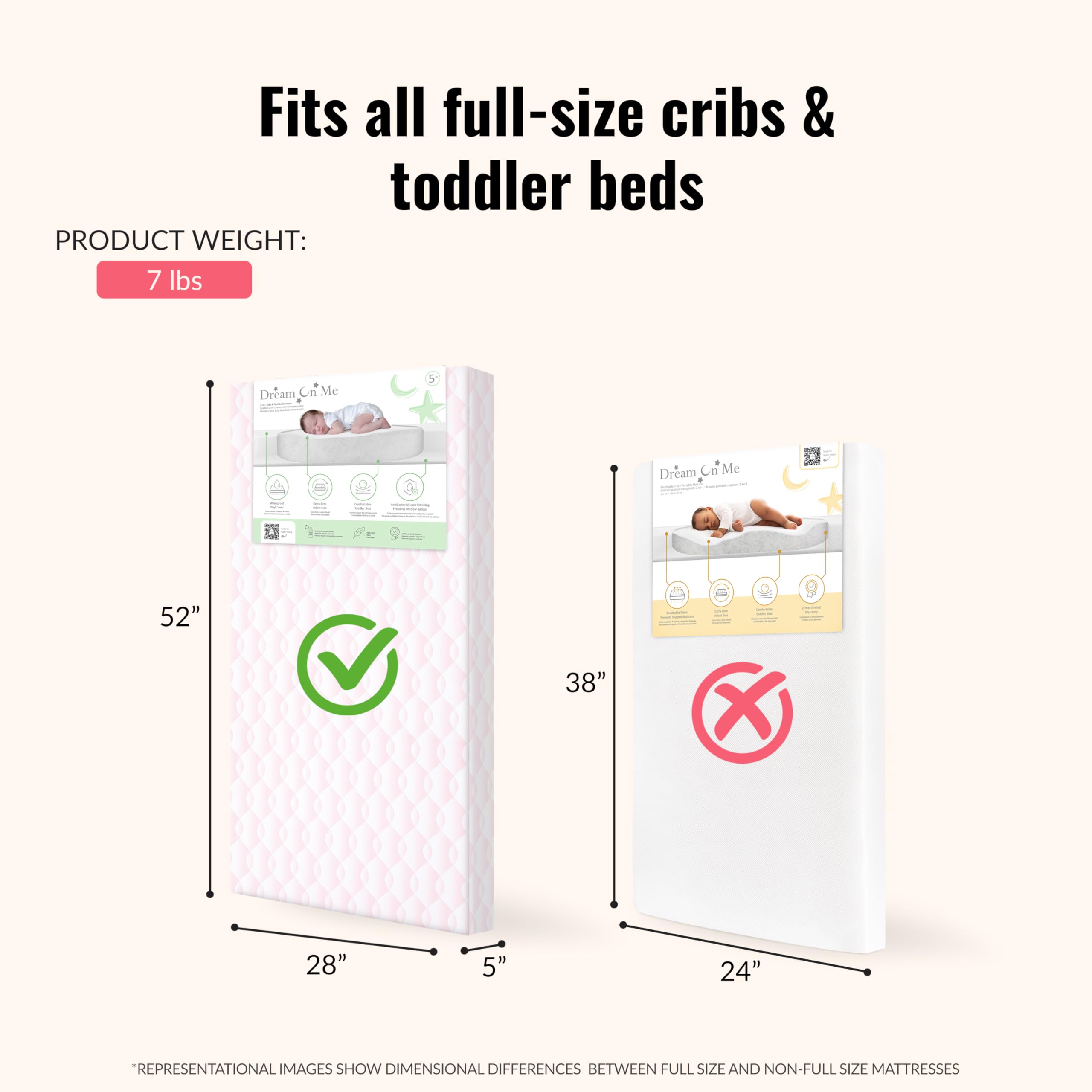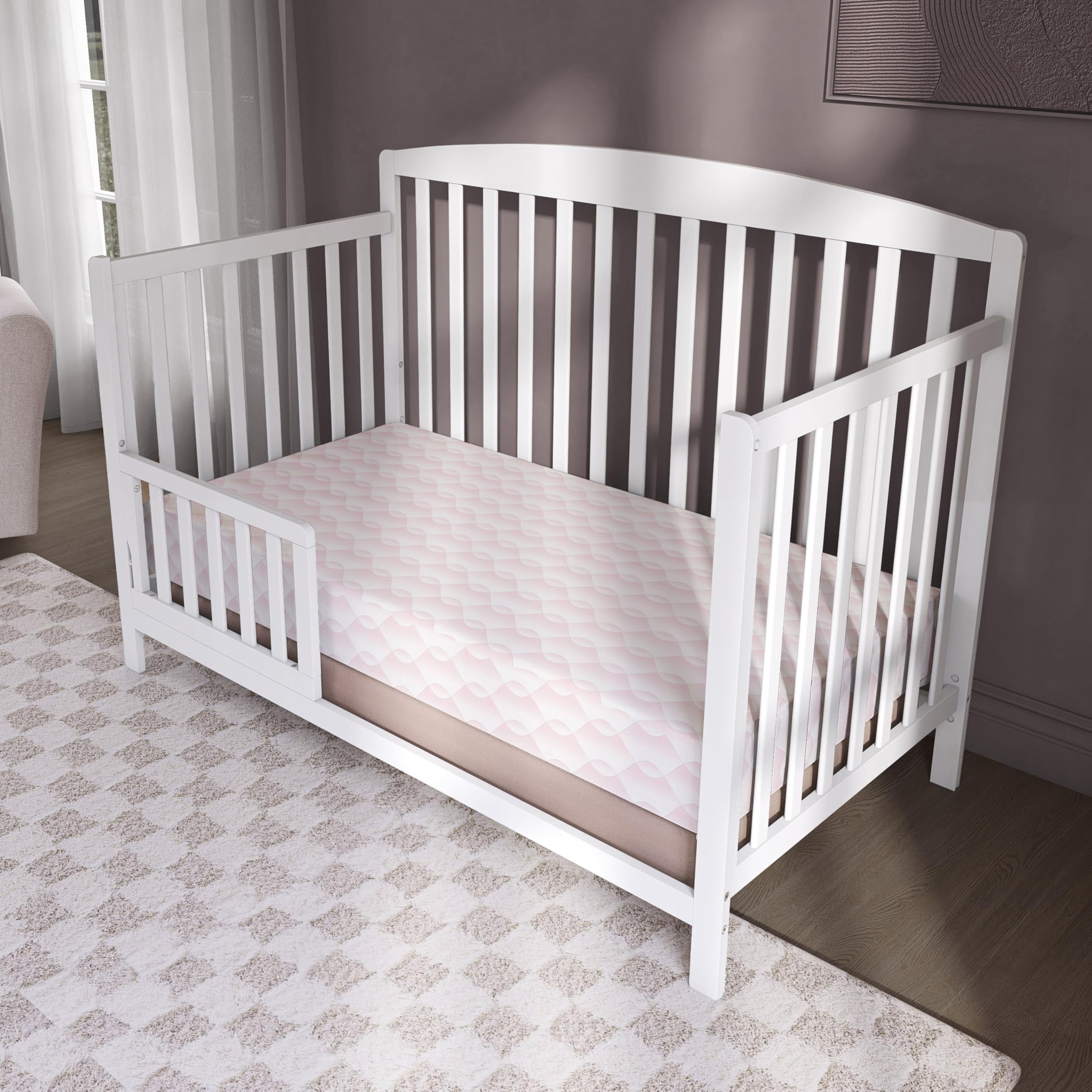 The Dream On Me 2 in 1 Little Lullaby Crib and Toddler Mattress offers the perfect blend of safety, comfort, and eco-conscious design with a dual-sided surface—firm for infants and soft for toddlers—wrapped in a waterproof vinyl cover that’s easy to clean. It’s made from 5 inches of fiber containing 75% recycled materials and features anti-bacterial lock stitching for added protection. This mattress meets the highest safety standards, including Greenguard Gold and BSA certifications. Lightweight and durable, it comes with a 5-year limited warranty for your peace of mind.