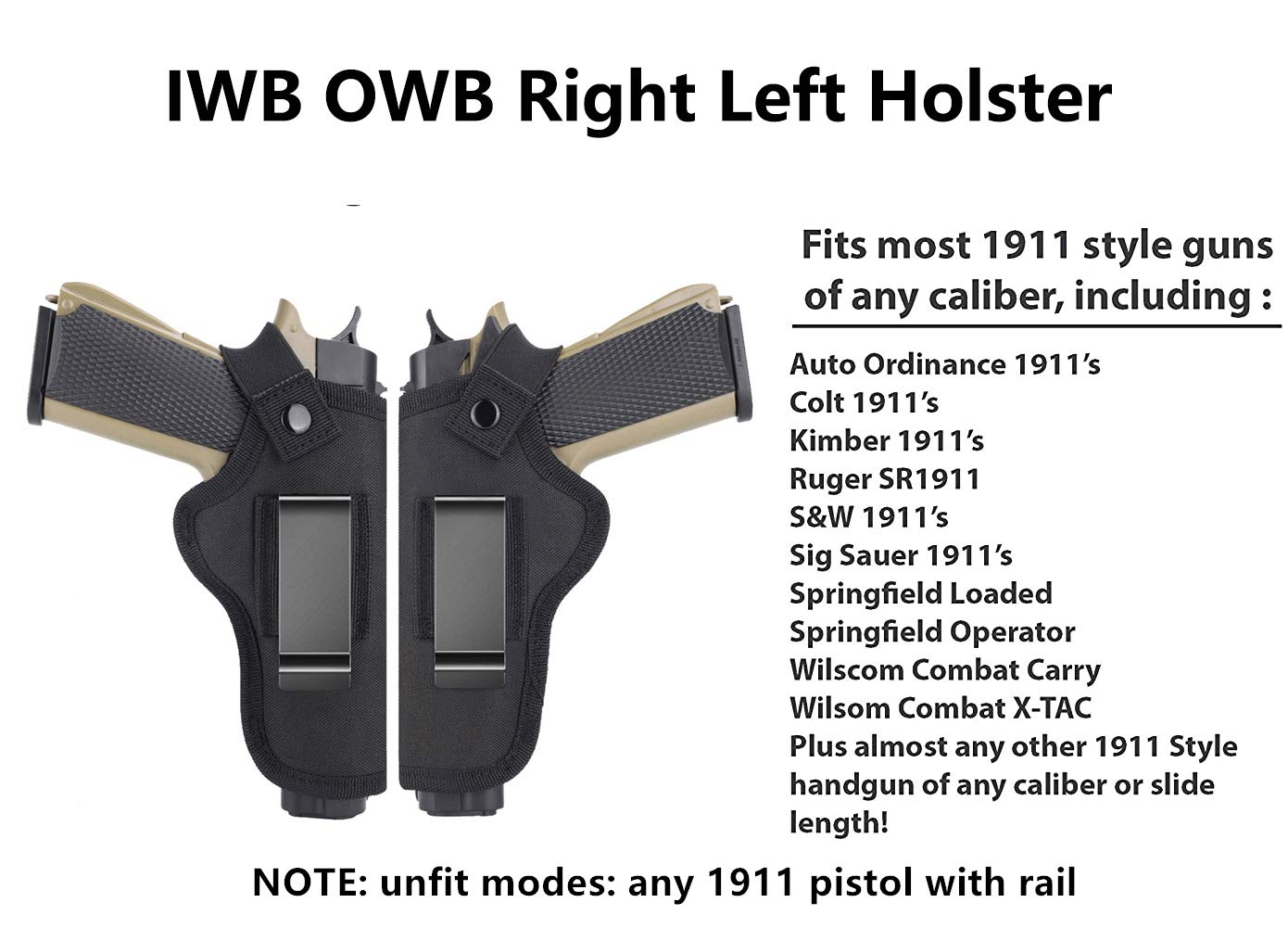 IWB OWB holster fits most 1911 style handguns with any battel lenght! 1: The IWB Holster offers classic craftsmanship, combining function, comfort, and durability. Hand made from heavy - duty nylon. 2: The holster is the ultimate “inside the waist band” concealed carry holster. This comfortable, form-fitting holster is built to last while providing maximum protection, and letting you enjoy day-in, day-out comfort and performance for as long as you own it. 3: The IWB OWB holster is designed for optimum concealment and ease of access when most needed. The firearms you carry are indispensable, and will be needed at a crucial time. Feel confident wearing tactical IWB OWB holster. Fits Nearly Every 1911 Style Handgun Including: AMT Backup | Auto Ordinance 1911s | Browning 1911s | Colt 1911s | Dan Wesson 1911s | Kimber 1911s | Remington 1911s | Rock Island 1911s | S & W 1911s | Sig Sauer C3 | Sig Sauer TacOps | Springfield EMP | Springfield Operator | Wilson Combat X-Tac, Tactical Carry | Plus many more! Any questions or suggestions, please contact us