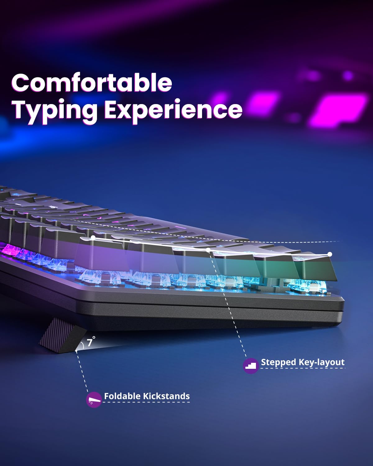 【Brilliant RGB Illumination】16 preset backlights set the perfect mood. Adjust speed and brightness (5 levels) for a comfortable day or night environment. Double injection PBT keycaps ensure clear lighting and accurate typing. Ideal for late work or immersive gaming.