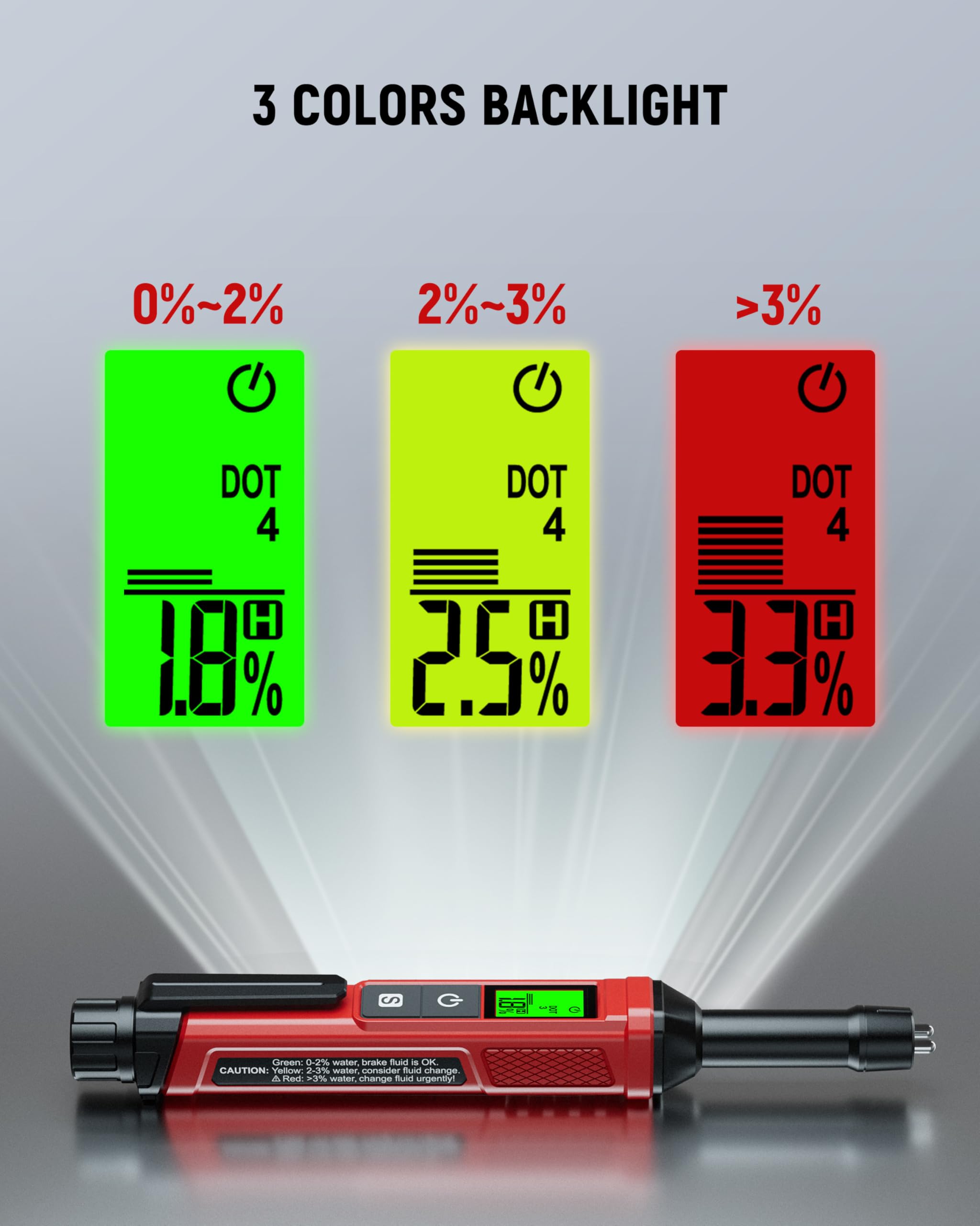 Convenient Features : The brake fluid level sensor includes a data hold function, allowing you to capture and review readings easily. It also features a three-color backlight and buzzer alarm function, which will sound an alarm to remind you to change the brake fluid immediately when the humidity level exceeds the safety limit of 3%, providing additional convenience and safety