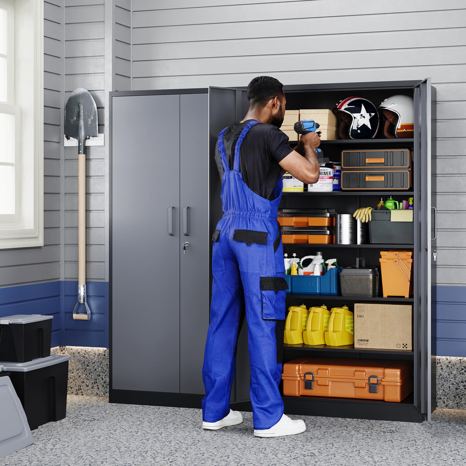 『HIGH QUALITY MATERIAL』:Whole-in-one reinforced heavy duty metal frame, load capacity up to 180lbs per shelf solid and strong.Environmental protection powder, scratch resistance and rust-resistance.Our metal storage cabinets are made of heavy gauge cold-rolled steel plate, sturdy and durable