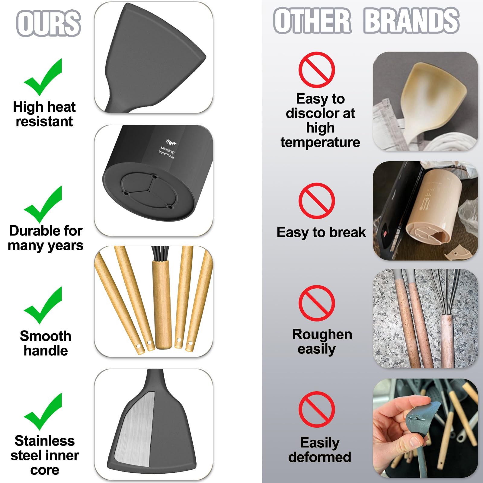 HEAT-RESISTANT, NON-MELTING-SOFT SILICONE One of the best things about Umite Chef silicone cooking utensils is their ability to withstand heat safely, each kitchen gadgetsl is heat-resistant up to a whopping 446°F and won’t melt (even leave it in the pot for a while) and our utensils head won't even become knicked or warped even at those extreme temperatures. The soft silicone won’t scratch non-stick cookware or your expensive pans