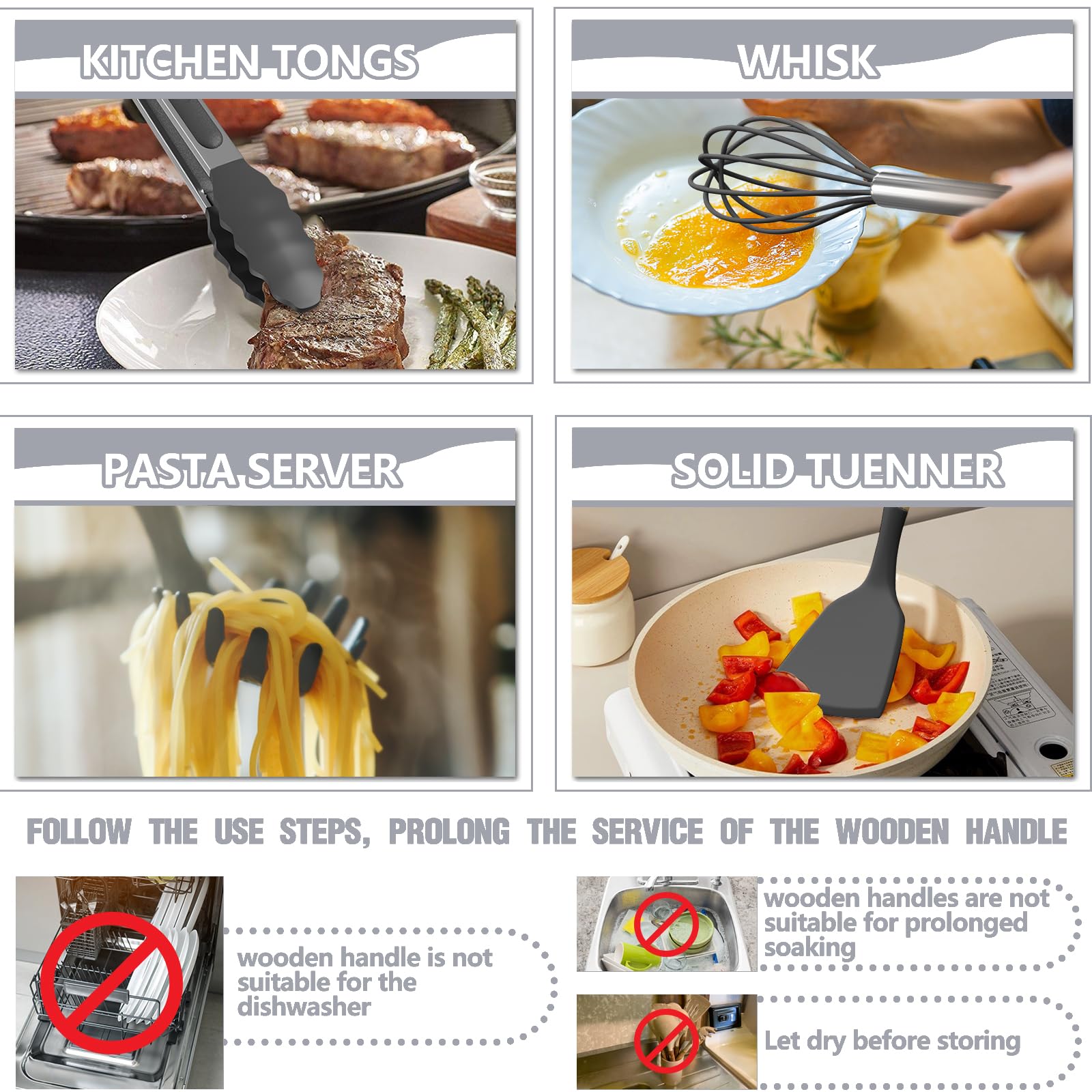 VINTAGE WOODEN HANDLE -EASY TO CLEAN: Each wooden handle is made of solid wood which is anti scalding. Smooth and comfortable to the touch, it completely prevents the heat transfer during the cooking process. Please note that each wooden handle has a slightly different color and texture. The one-piece design eliminates any gaps where food can get trapped, making cleaning a breeze. PLEASE NOTE that due to the wooden handle, We don't recommend soaking in water for a long time or dishwasher cleaning