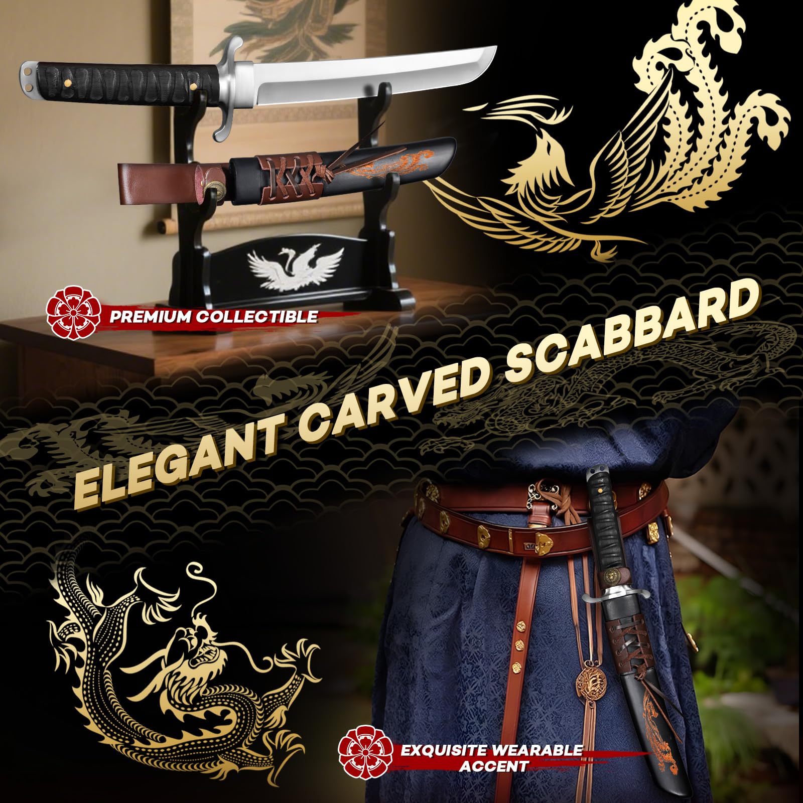【Exquisite Carved Sheath】 Paired with a thick, solid carved wood sheath, this tanto knife is securely protected with a snug fit that ensures both safety and quick access. The intricately carved dragon-and-phoenix motif transforms the sheath into a true work of art—an elegant accessory when worn and a stunning collectible when displayed at home(No Holder). A perfect fusion of protection and refined beauty.