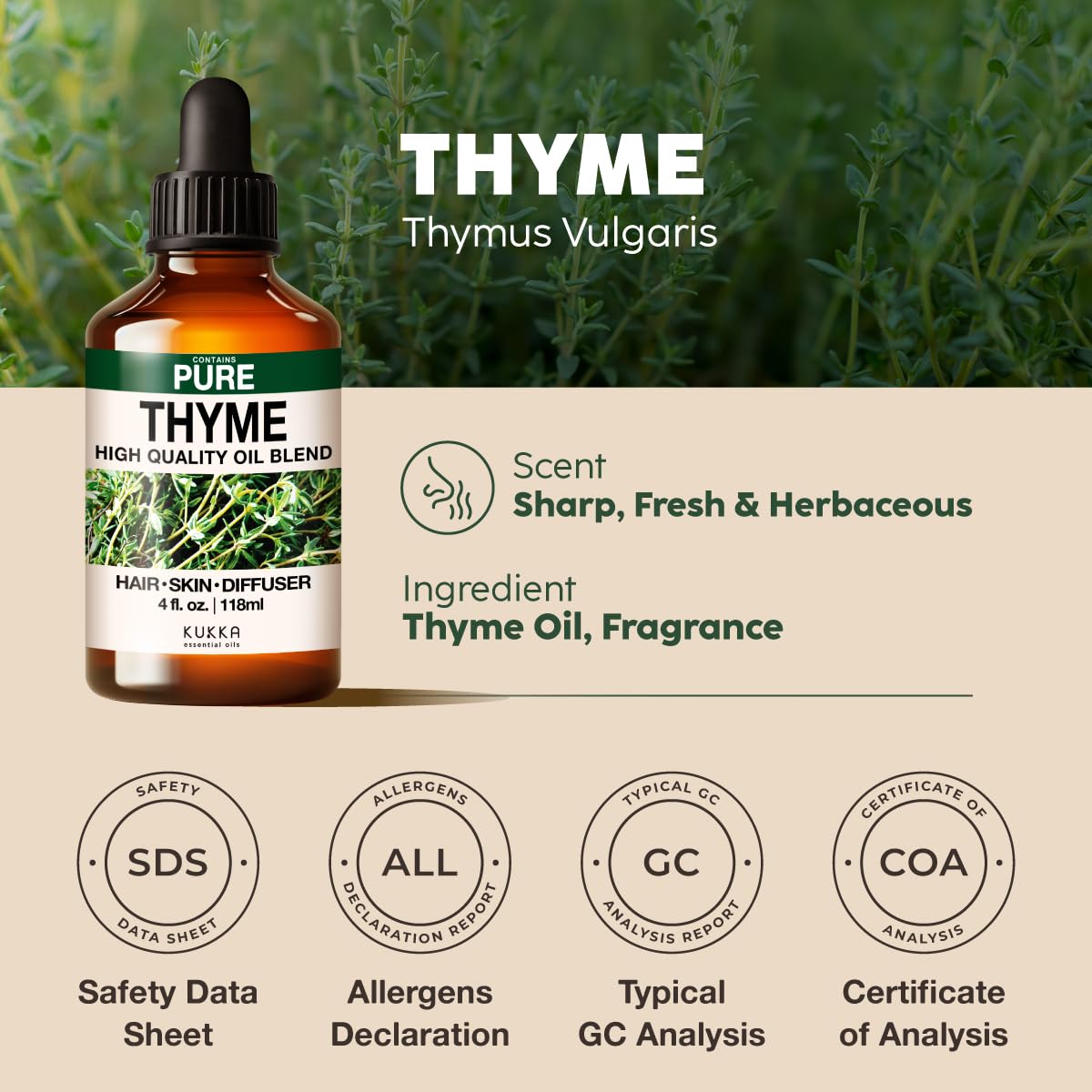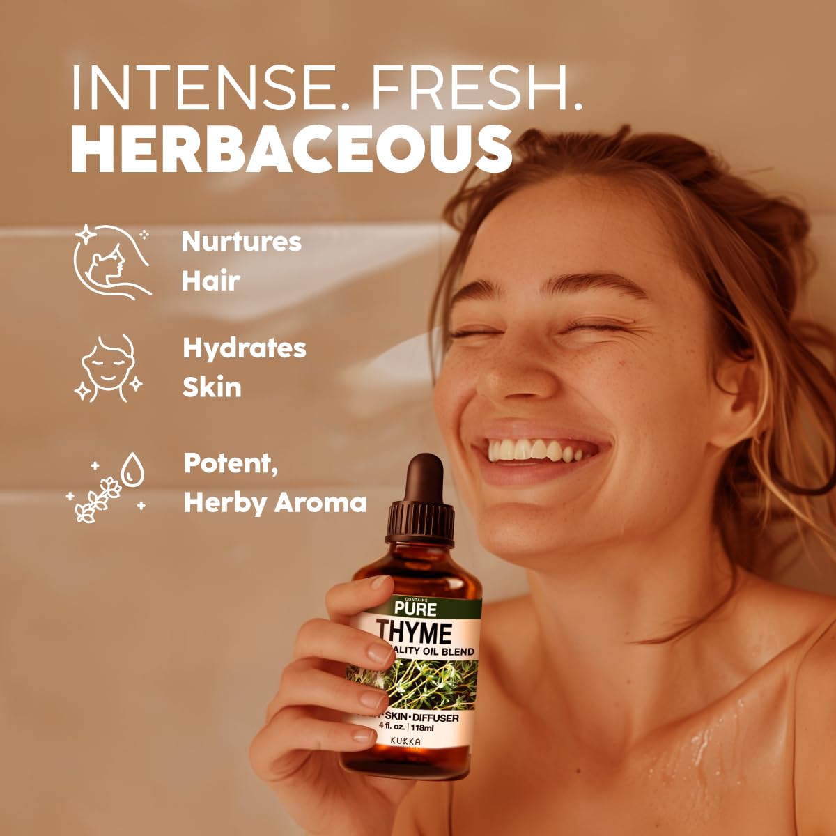 Perfect for aromatherapy use. Thyme oil has a fresh and herbaceous aroma that is perfect for refreshing any space. A little goes a long way — diffuse 2-3 drops of thyme essential oil in a diffuser to enjoy its aroma.