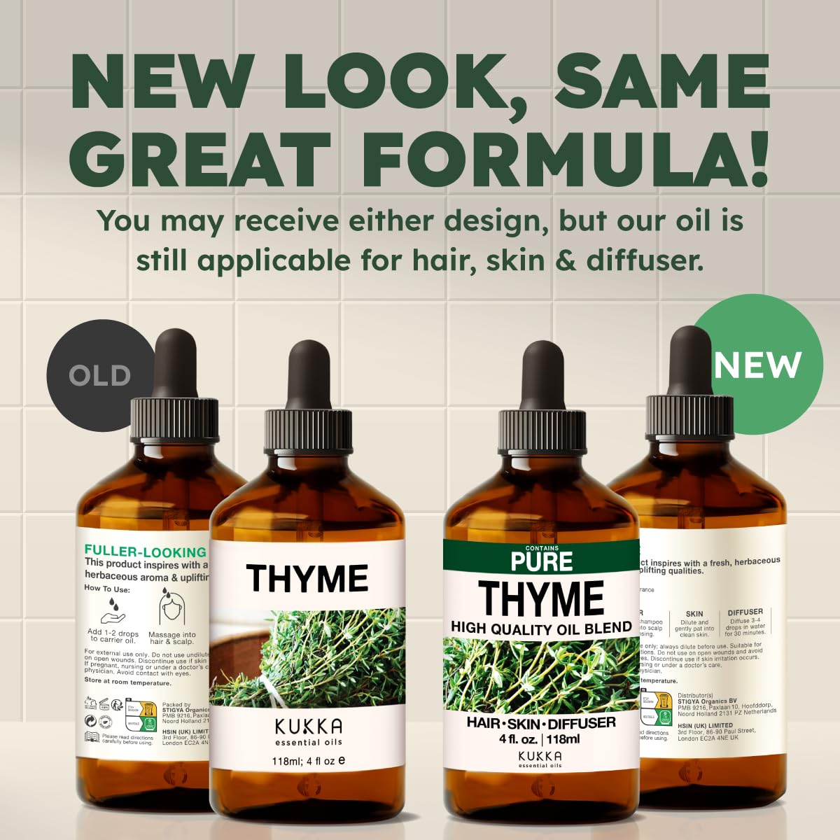 Thyme essential oil for hair. A must-have for hair care, thyme oil for hair may promote the appearance of fuller-looking hair. Craft a customized thyme hair oil by mixing a few drops with carrier oil before massaging into the hair and scalp.