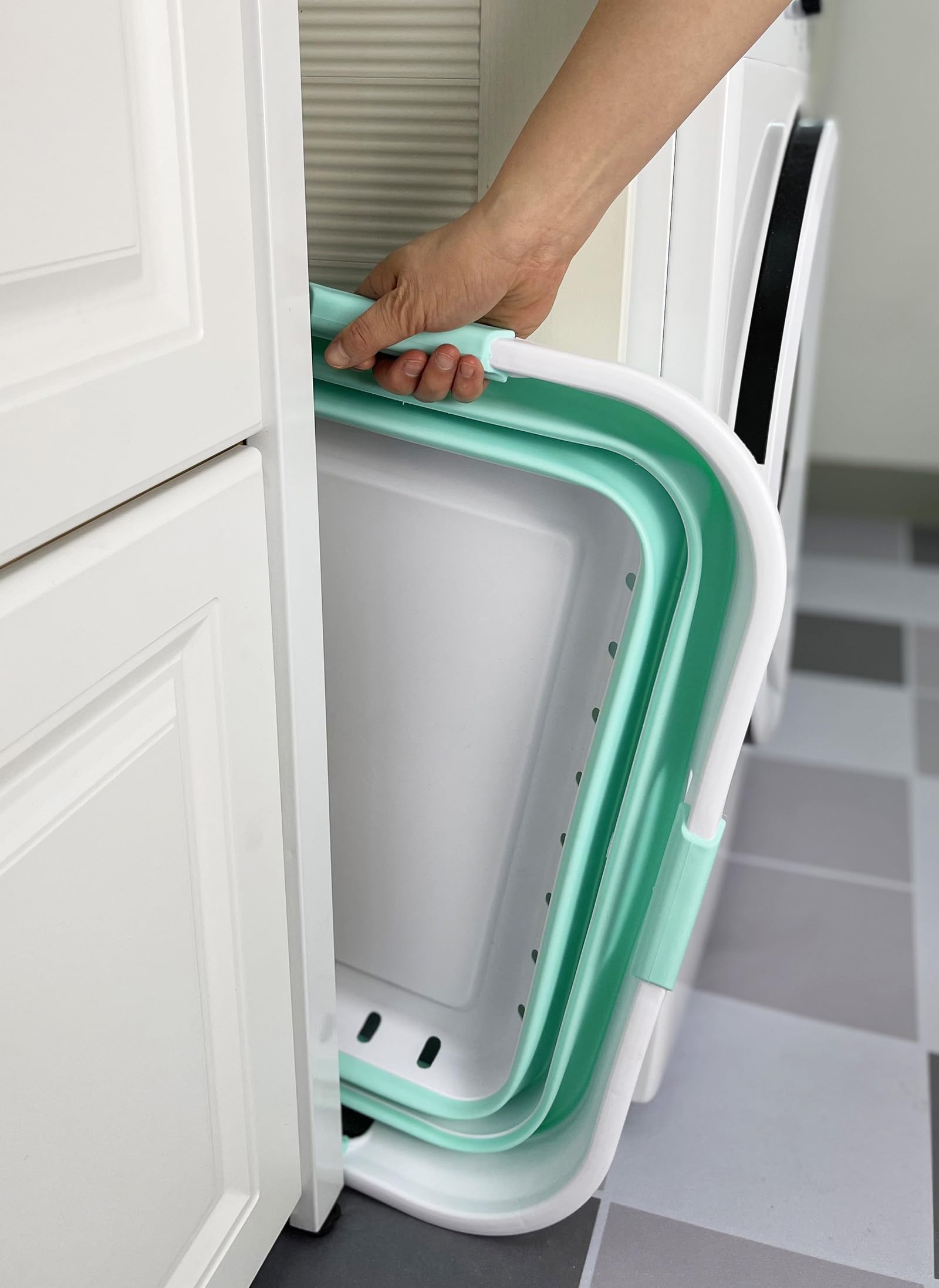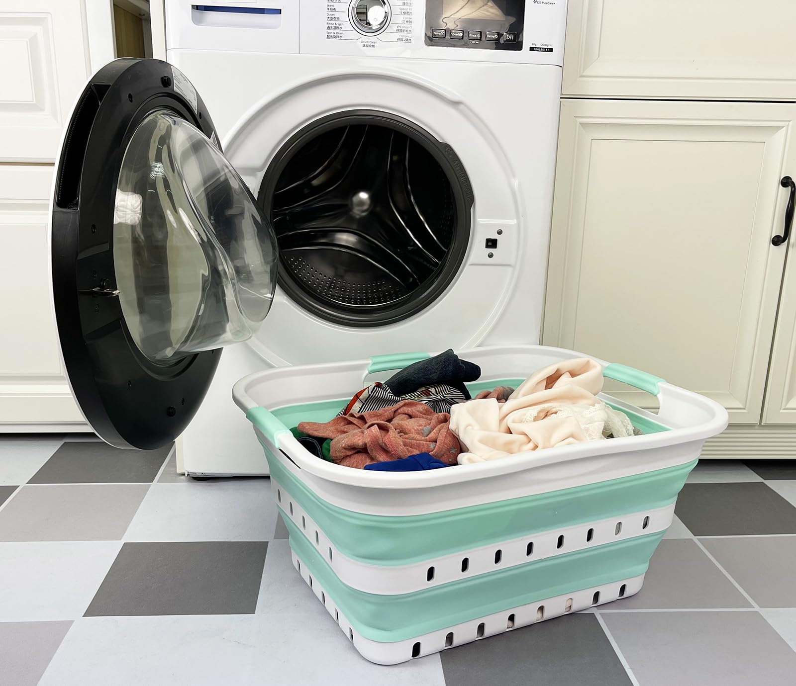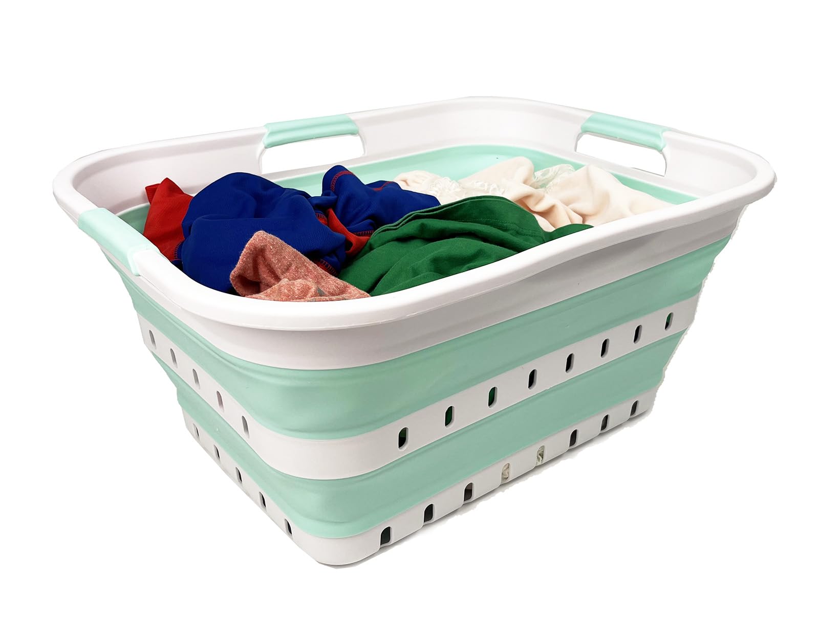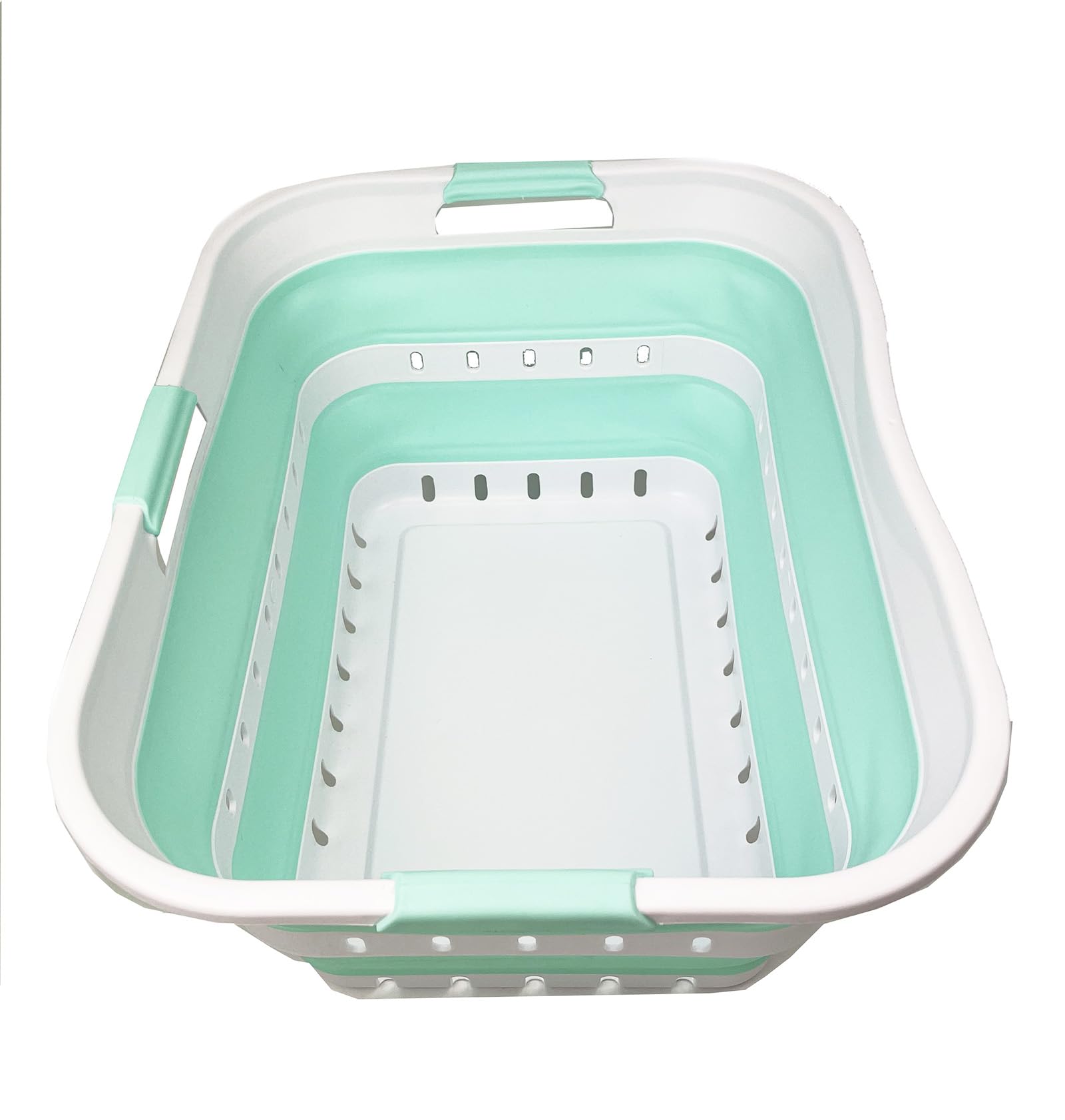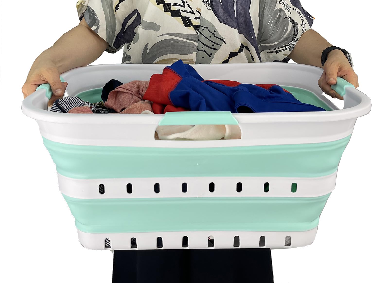 BPA Free. Comfort grip handles for easy carry. User friendly by simply pop-up to open when using and collapses to flat for space saving