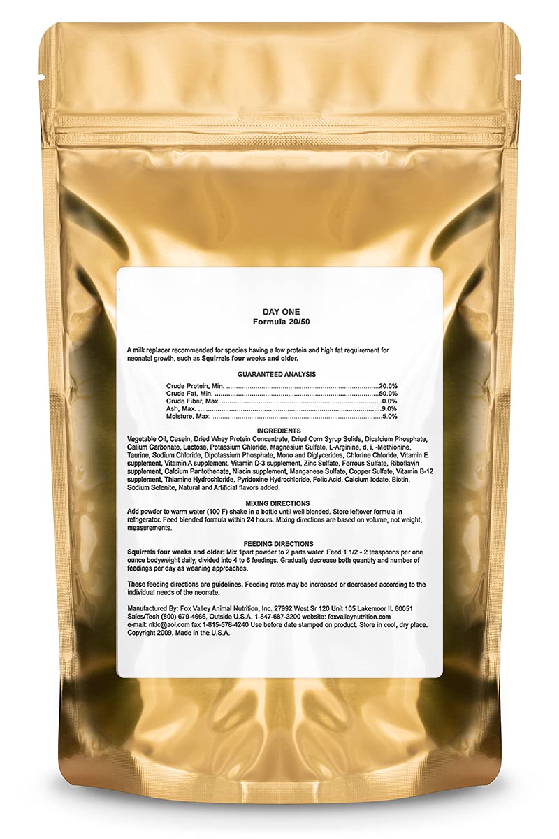 The best option for baby squirrels from 4 weeks of age through weaning. Fox Valley Formula 20/50 is also ideal for flying squirrels, rats, and mice. This rehabber-approved powdered milk formula produces better weight gain, fewer digestive problems, and better acceptance than other formulas. Fox Valley Formula 20/50 mixes easily, smells wonderful, and there is no need to supplement the formula with any added cream, yogurt, or probiotics.