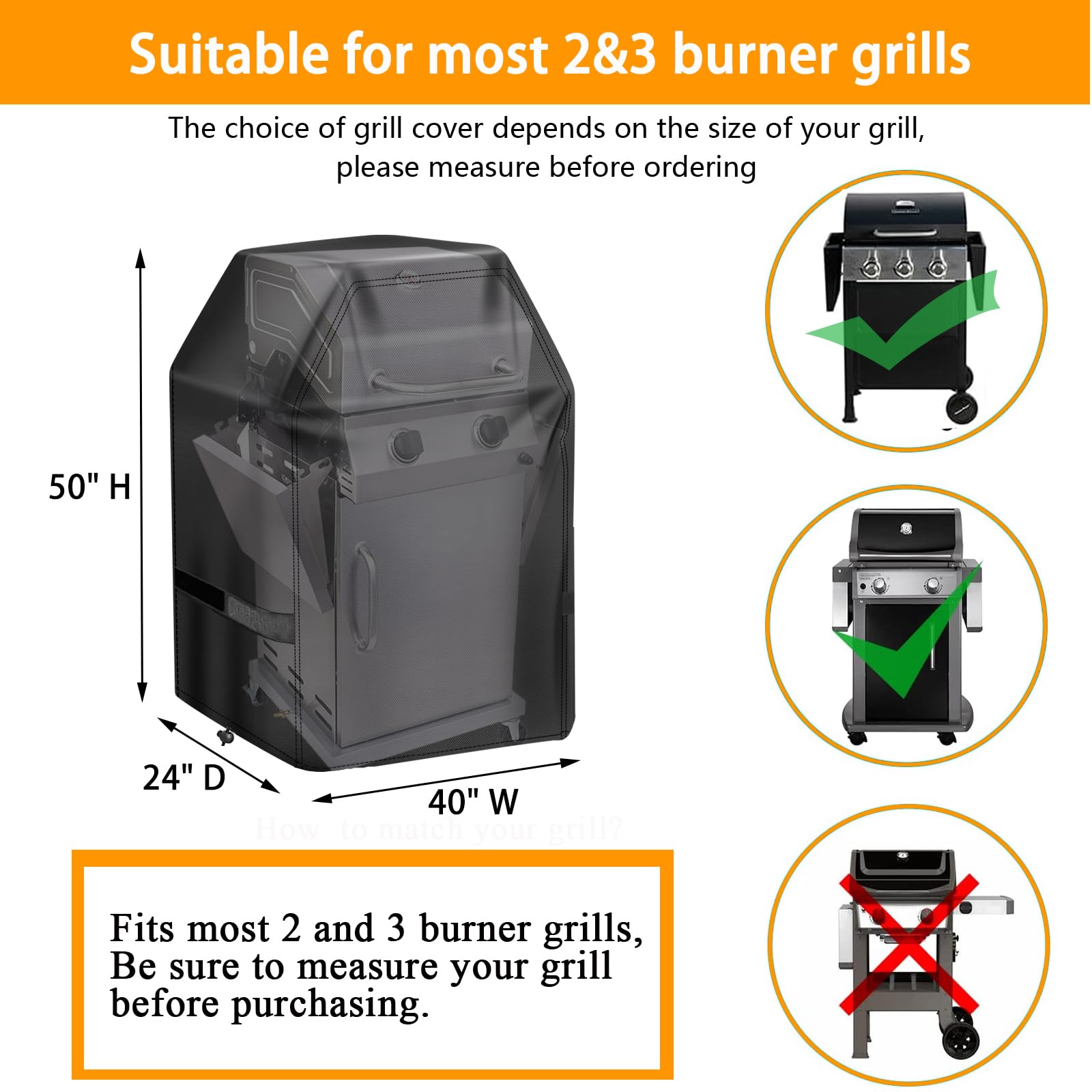 【Dimension】- L x W x H: 40 x 24 x 50 inches, Fits most 2&3 burner grills with side shelves down up to 40'' wide. The choice of grill cover depends on the size of your barbecue grill, Be sure to measure your grill before purchasing.