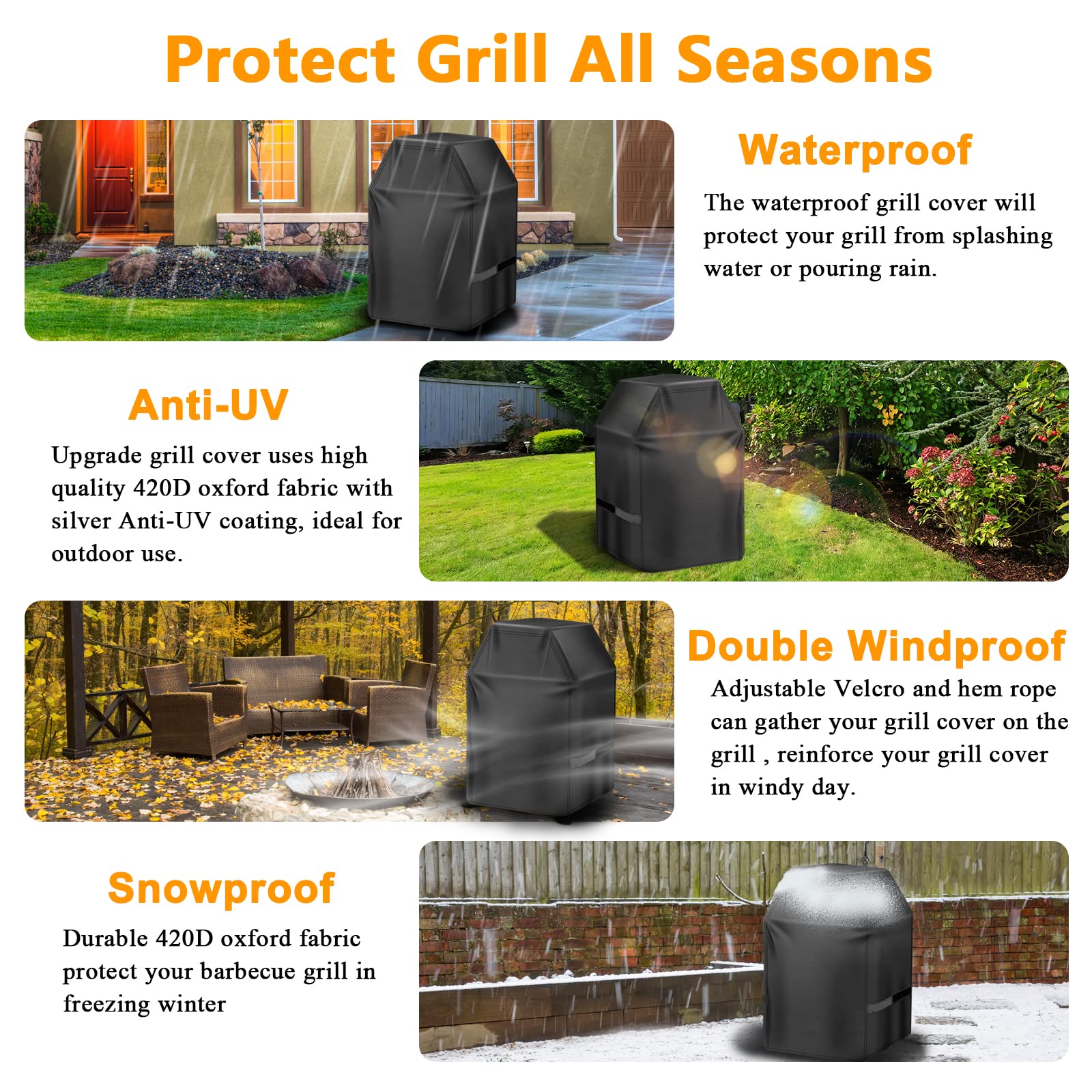 【Waterproof & Snowproof & Anti-UV】- Made of upgraded fabric,the grill cover exhibits superior colorfastness, resists UV, repels rain, resists tears and cold cracking, durable and long-lasting, gives your grill all year round protection against sun, rain, snow, hail, wind, dust, dirt and etc.