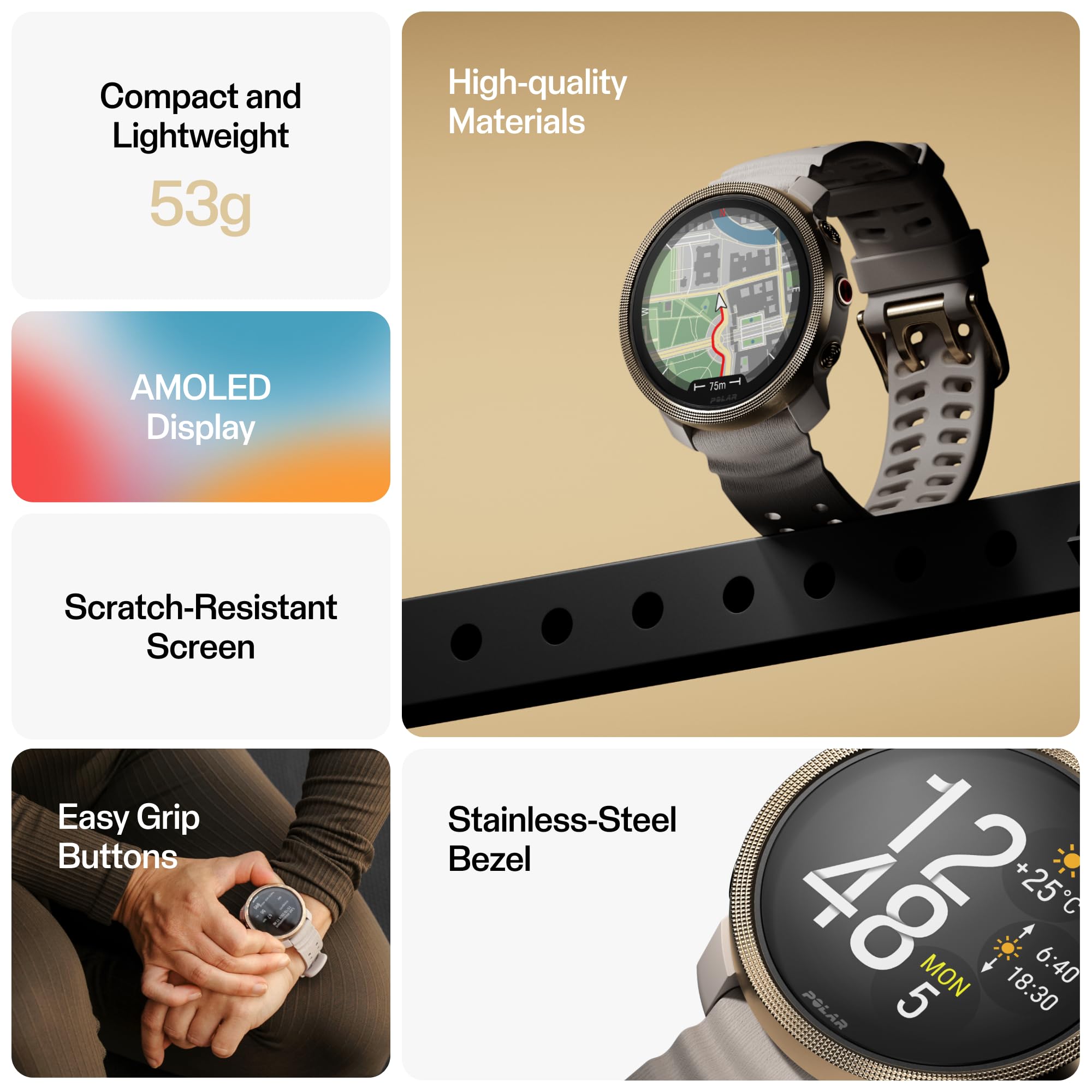 [AMOLED Display & Durability] Features a 1.28” AMOLED touchscreen with Gorilla Glass 3, ensuring scratch resistance and high visibility. Lightweight at 53g and water-resistant up to 50m, ideal for all sports conditions.