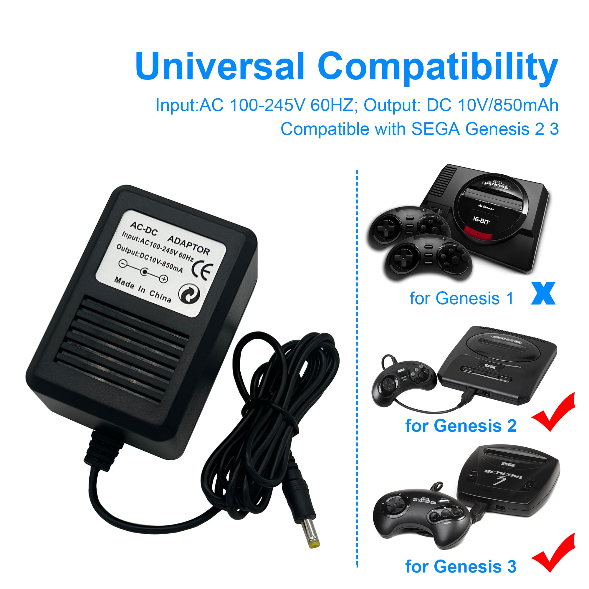 Product Features: This replacement power supply for Genesis 2 3. Make your old console continue the fun and excitement. Essential replacement for your lost, damaged, or faulty power supply. It works perfectly and protects your console from Overcharge protection, overvoltage protection, overcurrent protection, and short circuit protection. Widely Compatible: Power supply compatible with Sega Genesis 2 (Model 1631), Genesis 3 (Model 1461). NOT fit for the first original Genesis 1 ( Big volume button ) Product Specifications: Color: Black Material: Metal+Plastic Input: AC 100-245V 60HZ Output: DC 10V/850mAh Plug Type: US Plug Package Contents: 1 x Power Supply Promise: We offer 18-month quality assurance for all products, providing lifelong technical support, with no worry about using it. Warm Notice: 1. Dry location use only. 2. Please keep it away from children. 3. Our charger has power protection, but we suggest not to overcharge for a long time.