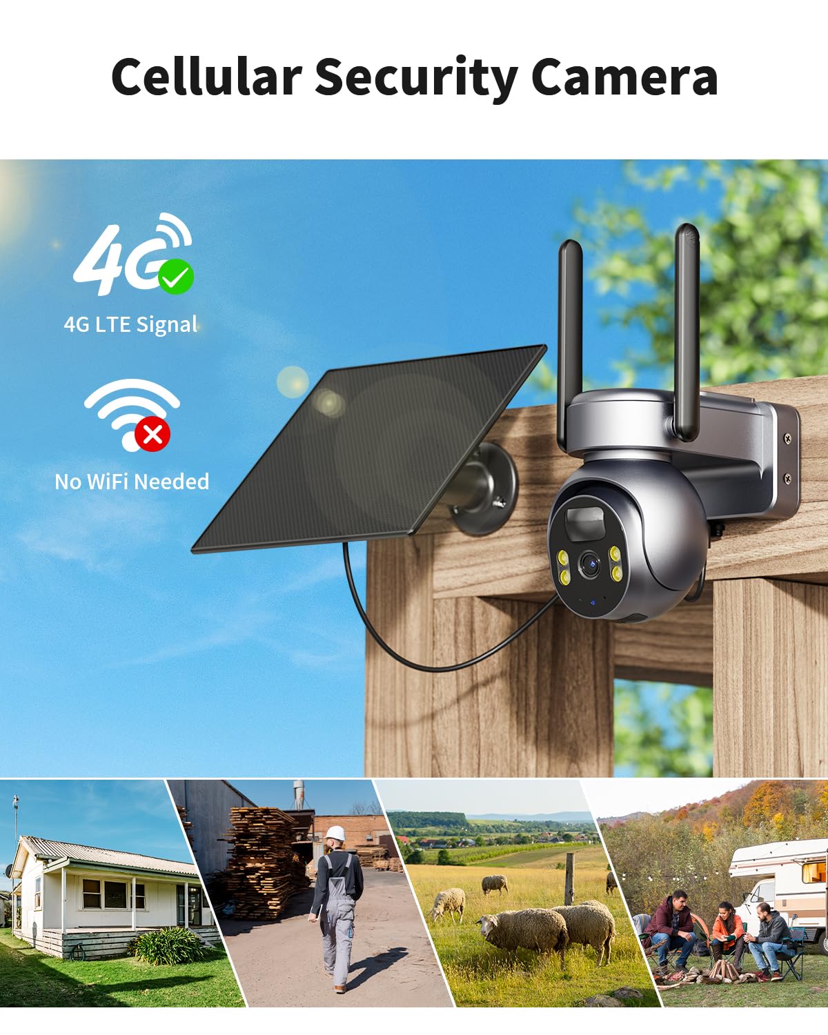 For Anywhere Without WiFi or Electrical Power: The 4g lte solar cellular security camera wireless can work anywhere without WiFi or electrical power, it is the perfect choice for security monitoring and remote control in farms, ranches, construction sites, jobsite, warehouses, vacation homes, camping, wilderness. Note: The 4g camera doesn't support WiFi connection