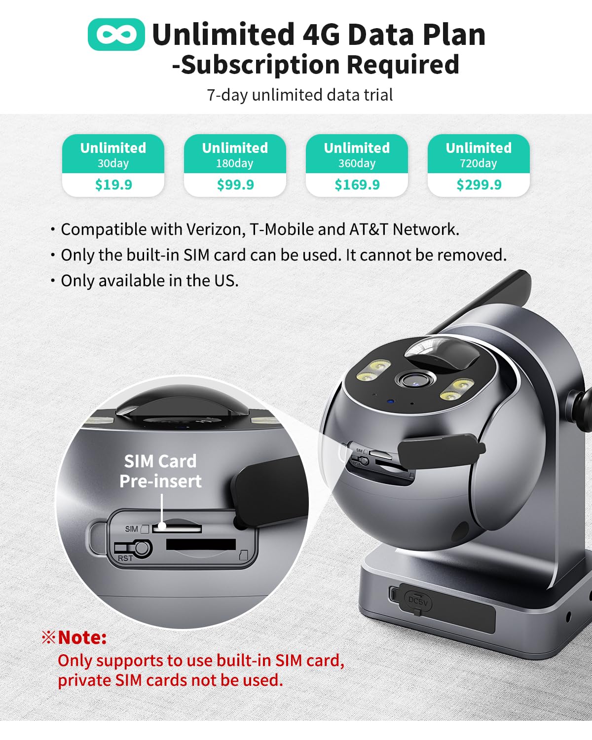 Built-in SIM Card with Unlimited Data Plan - Subscription Required: The 4g security camera outdoor no WiFi needed built-in a 4g SIM card, only supports Verizon, T-Mobile, AT&T networks. We offer 7 days or 300MB trial of cellular data (check in the Ubox app), if you run out of data, you need to purchase a data plan directly from Ubox app. You can get unlimited data for $19.9 30 days and so on. In addition, you also can save video to cloud storage (30-day trial) or local storage (up to 128GB, not included). Note: Private SIM cards can not be used. Only available in the US