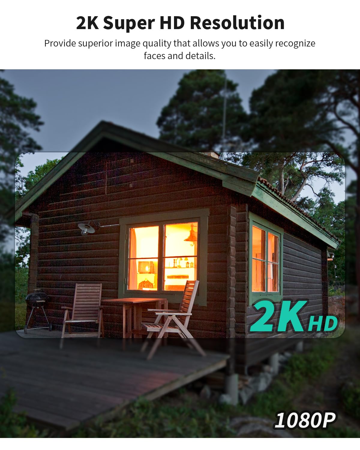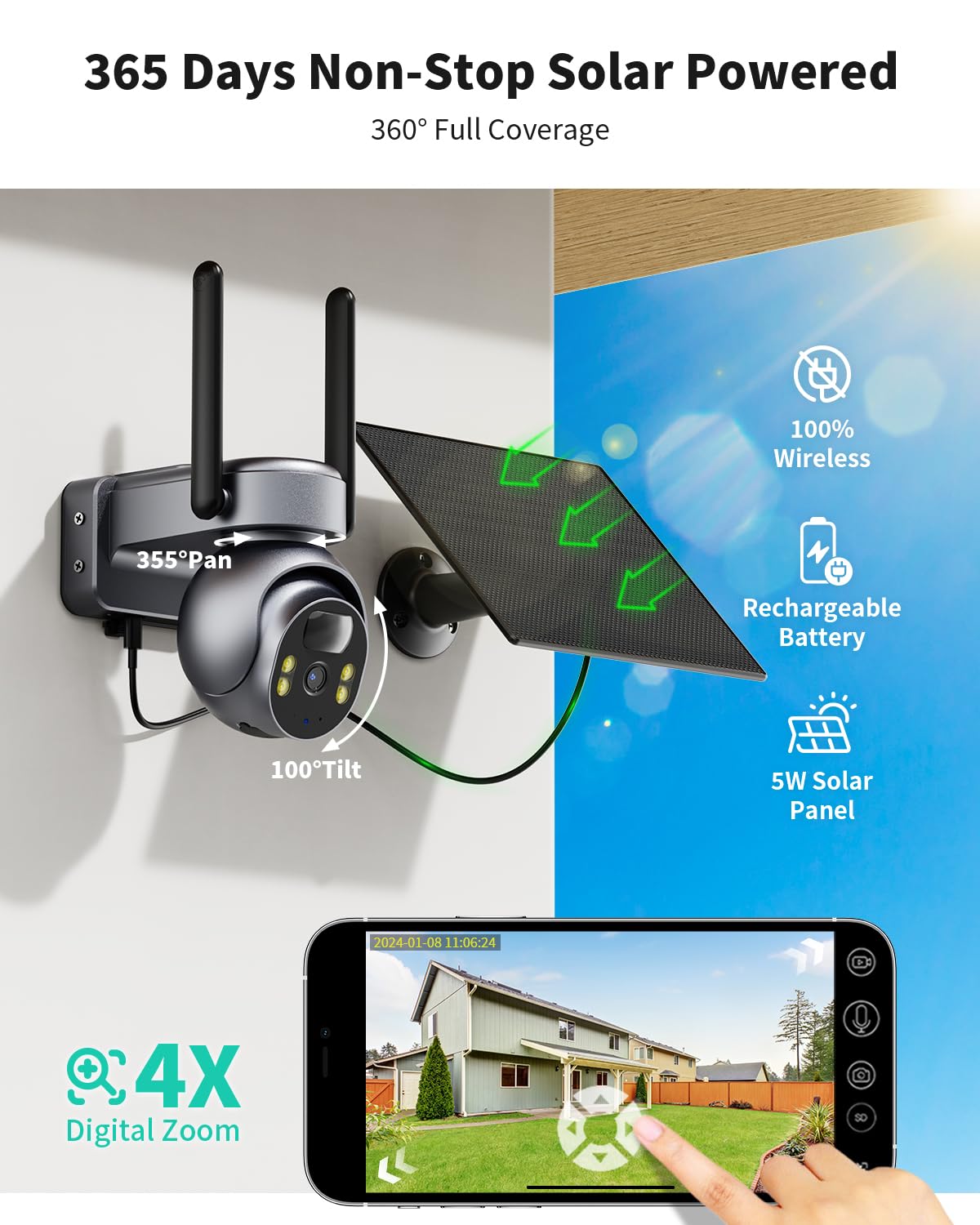 2K Color Night Vision and 360° Live Full View: The no WiFi security camera outdoor features 2K (2304*1296) resolution and spotlight full-color night vision, providing clear images and videos even in darkness and up to 65 feet. The off grid security camera allows for a 360° panoramic view with 355° Pan and 100° Tilt, even if you're not there, you can remotely access the camera via your phone to view live footage