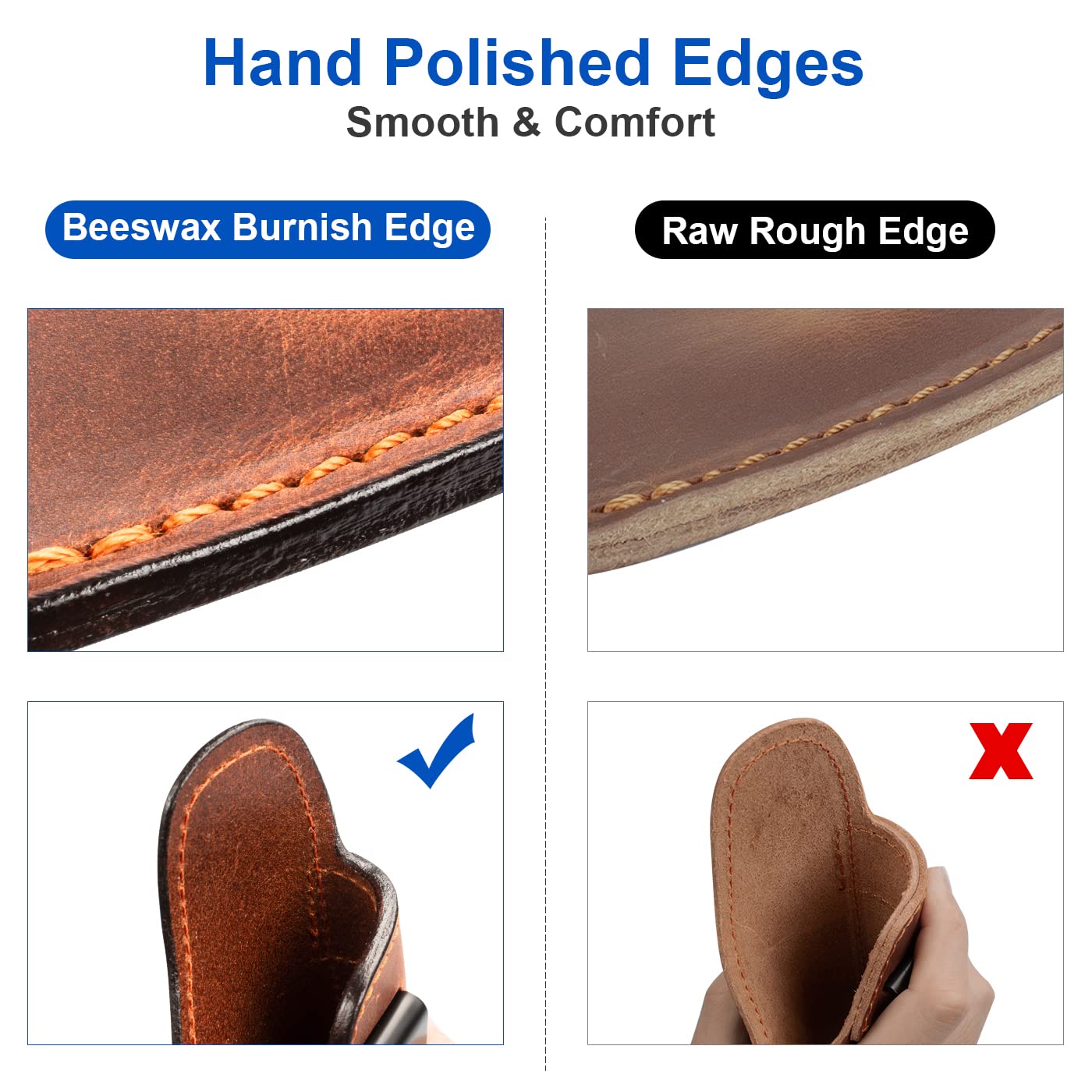 ใCrafted Tight Clean Stitching & Beeswax Burnish Edgesใ Flawless stitching & Full grain leather mean this holster is exquisite, well-crafted and built to last! All edges are burnished with beeswax, which makes the edge smooth, clean and strong.