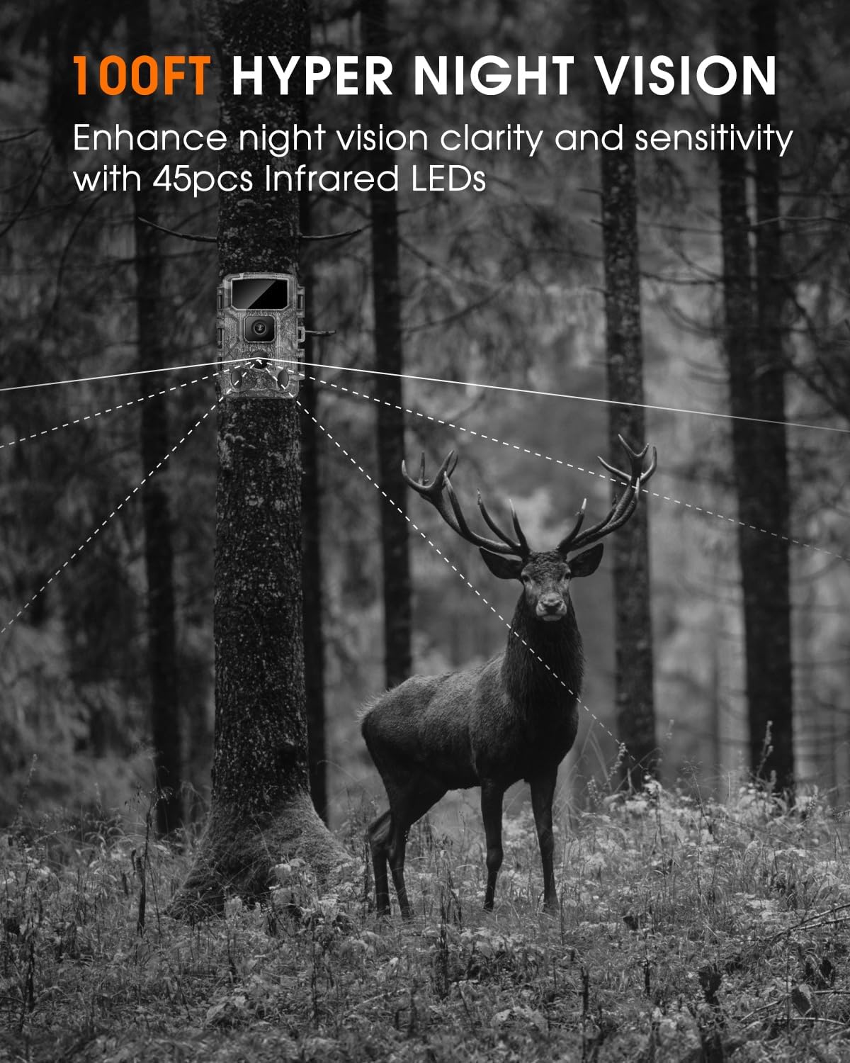 【45pcs Night Vision LEDs】Punvoe trail camera features 45pcs 940nm No-Glow LEDs, ensuring discreet operation. Its adaptive illumination technology prevents overexposure or dim lighting, delivering clear night vision up to 100 feet.