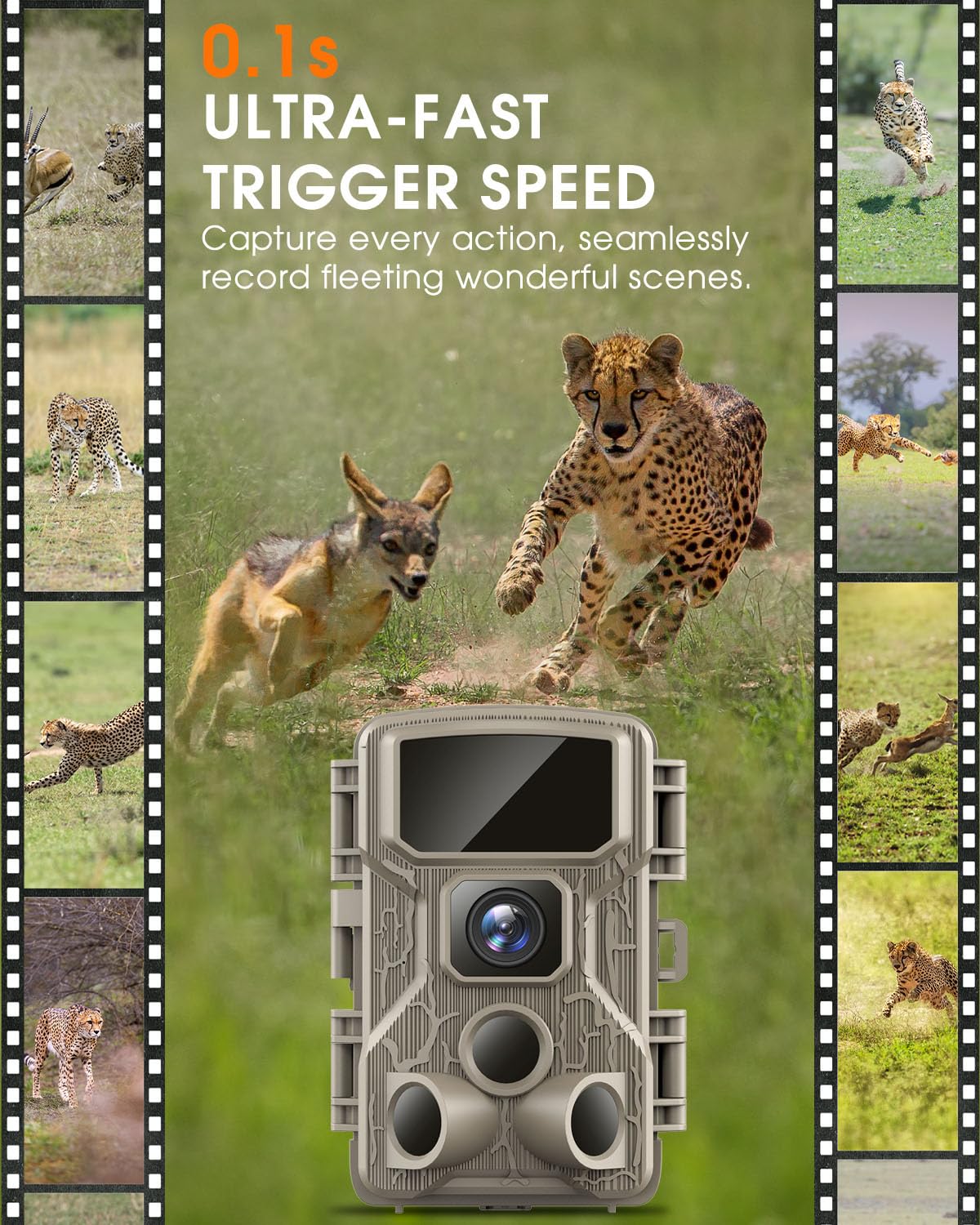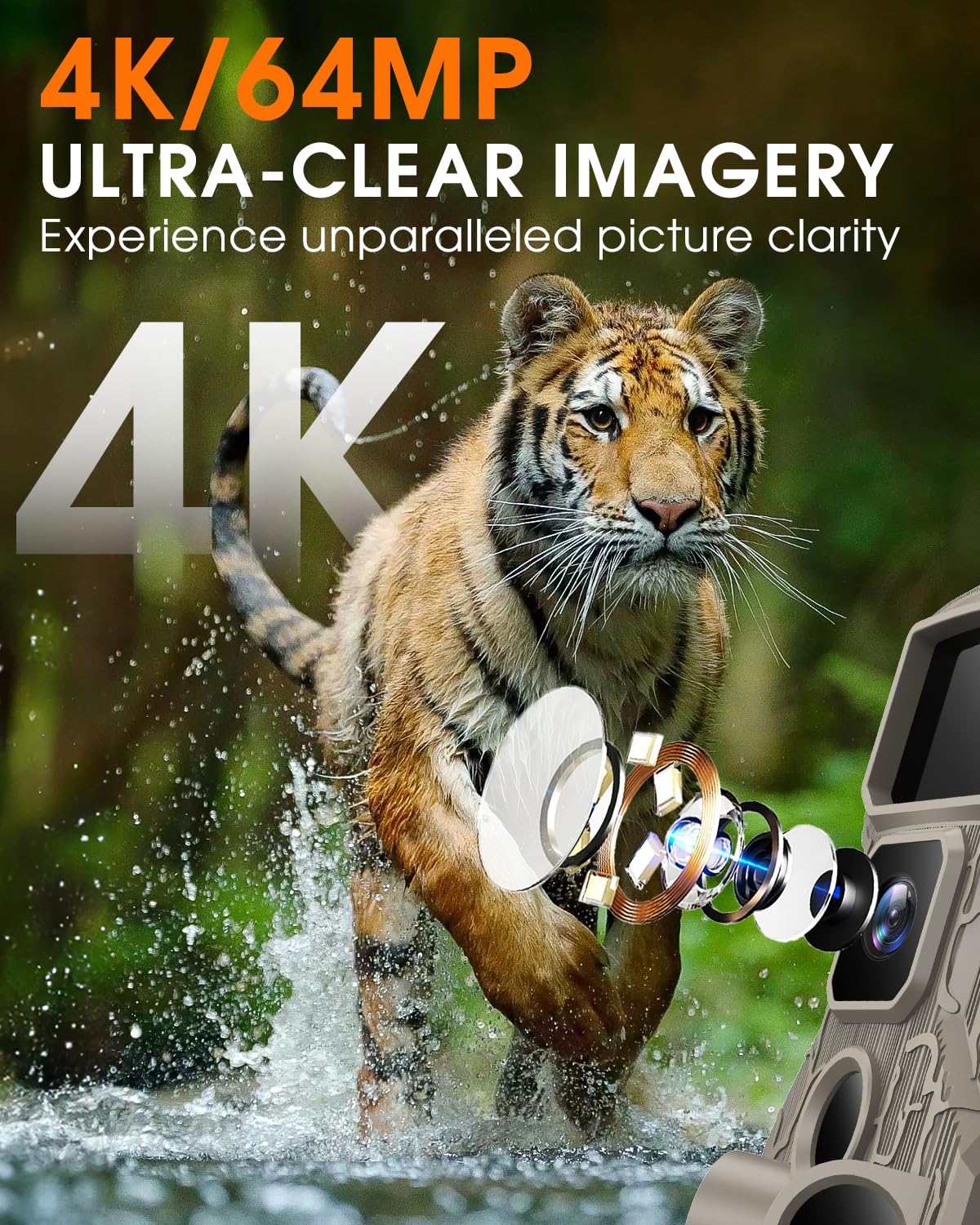 【4K Video & 64MP Still Image】Detailed wildlife capture, punvoe trail camera offers 64MP photo resolution and UHD 4K video recording with audio, providing clear and natural footage of every moment.