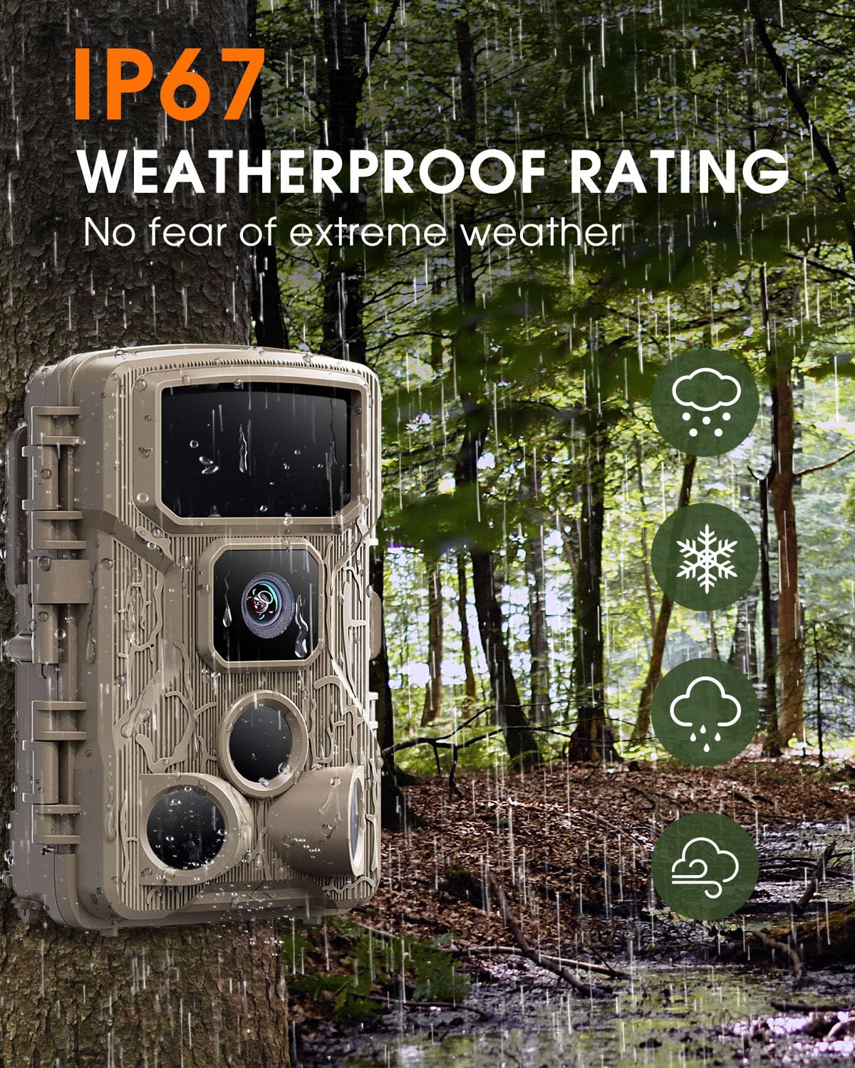 【IP67 Waterproof& Instant Shot Activation 】Punvoe wildlife camera adopts a bottom-opening battery compartment with an IP67 waterproof rating to prevent rain intrusion. Enjoy features such as timestamp, custom monitoring period, password protection, loop recording, etc. for enhanced functionality and security.The flexible activation technology of this WiFi trail cameras ensures that every dynamic moment of wildlife can be accurately captured, whether it is day or night. In addition, its waterproof function ensures reliable operation in any weather conditions.